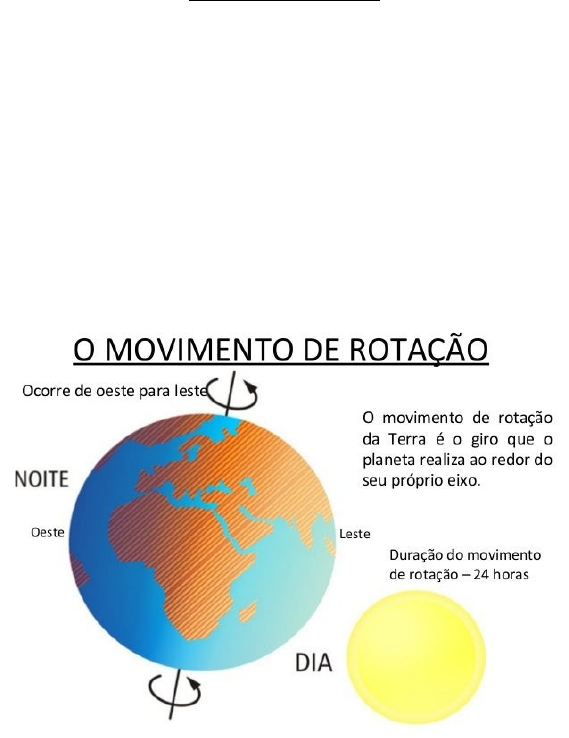 A Terra não para A Terra realiza movimentos responsáveis pela manutenção da vida e da dinâmica da natureza em nosso planeta. Vamos estudar, a seguir, os movimentos de rotação e de translação da Terra. Movimento de rotação A sucessão dos dias e das noites em nosso planeta ocorre em razão de um dos movimentos que a Terra realiza. Nesse movimento, conhecido por rotação, a Terra gira ao redor de si mesma em relação a um eixo imaginário, inclinado a 23 graus, que atravessa seu centro de polo a polo, como representa a imagem ao final desta página. A rotação ocorre de oeste para leste e leva, aproximadamente, um dia (24 horas) para dar uma volta completa. Em decorrência desse movimento, a incidência dos raios solares sobre uma porção do globo modifica-se gradativamente à medida que a Terra gira. Desse modo, enquanto uma de suas faces encontra-se amplamente iluminada pelo Sol, caracterizando o dia, em outra não há iluminação solar, o que caracteriza a noite. Movimento de translação A Terra também se move ao redor do Sol, realizando o movimento de translação. Esse movimento leva, aproximadamente, um ano (365 dias, cinco horas e 48 minutos) para ser completado. Ao longo desse percurso, em razão da órbita elíptica que percorre e da inclinação de seu eixo de rotação, algumas regiões do planeta recebem quantidades diferentes de radiação solar em determinados períodos do ano. Essa distribuição desigual da radiação resulta em quatro estações do ano: primavera, verão, outono e inverno. As estações do ano ocorrem de maneira oposta nos hemisférios Norte e Sul, por causa da quantidade diferenciada de radiação solar que recebem. Por isso, enquanto é inverno no Hemisfério Norte, é verão no Hemisfério Sul. Zonas térmicas da Terra A inclinação do eixo de rotação da Terra e sua forma arredondada são características que contribuem para que os raios solares incidam de maneira desigual em cada parte do globo. Dessa forma, ocorre uma distribuição diferenciada de energia do Sol em nosso planeta.Assim, em nosso planeta é possível identificar diferentes zonas térmicas, que se caracterizam de acordo com a distribuição da radiação solar sobre sua superfície. As zonas térmicas da Terra são: zona tropical ou intertropical, zona temperada do norte, zona temperada do sul, zona polar norte e zona polar sul. As zonas térmicas da Terra estão representadas no esquema a seguir. Zonas polares: a incidência dos raios solares que atingem essas zonas ocorre de maneira bastante inclinada e com pouca intensidade. Nessas regiões, o frio é intenso e contínuo ao longo do ano. Zonas temperadas: nessas regiões, os raios solares atingem a superfície terrestre com certa inclinação. Assim, ocorre um equilíbrio entre os dias quentes e os dias frios. Zonas tropicais(intertropicais): nessas regiões, os raios solares incidem sobre a superfície do planeta praticamente sem inclinação. Em razão dessa incidência concentrada, as regiões tropicais apresentam temperaturas altas e constantes durante o ano todo. Solstícios e equinócios Os solstícios marcam o início do verão e o do inverno nos hemisférios Norte e Sul da Terra. Eles acontecem em dois dias do ano, nos quais os raios solares incidem com intensidades diferentes em cada hemisfério, ou seja, incidência máxima em um e incidência mínima em outro. Nessas ocasiões, os dias e as noites no planeta têm durações diferentes. Os equinócios marcam o início da primavera e o do outono nos hemisférios Norte e Sul da Terra. Nesse período, os hemisférios recebem a mesma quantidade de luz e calor do Sol, pois os raios solares incidem perpendicularmente sobre a linha do equador. Além disso, durante o equinócio, o dia e a noite em nosso planeta têm, praticamente, a mesma duração. Equinócio de 21 de março A partir dessa data, os hemisférios Norte e Sul da Terra recebem quantidades semelhantes de radiação solar. É quando se iniciam a primavera no Hemisfério Norte e o outono no Hemisfério Sul. Solstício de 21 de junho Início do inverno no Hemisfério Sul e do verão no Hemisfério Norte. A posição da Terra nesse dia permite maior incidência dos raios solares sobre o Trópico de Câncer. Equinócio de 23 de setembro Nessa data, iniciam-se o outono no Hemisfério Norte e a primavera no Hemisfério Sul. A partir de então, os hemisférios Norte e Sul passam a receber quantidades semelhantes de radiação solar. Solstício de 21 de dezembro Início do verão no Hemisfério Sul e do inverno no Hemisfério Norte. A posição da Terra nesse dia propicia maior incidência dos raios solares na região do Trópico de Capricórnio. A. A Terra não para A Terra realiza movimentos responsáveis pela manutenção da vida e da dinâmica da natureza em nosso planeta. Vamos estudar, a segu ir, os movimentos de rotação e de translação da Terra. Movimento de rotação A sucessão dos dias e das noites em nosso planeta ocorre em razão de um dos movimentos que a Terra realiza. Nesse movimento, conhecido por rotação, a Terra gira ao redor de si mesm a em relação a um eixo imaginário, inclinado a 23 graus, que atravessa seu centro de polo a polo, como representa a imagem ao final desta página. A rotação ocorre de oeste para leste e leva, aproximadamente, um dia (24 horas) para dar uma volta completa. E m decorrência desse movimento, a incidência dos raios solares sobre uma porção do globo modifica - se gradativamente à medida que a Terra gira. Desse modo, enquanto uma de suas faces encontra - se amplamente iluminada pelo Sol, caracterizando o dia, em outra n ão há iluminação solar, o que caracteriza a noite. Movimento de translação A Terra também se move ao redor do Sol, realizando o movimento de translação. Esse movimento leva, aproximadamente, um ano (365 dias, cinco horas e 48 minutos) para ser completado. Ao longo desse percurso, em razão da órbita elíptica que percorre 