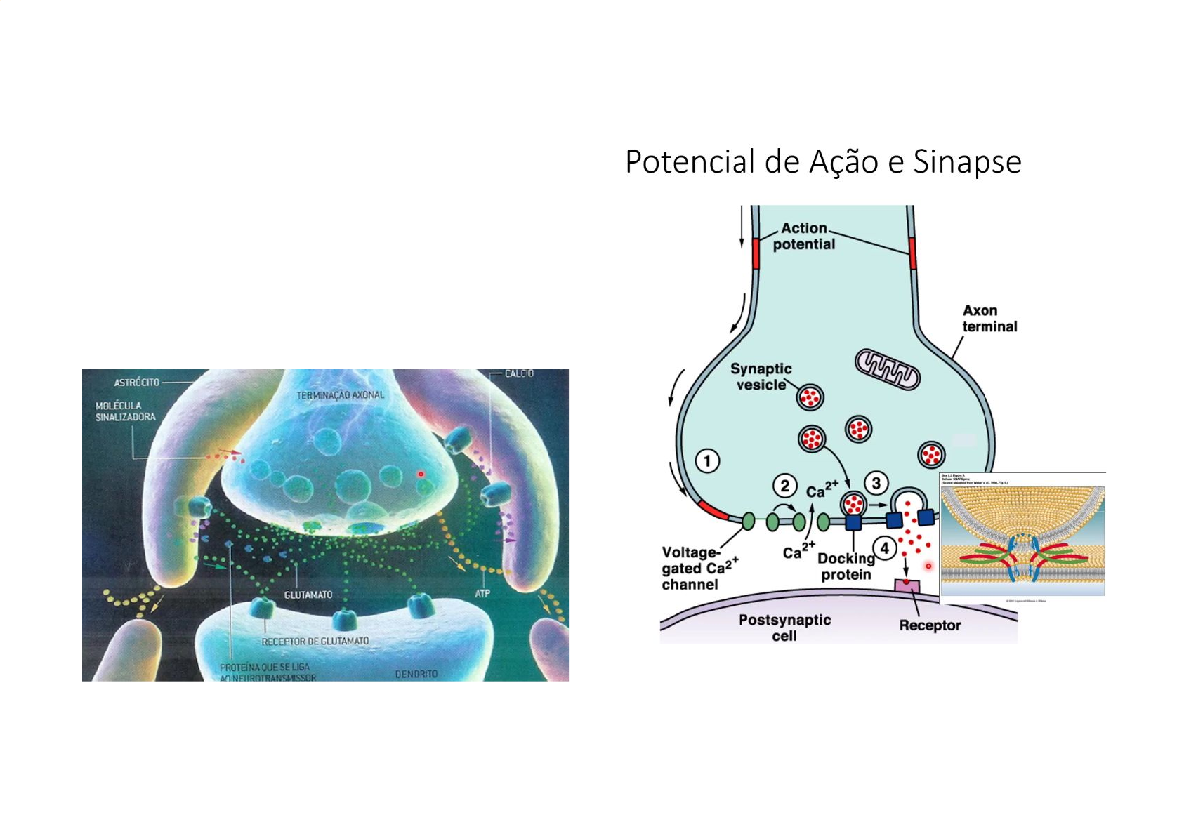 AULA 3 DE FISIOLOGIA - MÓDULO DE NEUROFISIOLOGIA - SINAPSES E NEUROTRANSMISSORES A- SINAPSE E NEUROTRANSMISSORES Abaixo, observa-se os componentes de uma sinapse química. O botão terminal do axônio do neurônio 1 tem uma série de vesículas sinápticas repletas de neurotransmisores. Há a fenda fenda sináptica, espaço entre os dois neurônios. E abaixo há o neurônio 2 com os receptores pós-sináptico para o neurotransmissor liberado, que pode ou não gerar potencial de ação de acordo com a interação entre os neurotransmissores e os seus receptores. As células da glia, como os astrócitos, têm um papel muito fundamental nas sinapses. Tanto que o conceito moderno de sinapse inclui o terminal do axônio 1, a membrana pós-sináptica do neurônio 2 e as células da glia. Estas células têm como uma das funções a captação de neurotransmissores em excesso, além de participação na síntese de neurotransmissores e neuromoduladores. Na imagem acima, observa-se um potencial de ação chegando a porção terminal, de modo que nas regiões vermelhas há propagação da onda de potencial de ação (inversão de polaridade com entrada de sódio), que promove a abertura de canais de cálcio voltagem dependentes. A entrada de cálcio mobiliza as vesículas pré-sinápticas, participando do ancoramento da membrana destas vesículas à membrana pré-sináptica, promovendo a liberação do neurotransmissor, que interage com seu receptor específico na membrana pós-sináptica. Alguns destinos do neurotransmissor após sua liberação: (a) alterações de voltagem na membrana pós-sináptica após interagir com o receptor específico; (b) cair na corrente sanguínea, servindo como neuro-hormônio; (c) degradação por alguma enzima (ex. acetilcolina degradada pela acetilcolinesterase, que está presente nas fendas sinápticas; (d) ser captado pelas células da glia quando em excesso; (e) sofrer receptação pelo neurônio 1, podendo ser ressintetizado ou armazenado em vesículas sinápticas para nova liberação. B- RECEPTORES PÓS-SINÁPTICOS: OS IONOTRÓPICOS E OS METABOTRÓPICOS No caso dos receptores ionotrópicos, o neurotransmissor interage com seu receptor específico-seletivo no próprio canal iônico, possibilitando a abertura do canal. Se for um canal que permite entrada de carga positiva, como íons sódio, haverá um fluxo de cargas positivas gerador de despolarização. Se for um canal que permite entrada de carga negativa, como íons cloreto, haverá um fluxo de cargas negativas gerador de hiperpolarização (célula mais negativa). Cada molécula de neurotransmissor interage diretamente com o receptor para promover a abertura do canal. No caso dos receptores metabotrópicos, há um receptor para o neurotransmissor que não está no canal iônico, de modo que a interação do neurotransmissor com o receptor promove uma série de segundos mensageiros, como o cAMP, que promovem a abertura ou fechamento do canal iônico. Ação mais modulada. Diferenças: 1- receptores ionotrópicos apresentam uma transmissão mais rápida, já que a interação molécula-receptor desencadeia diretamente a despolarização ou polarização. 2- cada ação dos receptores metabotrópicos é amplificada pela geração de centenas de segundos mensageiros, ativando centenas de canais iônicos. 3- os segundos mensageiros também podem mudar a fisiologia da célula ao atuar no núcleo celular e mudar os processos de transcrição e tradução. Acima, como exemplo, há um receptor beta da adrenalina e da noradrenalina, que interage com esta última, ativando a proteína G, que ativa a enzima adenilciclase, que transforma ATP em cAMP, um segundo mensageiro que ativa outras moléculas ativadoras de canais iônicos, como as proteínas quinases. Um processo indireto e mais demorado. Acima, resumo das ações dos neurotransmissores nos seus neurotransmissores e as possíveis consequências intracelulares. Um neurotransmissor liberado na fenda sináptica pode interagir ou com receptores ionotrópicos ou metabotrópicos. Quando a interação ocorre no receptor ionotrópico, há sempre uma abertura de canal, que dependendo do íon, gera um potencial excitatório pós-sináptico (despolarização - entrada de sódio) ou potencial inibitório pós-sináptico (hiperpolarização - saída de potássio ou entrada de cloreto). Quando o neurotransmissor interage com o receptor metabotrópico, uma cascata de segundos mensageiros podem fazer: (a) abrir os canais iônicos (o mesmo cenário de receptores ionotrópicos); ou (b) fechamento de canais que estavam abertos. O fechamento dos canais que deixavam entrar sódio gera hiperpolarização (potencial inibitório pós-sináptico), já o fechamento dos canais que deixavam sair potássio gera despolarização (potencial excitatório pós-sináptico). C- CONCEITO DE AGONISMO E ANTAGONISMO FARMACOLÓGICO Agonista direto: uma droga que, devido a semelhança química, promove o mesmo efeito que o neurotransmissor ao ligar-se diretamente ao seu sítio de ligação (potencialização da neurotransmissão). Antagonista direto: uma substância parecida com o neurotransmissor, mas não o suficiente para ativá-lo, impede a interação da molécula ao ligar-se diretamente ao sítio de ligação do neurotransmissor (relação direta de competição). Agonista indireto: uma droga que potencializa a ligação do neurotransmissor com seu receptor ao ligar-se ao sítio neuromodulador (ex. a droga muda a conformação do canal, tornando o receptor mais alcançável ao neurotransmissor). Antagonista indireto: uma droga que age em um sítio de modulação, mudando a estrutura conformacional do canal, dificultando a neurotransmissão. D- NEUROTRANSMISSORES Uma molécula atua como neurotransmissor clássico se: D - PARTE 1- acetilcolina, primeiro neurotransmissor descrito, possibilitou compreender que uma informação elétrica pode ser transmitida através de sinais químicos. Umas de 