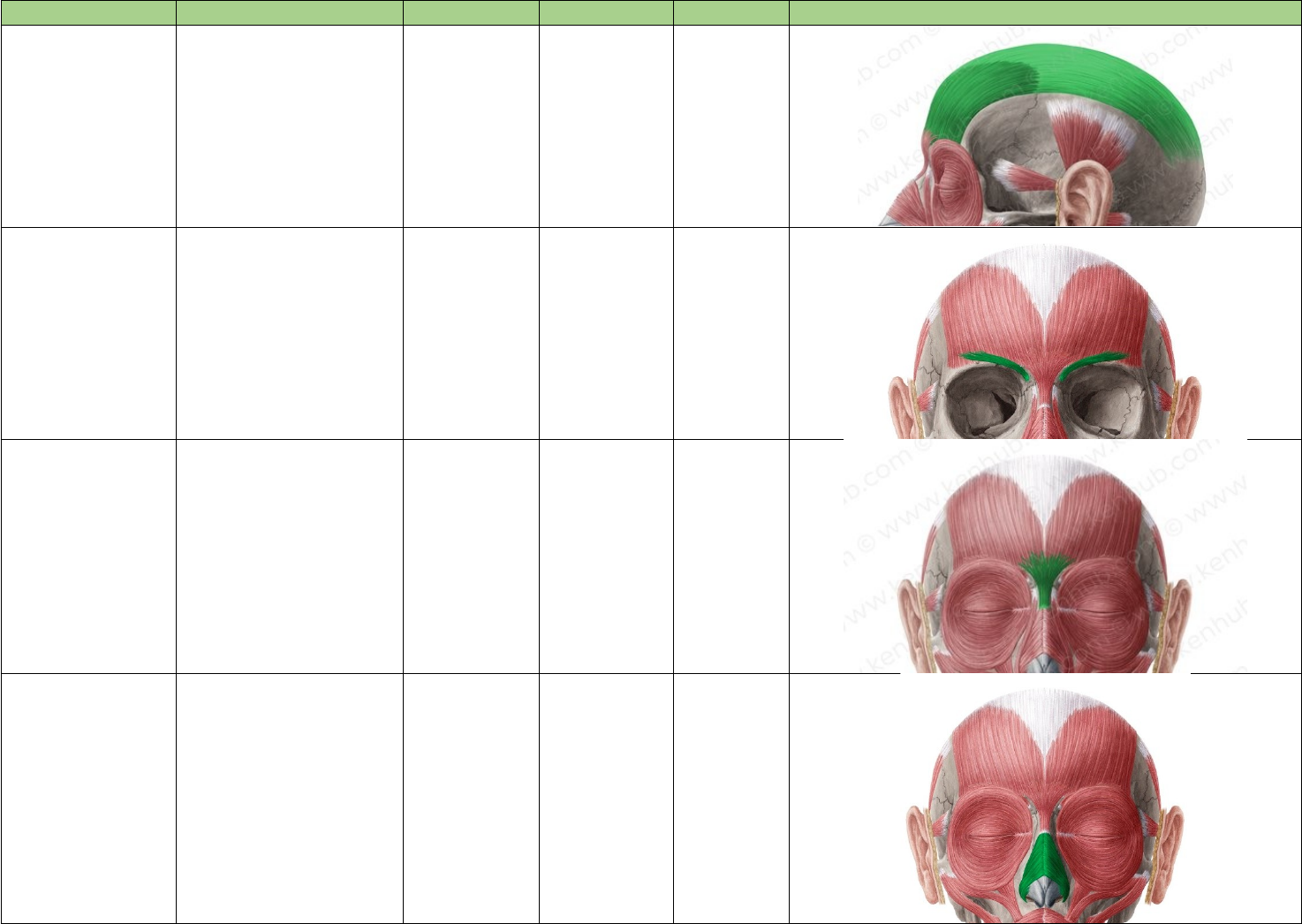 Músculo Origem Inserção Ação Inervação Imagem Occipitofrontal Linha nucal superior e pele do supercílio e da glabela Aponeurose epicraniana Movimenta o escalpo Facial Corrugador do supercílio Parte nasal do osso frontal Aponeurose epicraniana Abaixa a pele da fronte e supercílios Facial Prócero Osso e cartilagem nasal Pele da glabela Abaixa a pele da fronte e supercílios Facial Nasal Eminências alveolares incisivos e caninos Cartilagem nasal e asa do nariz Movimenta a asa do nariz Facial Orbicular do olho Processo Frontal do osso maxilar, ligamento palpebral medial, crista lacrimal, saco lacrimal e parte nasal do frontal Pele da margem orbital Fecha as pálpebras e movimenta os supercílios. Facial Músculo da asa do nariz Processo frontal do osso maxilar Cartilagem alar maior Alargamento das narinas. Facial Bucinador Rafe pteregomandibular e processo alveolares da mandíbula e maxila Lábio superior e inferior e ângulo da boca Indispensável para o aumento da pressão na boca, como soprar e mastigar. Facial Zigomático Maior Face Lateral do zigomático Lábio superior e ângulo da boca Movimenta os lábios, asas do nariz, Bochechas, ângulo da boca e pele do mento. Facial Zigomático Menor Face anterior do zigomático Lábio superior e ângulo da boca Movimenta os lábios, asas do nariz, bochechas, ângulo da boca e pele do mento Facial Levantador do lábio superior Margem infraorbital, processo zigomático da maxila e músculo orbicular do olho Lábio superior Movimenta os lábios, asas do nariz, bochechas, ângulo da boca e pele do mento Facial Levantador do ângulo da boca Fossa canina Ângulo da boca Movimenta os lábios, asas do nariz, bochechas, ângulo da boca e pele do mento Facial Risório Fáscia parotídeomassetérica Ângulo da boca Movimenta os lábios, asas do nariz, bochechas, ângulo da boca e pele do mento Facial Orbicular da boca Laterais do ângulo da boca Componente principal dos lábios Movimenta os lábios, asas do nariz, bochechas, ângulo da boca e pele do mento Facial Abaixador do lábio inferior Medial da mandíbula abaixo do forame mentual Lábio inferior e protuberância mentual Movimenta os lábios, asas do nariz, bochechas, ângulo da boca e pele do mento Facial Abaixador do ângulo da boca Base da mandíbula, abaixo do forame mentual Lábios inferior e superior, bochecha e ângulo da boca Movimenta os lábios, asas do nariz, bochechas, ângulo da boca e pele do mento o Facial Mentual Eminências alveolares do incisivo lateral inferior Pele do mento Movimenta os lábios, asas do nariz, bochechas, ângulo da boca e pele do mento Facial Platisma Base da mandíbula e fáscia parotídea Pele abaixo da clavícula e fáscia peitoral Estica a pele do pescoço Facial Genioglosso Espinhas genianas Aponeurose lingual Empurra a língua para frente, deslocamento da língua para baixo e movimenta a ponta da língua Hipoglosso Longitudinais superior e inferior Ápice da língua Raíz da língua Alteram a forma da língua Hipoglosso Transverso Septo da língua Margem lateral Alteram a forma da língua Hipoglosso Verticais Raiz lingual Aponeurose lingual Alteram a forma da língua Hipoglosso Temporal Abaixo da linha temporal inferior e fáscia temporal Processo coronóide Elevação da mandíbula e retração da mandíbula Temporais profundo Masseter Parte superficial: dois terços anteriores do arco zigomático e parte profunda: face inferior do arco zigomático Parte superficial: tuberosidade massetérica e parte profunda: margem inferior da mandíbula Elevação da mandíbula (com potência) Massetérico Pterigóideo Medial Fossa pterigóidea e processo piramidal do palatino Margem inferior da mandíbula Elevação da mandíbula Pterigóideo Medial Pterigóideo Lateral Cabeça superior: processo pterigóideo e tuberosidade da maxila e Cabeça inferior: face temporal da asa maior do esfenóide Cabeça superior: disco e capsula da ATM e cabeça inferior: fóvea pterigoidea do processo condilar da mandíbula Protusão da mandíbula Pterigóideo Lateral Esternocleidomastóideo Cabeça esternal: manúbrio do esterno e corpo clavicular: porção média da clavícula Processo mastóide e metade lateral da linha nucal superior Contração unilateral: flexão lateral da cabeça, rotação para o lado oposto e contração bilateral: elevação da cabeça, flexão do pescoço em direção ao tórax Outros: auxilia na inspiração Acessório Digástrico Incisura mastóidea e fossa digástrica da mandíbula Hióide Elevar o hióide durante a deglutição e ajudar a manter a boca aberta Nervo milo-hióideo e ramo digástrico Estilo-hióideo Processo estilóide Hióide Elevar o hióide durante a deglutição e ajudar a manter a boca aberta Ramo estilo-hióideo do nervo facial Milo-hióideo Linha milo-hióidea Rafe milo-hióidea e hióide Formar o diafragma oral e elevar o assoalho da boca Nervo milo-hióideo Gênio-hióideo Espinha geniana Hióide Mover o hióide anteriormente, auxiliar na abertura e nos movimentos laterais da mandíbula Plexo cervical Esterno-hióideo Manúbrio do esterno e articulação esternoclavicular Hióide Abaixar o hióide Alça cervical Esterno-tireóideo Manúbrio do esterno Cartilagem tireóidea Abaixar a laringe Alça cervical Tireo-hióideo Cartilagem tireóidea Hióide Abaixar hióideo e elevar a laringe Alça cervical Omo-hióideo Margem superior da escápula e tendão intermédio Hióide e tendão intermédio Abaixar o hióide Alça cervical Cabeça do núcleo caudado Corpo do núcleo caudado Cauda do núcleo caudado Núcleo Lentiforme Globo Pálido Putâme Globo Pálido + Putâme= Núcleo Lentiforme Núcleo Caudado + Núcleo Lentiforme Corpo Estriado