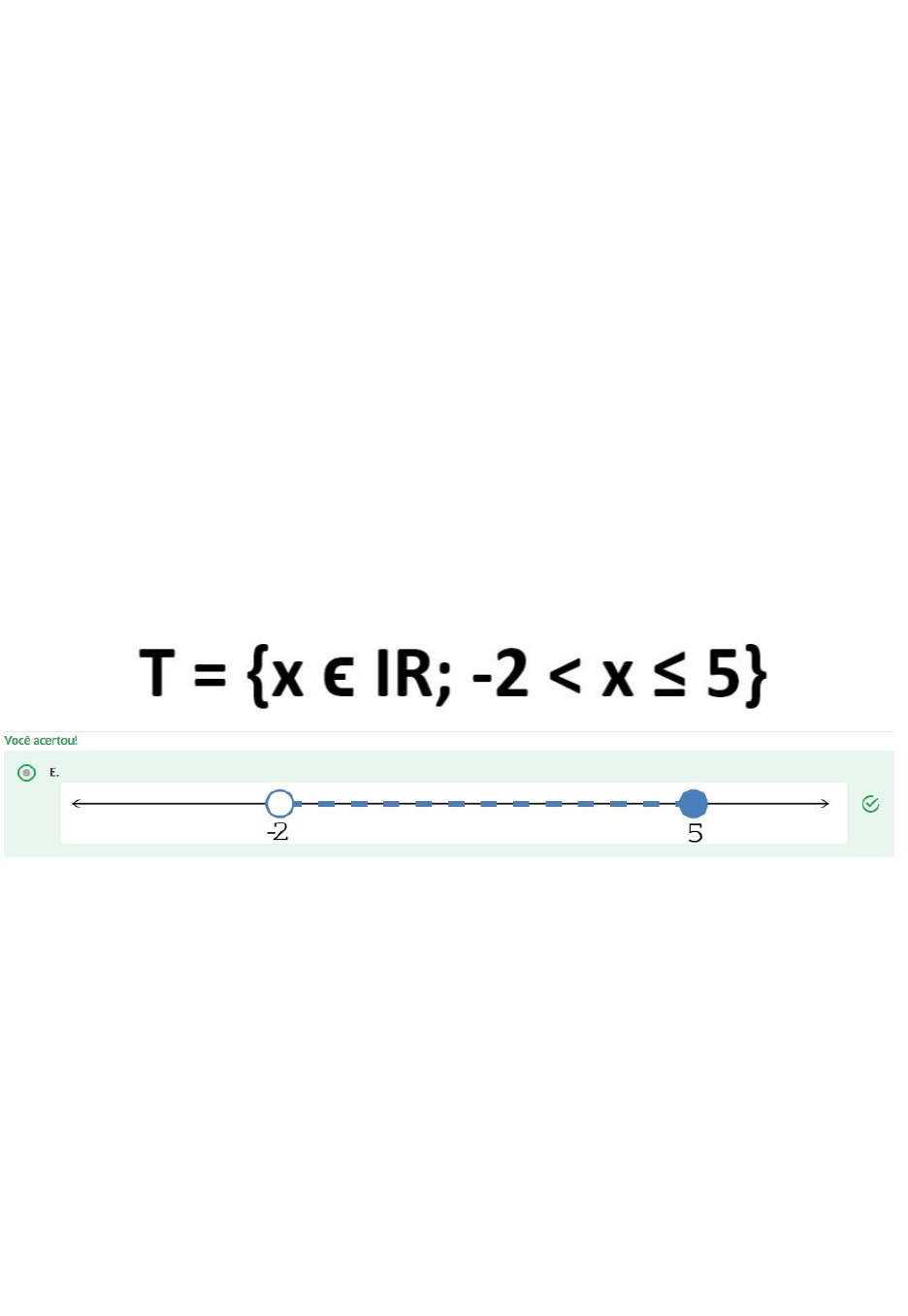 1. Os subconjuntos dos números reais podem ser representados por meio de intervalos. Após essa representação, é possível realizar operações com esses intervalos, como, por exemplo, a união e a interseção. Considere os conjuntos expressos por intervalos numéricos: A = ]1, 5[ e B = [3,7]. Determine o conjunto A U B. Você acertou! A. A U B = ]1,7]. 2. Na matemática, é preciso estar atento às notações, para que possa interpretar corretamente um problema. Os símbolos <, >, ³, £ e ¹ são utilizados para representar desigualdades e são lidos, respectivamente como: menor, maior, maior ou igual, menor ou igual, e diferente. Nesse contexto, marque a opção que apresenta uma desigualdade representada corretamente. Você acertou! D. 3 está à esquerda de 8 na reta real. 3. Os intervalos numéricos são subconjuntos dos números reais e podem ser representados na reta numérica por conjuntos ou por meio da notação específica de intervalos. Considere o intervalo real: 4. Em operações com números reais (R), a prioridade continua sendo da expressão que está entre parênteses; após, da que está entre colchetes; por fim, daquela expressão que se encontra dentro das chaves. Segue, também, a ordem prioritária de operações — primeiramente, a multiplicação e a divisão e, depois, a adição e a subtração. Com base no exposto, marque a alternativa que apresenta a solução correta da operação: (-2)(+4) (3 -1)2 + 11: Você acertou! B. -21. 5. Em operações com números reais (R), a prioridade continua sendo da expressão que está entre parênteses; após, da que está entre colchetes; por fim, daquela expressão que se encontra dentro das chaves. Segue, também, a ordem prioritária de operações — primeiramente, a multiplicação e a divisão e, depois, a adição e a subtração. Com base no exposto, marque a alternativa que apresenta a solução correta da expressão numérica (– 4 + 3)2 ÷ 1/5 - 2. Você acertou! E. 3.