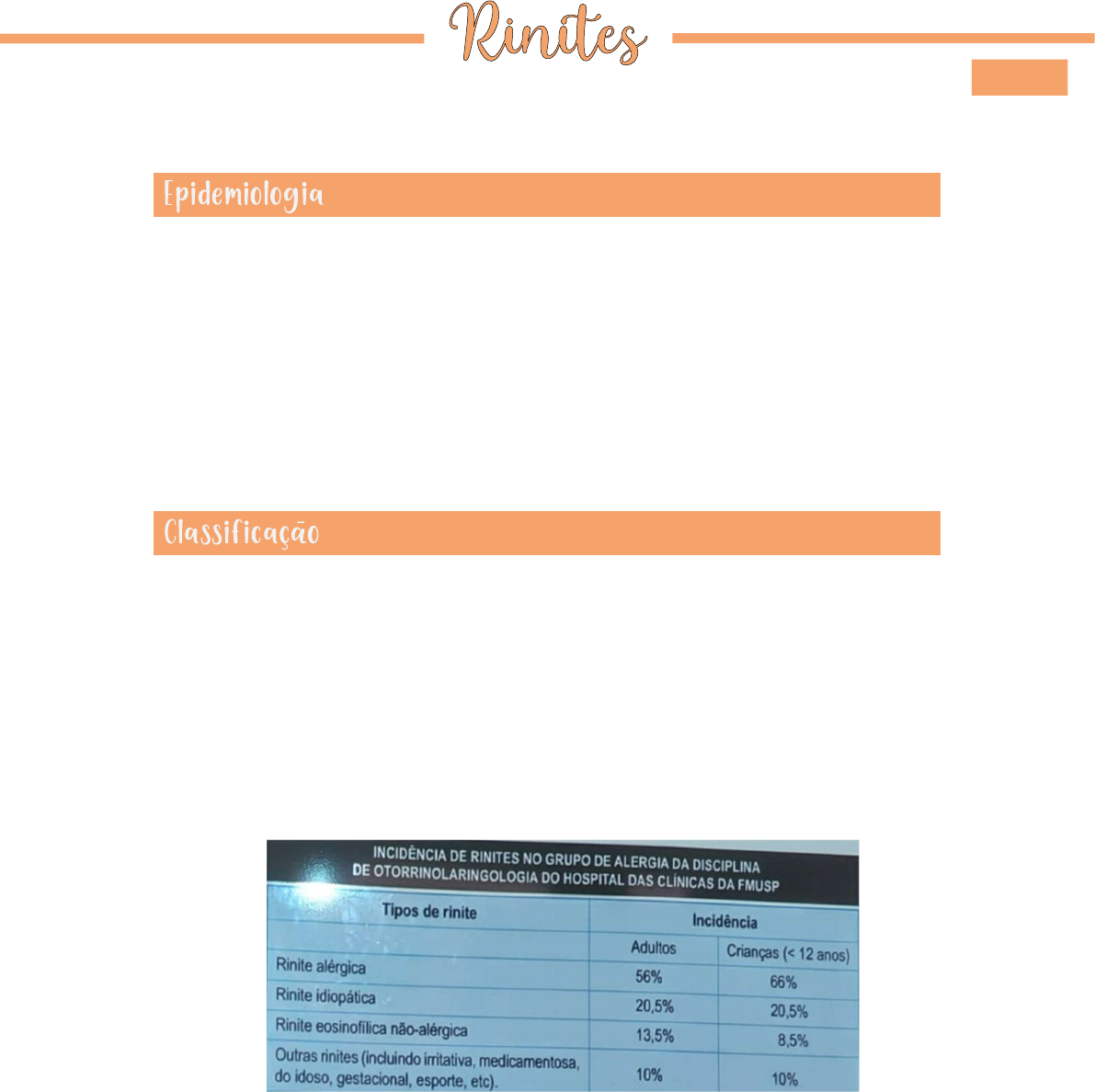 - Apesar de não ser uma doença que traz mortalidade, ela traz alta morbidade, como um grande impacto econômico e o absenteísmo (diminuição da produção tanto escolar quanto laboral). - Acomete de 20 a 30% da população adulta e de 20 a 40% da população infantil. - Regiões úmidas são bastante propícias para o desenvolvimento de rinites alérgicas. - Rinite Alérgica (é a mais frequente, os pacientes entram em contato com o antígeno e começam a apresentar os sintomas em cerca de 20 a 30 minutos após o contato). - Rinite Não Alérgica. - Rinite Atrófica. - Muitas vezes, a rinite alérgica pode estar associada a um quadro de rinite idiopática, gerando uma rinite mista. A rinite idiopática é aquela que aparece os sintomas (coriza, espirros) quando há uma mudança de clima, quando se pega o vento frio do ar- condicionado, sem necessariamente ter tido contato com antígenos... Na rinite eosinofílica não-alérgica haverá uma eosinofilia na mucosa nasal, sendo mediada pelos eosinófilos. Giovanna Lopes Também há outros tipos de rinites, como a medicamentosa (por abuso de vasoconstritor, por exemplo) e a por contato de substâncias químicas (como pela cocaína, por exemplo). - É uma doença inflamatória da mucosa nasal mediada por IgE (esses pacientes terão a IgE aumentada, exceto os pacientes que possuem rinite alérgica local – um tipo muito específico). Assim, se há dúvidas se é uma rinite alérgica ou idiopática, o médico pode solicitar a dosagem de IgE total. - Como nesses casos a IgE total sobe, a IgG tende a abaixar, por isso os pacientes alérgicos possuem mais tendência à infecções recorrente da via aérea (como otite serosa, otite média aguda -> nos quadros otológicos, sempre é importante lembrar de tratar o nariz, pois a tuba auditiva fica nessa região...). - É uma Reação de Hipersensibilidade Tipo I: O paciente com rinite alérgica tem mais chance de ter outras alergias associadas, como alergia medicamentosa (geralmente à penicilinas), dermatites, asma... - É a maioria dos casos, chega até 70% dos casos, e é mais comum em crianças, adolescentes e adultos jovens (porque ela tende a melhorar as crises com o passar dos anos do paciente). - Como a rinite é uma doença de caráter genético, um dos pontos importantes é a avaliação do histórico familiar, como um dos pais alérgicos ou os dois pais alérgicos (nesse caso, a criança tem uma chance altíssima de ser alérgica também). Quando o irmão mais velho é alérgico, a segunda criança já tem um certo fator de proteção quando nasce, pois os pais já tomaram várias medidas de controle para evitar o contato com os antígenos, então a segunda criança não terá tanta sensibilização com os antígenos. - A rinite é o resultado de uma hiper-ação do sistema imune, assim, há mais hiper-atividade na criança que vai melhorando ao longo do tempo, mas algumas crianças viram adultos com rinite e asma com sintomas bem importantes ainda. - Principais sintomas: o Obstrução nasal. o Espirros. o Rinorreia (geralmente aquosa). o Prurido nasal. o Prurido ocular (fica vermelho e com edema, atrapalha bastante a vida social, trabalho, escola...). o Tosse seca. - Fisiopatologia: o Hipersensibilidade mediada por IgE a alérgenos específicos. o Reação do tipo I de Gell e Coombs: Geneticamente predisposto e sensibilizado (o paciente tem o contato com o antígeno e, no primeiro momento pode não ter sintomas ou ter sintomas leves, mas no segundo momento ocorre a reação mastocitária já estabelecida, apresentando os sintomas mais fortes). Reação Mastocitária: prurido, espirros, rinorreia, obstrução nasal. Principais alérgenos: ácaros (poeira domiciliar), fungos (principalmente o Aspergillus), epitélios (animais de estimação), pólens... No primeiro momento, temos a fase de Sensibilização, o antígeno (em vermelho) irá ser apresentado para o linfócito T e o linfócito B irá produzir a IgE. Em cada fase dessa terá os mediadores. Na fase de Sensibilização, teremos as IL-4 e IL-13, e na Resposta Tardia teremos a IL-3, IL-5 e do GM-CSF (fator estimulador de colônias de granulócitos-macrófagos). O IgE produzido irá se acoplar na superfície do mastócito. Em um segundo momento (após a sensibilização do paciente) que o paciente tiver contato com o antígeno, ele irá entrar em contato com o IgE, onde teremos um estímulo do linfócito B através das IL-4, 6 e 13, e depois entra o estímulo do mastócito para o eosinófilo na fase tardia com as IL-3 e 5. Quando o IgE se acopla na superfície e degranula o mastócito e libera várias substâncias, principalmente a histamina, mas também libera leucotrienos e prostaglandinas. É nessa liberação que começa os sintomas (coriza, espirro, prurido...). Na fase da Resposta Imediata, se o paciente persistir e não tomar o medicamento e a crise não parar, ele entrará na fase de Resposta Tardia, com uma inflamação mais persistente, com edema da mucosa nasal, e a persistência do eosinófilo (é a célula que mantém a Resposta Inflamatória Tardia da rinite alérgica). Deve-se tomar o anti-histamínico na fase da Resposta Imediata (na fase da Resposta Tardia não adianta tomar só o anti- histamínico, principalmente se ele não for de 3ª geração com o fator anti- PAF mais importante). Na fase da Resposta Tardia, deve-se tomar o corticoide. - Fase Imediata: o Ocorre de 10 a 30 minutos do contato com o antígeno. o Histamina (principal mediador), triptase, protease. o Prurido, obstrução nasal, rinorreia, espirros (em quadros virais podemos encontrar esses mesmos sintomas, além de febre, cefaleia, dor de garganta, menos o prurido. Às vezes, o paciente é tão alérgico que o paciente pega o vírus e ele desencadeia toda a resposta inflamatória do alérgico e faz persistir por mais tempo). - Fase Tardia: o Ocorre quando não se toma o medicamento na Fase Imediata e a inflamação e as crises persistem. o Ocorre a
