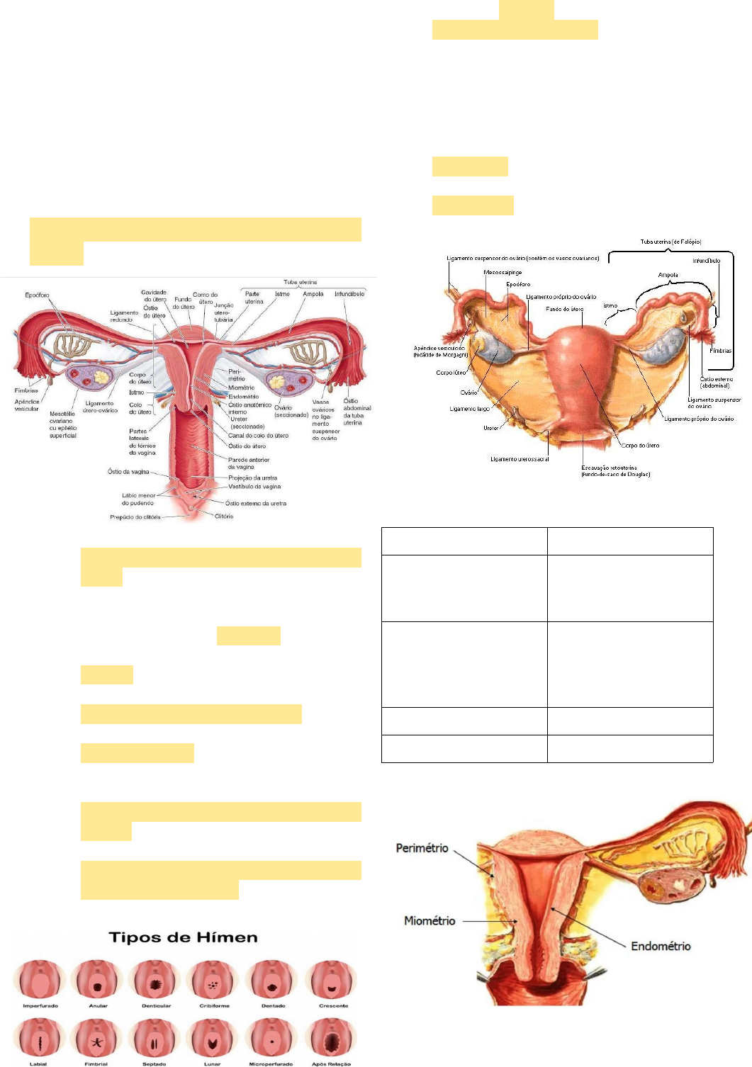 Anatomia e Fisiologia do Sistema Reprodutor Feminino Externamente: • Vulva (genitália externa). Internamente • Vagina; • Útero; • 2 tubas uterinas; • 2 ovários. Está localizado no interior da cavidade pélvica. Vulva: • Delimitada e protegida pelos grandes lábios, recobertos por pelos pubianos com função de esconder os lábios menores. • Pequenos lábios – protegem a abertura da uretra e o canal vaginal. • Clitóris (tecido esponjoso erétil) – homólogo ao pênis do homem. • Prepúcio do clitóris (clitoriano) – dobra de pele que envolve o clitóris. • Monte de vénus – localizado acima do prepúcio clitoriano, diminui o impacto durante a relação sexual. • Abertura da uretra/Óstio/Meato uretral externo – localizado entre os pequenos lábios, orifício de passagem da urina. • Hímen – membrana circular que protege a entrada da vagina, normalmente se rompe na primeira relação sexual. Anatomia e Fisiologia interna da vagina: • Canal de 8-10 cm. • Glândulas de Bartholin – localizadas em cada lado de sua abertura, secretam muco lubrificante. • Acomodação do pênis durante ato sexual. • Expulsão da menstruação e expulsão do bebê na hora do parto. • Localizado – anteriormente a bexiga e posteriormente ao reto. • Subdividido – fundo, corpo, istmo e cérvix (colo do útero). As camadas do útero, da mais interna para a mais externa, são as seguintes: Camada Descrição Endométrio Camada vascularizada, ciclo menstrual Miométrio Camada muscular, o útero consiste principalmente de tecido muscular liso Perimétrio Camada serosa Peritônio Envolve todo o útero Colo do útero: • Função – proteger o interior da cavidade pélvica de agentes patógenos, secretam muco e anticorpos, ativação de espermatozoides, durante a gravidez o colo do útero se fecha fortemente mantendo o feto no seu interior (alterações podem ocorrer o abortamento), modificações bioquímicas no estroma cervical para dilatação. Anatomia e Fisiologia interna das tubas uterinas: • 2 ductos com cerca de 10 cm, une ovário ao útero. • Células Ciliadas – batimentos dos cílios microscópicos e movimentos peristálticos impelem o gameta feminino até o útero. • Subdividida – parte uterina, istmo, ampola e infundíbulo. Anatomia e Fisiologia interna dos ovários: • Gônodas femininas – responsáveis pela produção dos gametas femininos – ovogênese. • Produzem estrógeno e progesterona – hormônios sexuais femininos.