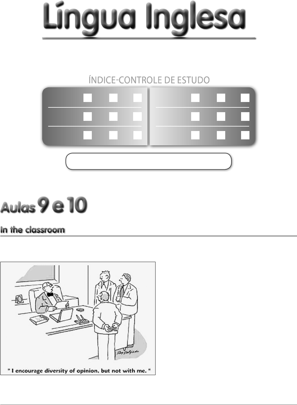 247LÍNGUA INGLESA TERCEIRÃO – 2 Te rc e ir ão – C ad e rn o 2 – C ó d ig o : 8 3 0 3 7 8 2 1 5 In the classroomIn the classroomIn the classroomIn the classroom Text 1 (UPE) © O ri g in al A rt is t R e p ro d u ct io n r ig h ts o b ta in ab le f ro m w w w .C ar to o n St o ck .c o m /U P E Disponível em: <www.cartoonstock.com/directory/D/Democracy.asp>. Acesso em: 15 out. 2012. TEXT COMPREHENSIONAulas Aulas 9 e 109 e 10 Língua InglesaLíngua Inglesa Professor: Aula 12 AD TM TC (pág. 251) Aula 13 AD TM TC (pág. 255) Aula 14 AD TM TC (pág. 255) Aula 9 AD TM TC (pág. 247) Aula 10 AD TM TC (pág. 247) Aula 11 AD TM TC (pág. 251) ÍNDICE-CONTROLE DE ESTUDO 8_TERC_2_ING_247a264.indd 247 11/4/14 5:25 PM 248TERCEIRÃO – 2 LÍNGUA INGLESA 1. De acordo com o cartum anterior: 1. o homem aceita a opinião dos outros, sem restrições. 2. a opinião dos três homens diverge da opinião do outro. 3. todos compartilham da mesma opinião. 4. não existe divergência entre os homens. 5. o homem aceita outras opiniões, desde que não seja contrariado. Somente está correto o que se afi rma em: a) 3 e 4. d) 2, 3 e 4. b) 2. e) 2 e 5. c) 4 e 5. Text 2 (Uninove-SP) Disponível em: <www.dilbert.com>. Acesso em: 16 nov. 2011. Glossary 1. to fi nd out: descobrir 2. manager: gerente 3. dumb: estúpida; idiota 4. to be done: terminar; estar acabado Baseando-se na tira anterior, assinale a alternativa correta. 1. Qual é o tom presente no desfecho da tirinha? a) Neutro. b) Parcial. c) Otimista. d) Argumentativo. ➜ e) Sarcástico. 2. Em “And we’re done”, pode-se concluir que: a) o gerente acabou de participar do estudo em questão. b) a pessoa entrevistada entendeu a proposta do entrevis- tador. c) ambos, patrão e empregado, conhecem-se muito bem. d) responder às questões não é compulsório. e) o entrevistador é mais esperto do que se pensa. Text 3 (UFSJ-MG) Cartoon 1 Cartoon 2 Disponível em: <www.funf uster.com>. Acesso em: 21 ago. 2010. Glossary 1. pet: animal de estimação 2. screensaver: protetor de tela ➜ ➜ © U n in o ve -S P © U FS J- M G © U FS J- M G H-6 H-8 H-5 H-8 8_TERC_2_ING_247a264.indd 2488_TERC_2_ING_247a264.indd 248 2/8/13 10:13 AM2/8/13 10:13 AM 249LÍNGUA INGLESA TERCEIRÃO – 2 Based on both cartoons, choose the correct alternative. 1. The boy’s question in Cartoon 1 shows that: a) some fi sh screensavers are sold in pet shops. b) he wants to buy pets, especially fi sh, for his dad. ➜ c) he thinks the pet shop windows are screensavers. d) fi shes and screensavers are out for sale in the shop. 2. In Cartoon 2, we can understand that: a) the police offi cer does not know how to speak English at all. ➜ b) the boy did not understand what the police offi cer was asking. c) the police offi cer wants to send e-mails to the boy’s parents. d) the police offi cer and the boy are using formal English. 3. Cartoons 1 and 2 have in common the understanding that modern kids: a) use computers so much that they mix real and virtual worlds. b) use computers to play games and never read or write. c) do not respect the adults anymore and are very demanding. d) use computers so much that they do not interact with people anymore. Text 4 (Unicamp-SP) 1 5 Some say the world will end in f re; Some say in ice. From what I've tasted1 of desire I hold2 with those who favor3 f re. But if it had to perish4 twice, I think I know enough of hate5 To say that for destruction Ice is also great And would suff ce6 Robert Frost (1874-1963) A pocket book of Robert Frost’s poems. New York: Washington Square Press, 1966. p. 242. Glossary 1. to taste(ed): provar; experimentar 2. to hold: manter-se; continuar 3. to favor(ed): preferir 4. to perish(ed): destruir-se; morrer 5. hate: ódio 6. to suffi ce(ed): ser sufi ciente Your Notes Responda em português. 1. Explicite a comparação que o poema faz entre elemen- tos da natureza e sentimentos humanos. O poema compara o fogo ao desejo e o gelo ao ódio. 2. Como o eu poético sabe que esses sentimentos são des- trutivos? O eu poético sabe disso porque já provou do desejo e porque conhece o ódio sufi cientemente bem. Text 5 (Enem) 1 5 10 15 War Until the philosophy which holds1 one race superior And another inferior Is f nally and permanently discredited and abandoned, Everywhere is war — Me say war. That until there is no longer2 First class and second class citizens of any nation, Until the color of a man‘s skin Is of no more signif cance than the color of his eyes — Me say war. [...] And until the ignoble and unhappy regimes that hold our brothers in Angola, in Mozambique, South Africa, sub-human bondage3 have been toppled4, Utterly5 destroyed — Well, everywhere is war — Me say war. War in the east, war in the west, War up north, war down south — War — war — Rumors of war. And until that day, the African continent will not know peace. We, Africans, will f ght — we f nd it necessary — ➜ H-6 H-8 H-6 H-8 H-6 H-8 8_TERC_2_ING_247a264.indd 2498_TERC_2_ING_247a264.indd 249 2/8/13 10:13 AM2/8/13 10:13 AM 250TERCEIRÃO – 2 LÍNGUA INGLESA 20 And we know we shall win As we are conf dent in the victory. [...] MARLEY, B. Disponível em: <www.sing365.com>. Acesso em: 30 jun. 2011. Fragmento. Glossary 1. to hold: considerar 2. no longer: não mais 3. bondage: escravidão; servidão 4. to topple(ed): derrubar 5. utterly: totalmente Your Notes Baseando-se na letra da canção War, assinale a alterna- tiva correta. 1. Bob Marley foi um artista popular e atraiu muitos fãs com suas canções. Ciente de sua infl uência social, na música War, o cantor se utiliza de sua arte para alertar sobre: a) a inércia do continente africano diante das injustiças sociais. ➜ b) a persistência da guerra enquanto houver diferenças raciais e sociais. c) as acentuadas diferenças culturais entre os países africanos. d) as discrepâncias sociais entre moçambicanos e ango- lanos como causa de confl itos. e) a fragilidade das diferenç