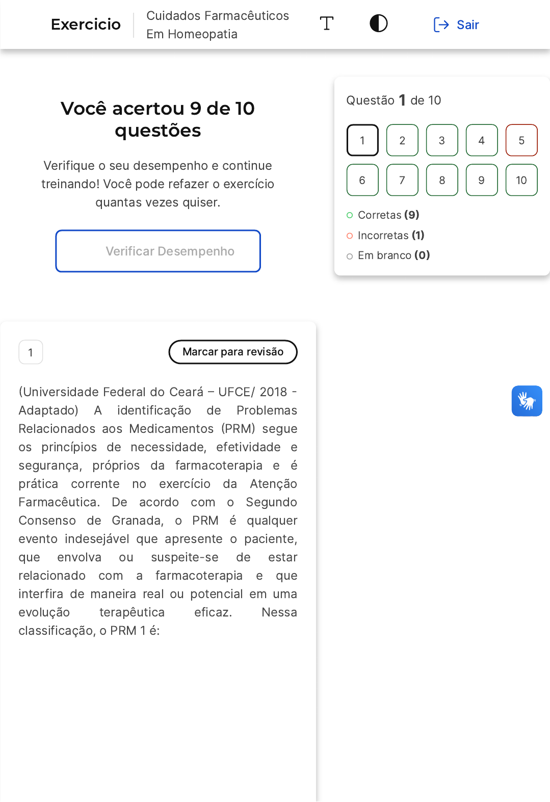 07/04/2024, 16:19 estacio.saladeavaliacoes.com.br/exercicio/6612ee3beee27ec2ab2e8fa5/gabarito/ https://estacio.saladeavaliacoes.com.br/exercicio/6612ee3beee27ec2ab2e8fa5/gabarito/ 1/20 Você acertou 9 de 10 questões Verifique o seu desempenho e continue treinando! Você pode refazer o exercício quantas vezes quiser. Verificar Desempenho 1 Marcar para revisão �Universidade Federal do Ceará � UFCE/ 2018 � Adaptado) A identificação de Problemas Relacionados aos Medicamentos �PRM� segue os princípios de necessidade, efetividade e segurança, próprios da farmacoterapia e é prática corrente no exercício da Atenção Farmacêutica. De acordo com o Segundo Consenso de Granada, o PRM é qualquer evento indesejável que apresente o paciente, que envolva ou suspeite-se de estar relacionado com a farmacoterapia e que interfira de maneira real ou potencial em uma evolução terapêutica eficaz. Nessa classificação, o PRM 1 é: Questão 1 de 10 Corretas �9� Incorretas �1� Em branco �0� 1 2 3 4 5 6 7 8 9 10 Exercicio Cuidados Farmacêuticos Em Homeopatia Sair 07/04/2024, 16:19 estacio.saladeavaliacoes.com.br/exercicio/6612ee3beee27ec2ab2e8fa5/gabarito/ https://estacio.saladeavaliacoes.com.br/exercicio/6612ee3beee27ec2ab2e8fa5/gabarito/ 2/20 A B C D E De segurança, sendo identificado quando o paciente sofre de um problema de saúde em consequência de uma insegurança não-quantitativa de um medicamento. De segurança, sendo identificado quando o paciente sofre de um problema de saúde em consequência de uma insegurança quantitativa de um medicamento. De necessidade, sendo identificado quando o paciente sofre de um problema de saúde em consequência de não receber o medicamento de que necessita. De efetividade, sendo identificado quando o paciente sofre de um problema de saúde em consequência de uma insegurança quantitativa de um medicamento. De efetividade, sendo identificado quando o paciente sofre de um problema de saúde em consequência de ineficácia não-quantitativa do medicamento utilizado. Resposta correta Parabéns, você selecionou a alternativa correta. Confira o gabarito comentado! Gabarito Comentado 07/04/2024, 16:19 estacio.saladeavaliacoes.com.br/exercicio/6612ee3beee27ec2ab2e8fa5/gabarito/ https://estacio.saladeavaliacoes.com.br/exercicio/6612ee3beee27ec2ab2e8fa5/gabarito/ 3/20 De acordo com o Segundo Consenso de Granada, um Problema Relacionado ao Medicamento �PRM� é um evento indesejável que pode estar relacionado à farmacoterapia e que pode interferir na evolução eficaz da terapia. Os PRMs são classificados de acordo com sua origem, que pode ser de necessidade, efetividade ou segurança. A alternativa correta é a letra C, que descreve o PRM de necessidade, identificado quando o paciente sofre de um problema de saúde por não receber o medicamento de que necessita. Essa classificação é importante para que o profissional de saúde possa identificar e tratar adequadamente o problema, seja ele real, já manifestado pelo paciente, ou potencial, com risco de ocorrer. 2 Marcar para revisão �FUNDATEC/2021� A implementação da homeopatia no SUS representa uma importante estratégia para a construção de um modelo de atenção centrado na saúde. Sobre este assunto, analise as afirmativas. I. Coloca o sujeito no centro do paradigma da atenção, compreendendo-o nas dimensões física, psicológica, social e cultural. II. Fortalece a relação médico-paciente como um dos elementos fundamentais da terapêutica, promovendo a humanização na atenção, estimulando o autocuidado e a autonomia do indivíduo. III. Contribui para o uso racional de medicamentos. 07/04/2024, 16:19 estacio.saladeavaliacoes.com.br/exercicio/6612ee3beee27ec2ab2e8fa5/gabarito/ https://estacio.saladeavaliacoes.com.br/exercicio/6612ee3beee27ec2ab2e8fa5/gabarito/ 4/20 A B C D E Marque a alternativa que contém as afirmações corretas. Apenas II. Apenas I e II. Apenas I e III. Apenas II e III. I, II e III. Resposta correta Parabéns, você selecionou a alternativa correta. Confira o gabarito comentado! Gabarito Comentado A homeopatia é uma área multidisciplinar que pode ser aplicada em diferentes faixas etárias e utiliza uma tecnologia simples para a produção de medicamentos. A inserção e consolidação da homeopatia como uma possibilidade terapêutica no Sistema Único de Saúde �SUS� permite a ampliação do cuidado em saúde, além de fornecer informações importantes que podem auxiliar na melhoria da organização e integração dessa área do cuidado em outros serviços de saúde. A integração da homeopatia às demais ações desenvolvidas pelo SUS contribui para a ampliação do acesso e para reforçar os princípios do SUS � universalidade, integralidade e equidade. Portanto, todas 07/04/2024, 16:19 estacio.saladeavaliacoes.com.br/exercicio/6612ee3beee27ec2ab2e8fa5/gabarito/ https://estacio.saladeavaliacoes.com.br/exercicio/6612ee3beee27ec2ab2e8fa5/gabarito/ 5/20 A B C as afirmativas estão corretas, pois a homeopatia coloca o sujeito no centro do paradigma da atenção, fortalece a relação médico-paciente e contribui para o uso racional de medicamentos. 3 Marcar para revisão �RBO/2021 � Adaptada) A revisão da Farmacoterapia é um serviço em que o farmacêutico analisa, de forma estruturada, os medicamentos em uso pelo paciente, com a finalidade de resolver problemas relacionados à prescrição, à utilização, aos resultados terapêuticos, entre outros. Marque a alternativa que contém problemas que podem ser identificados no serviço de revisão da farmacoterapia. Possíveis reações adversas; oportunidade de majoração do custo do tratamento e problemas de adesão. Possíveis reações adversas; necessidade de acompanhamento de terapia nutricional e problemas de adesão. Concentração plasmática abaixo da faixa terapêutica; oportunidade de majoração do custo do tratamento e problemas de adesão. 07/04/2024, 16:19 es