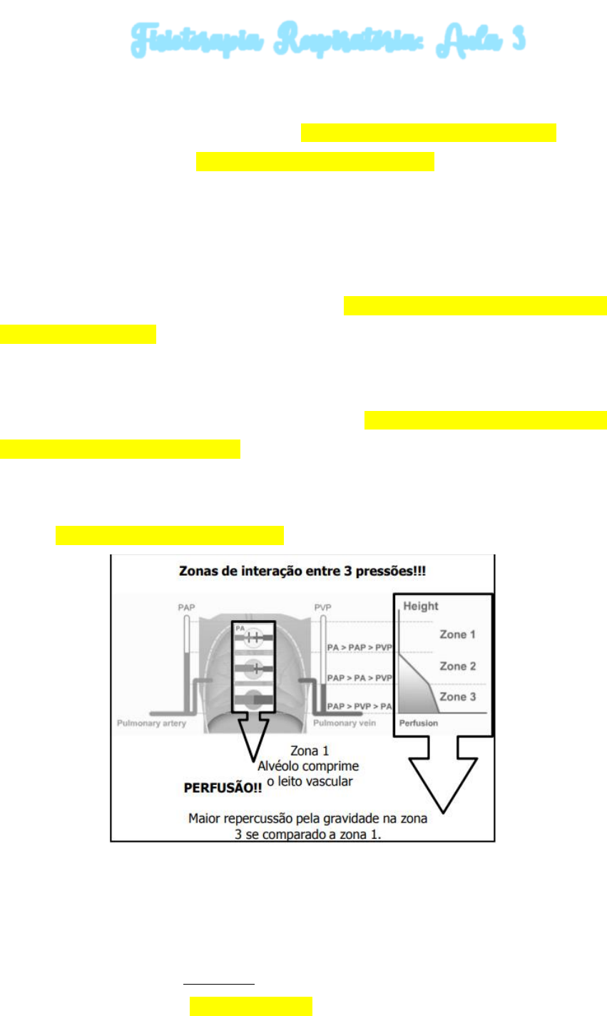 Fisioterapia Respiratória: Aula 3 ➔ Revisão: Zonas de West (zonas de ventilação e perfusão) - West mediu a pressão da artéria pulmonar- sangue que está chegando no pulmão; mediu a pressão da veia pulmonar- sangue que está saindo do pulmão. Começou a perceber as diferenças de pressões entre elas. - Temos artérias e veias que estão no pulmão e irão se encontrar na região pulmonar e depois na região cardíaca; - Ele comparou essas medidas com relação às pressões: alveolar, arterial e venoso; - O que ele identificou? Que na região de Zona 1 a pressão alveolar é maior e a pressão sanguínea é mais baixa→ tendencia de que o alvéolo comprima e faça uma pressão maior dentro do capilar. MAIOR ventilação e MENOR perfusão- dificuldade do sangue em passar. Zona 2- o fluxo sanguíneo continua dificultoso, ao final tem muito sangue, muita pressão, tendo uma perfusão sem muito comprometimento- a pressão arterial e venosa é maior se comparada com a pressão alveolar. - Obs: a tendencia da perfusão é ser maior nas bases- terço médio e inferior (tem a ver com a questão da gravidade); Zona 3- maior repercussão pela gravidade, maior perfusão, se comparado com a Zona 1. ➔ RELAÇÕES VENTILAÇÃO-PERFUSÃO: TROCA GASOSA - V/Q: relação ventilação/perfusão, faz-se uma divisão; - Terá uma relação V/Q para zona 1, 2 e 3; - O que seria ideal? Equilíbrio entre relação ventilação/perfusão; - Ao ter uma relação mais próxima de 1→ boa ventilação e boa perfusão; - Se a ventilação começa a aumentar e diminui a perfusão- há uma discrepância na relação V/Q. - Pa02 (Pressão parcial arterial de oxigênio no sangue); - Gráfico: a Pa02 vai de 0 a 150, ao estar no ar está em 150 e conforme irá adentrando a via aérea, a pressão vai diminuindo, caindo para 50 e ao chegar nos tecidos está próximo de 40 para chegar na mitocôndria. - Se meu paciente tem uma situação de hipoventilação (baixa ventilação), qual a tendencia dessa pressão? Cair ainda mais, chegará menos oxigênio no tecido, causando uma situação de comprometimento do sistema respiratório. → O que pode levar uma HIPOXEMIA (causas): - Redução da PaO2 (Pressão parcial arterial de oxigênio); - Hipoventilação (baixa ventilação) - levando a PaO2 diminuir; - Limitação da difusão (passagem de oxigênio comprometida); - Shunt (quando capilar + alvéolo hipoventila e se colaba, fechando as vias aéreas, o sangue que chega é o mesmo que sai sem que haja troca gasosa); - Desequilíbrio V/Q. Ao paciente que realizou exame de sangue/gasometria e constatou hipoxemia, verifica-se qual a causa citada acima. - Pensando em uma relação V/Q, quero avaliar a troca eficaz entre o sangue- perfusão (fluxo sanguíneo) e os pulmões (ventilação). - Os alvéolos é como se fosse uma colmeia, interligados, ao esticar todos se esticam, ao se fechar todos se fecham, em cima tende a estar estirado pela pressão alveolar aumentada e embaixo há uma possibilidade de ampliar mais os tecidos (há um limite para que não haja lesão/rompimento)→ se tenho uma situação em que preciso aumentar a ventilação (VRI), não é possível ventilar apenas em cima, é preciso trabalhar embaixo pois tem tecido para que o ar entre, aumentando VRI e VRE, consigo isso na base pela região possuir mais tecido complacente para distender e armazenar, consequentemente também há mais sangue embaixo (pressão arterial venosa é maior embaixo). - Pensando em uma situação de divisão deste pulmão: zona 1,2 e 3. O primeiro alvéolo é mais distendido e pouco em perfusão; no segundo já há uma relação da pressão arterial e venosa ser maior se comparada com a alveolar; e por fim na zona 3 uma pressão arterial e venosa maior e uma pressão alveolar menor. - Baixa ventilação e perfusão= shunt→ Se o resultado for 0. - Em uma relação em que o alvéolo está aberto, se tenho ventilação e não tenho perfusão, a relação é infinita→ Não é bom, pois não adianta ter um alvéolo aberto/distendido se não está passando sangue. Ocorre em casos de trombo embolismo pulmonar, fazendo com que perca a irrigação nesta região→ tendo uma situação de espaço morto e shunt, não haverá troca gasosa. - O que é uma relação V/Q ideal? Uma relação próxima ou igual a 1 ou levemente maior→ perfeita coordenação entre fluxo sanguíneo e ventilação. ➔ QUIZ - Ápice Zona 1: > (maior) ventilação < (menor) perfusão→ Relação V/Q é MAIOR - Base Zona 3: < (menor) ventilação e > (maior) perfusão→ Relação V/Q MENOR - Zona 2: intermediária - Onde todas as linhas se cruzam→ relação V/Q ideal= 1. ➔ Explicação da imagem: relações ventilação-perfusão do sistema respiratório - Ideal: alvéolo ventilado, sangue venoso chegando e saindo sangue arterial→ boa ventilação, boa perfusão e boa difusão; - Problema de perfusão: muita ventilação, sem perfusão (sem fluxo sanguíneo)→ situação de espaço morto; - Problema de ventilação: há o fluxo sanguíneo (perfusão) e uma baixa ventilação→ situação de Shunt; - Problema de difusão: há o fluxo sanguíneo (perfusão) e ventilação, alvéolo integro, mas o espaço intersticial está comprometido→ oxigênio comprometido, o ar não passa ao capilar. ➔ TRANSPORTE DOS GASES PELO SANGUE O oxigênio pode ser transportado pelo corpo através: - Plasma (líquido que está dentro do capilar); - Hemoglobina (Hb)→ se interliga com o oxigênio para promover seu transporte, tendo 4 ligações de ferro (Fe), ou seja, se liga à 4 oxigênios (moléculas O2). Ao verificar a saturação de oxigênio dessa Hb→ Saturação 100% Ao ‘’desligar’’ de duas moléculas de 02→ 50% O oxigênio sairá do alvéolo e poderá ir ao plasma ‘’solto/dançando’’ ou irá se ligar na hemoglobina Como o oxigênio sai do pulmão e vai para mitocôndria? Pelo plasma ou ligado a Hb. - A afinidade da Hb pelo CO (monóxido de 