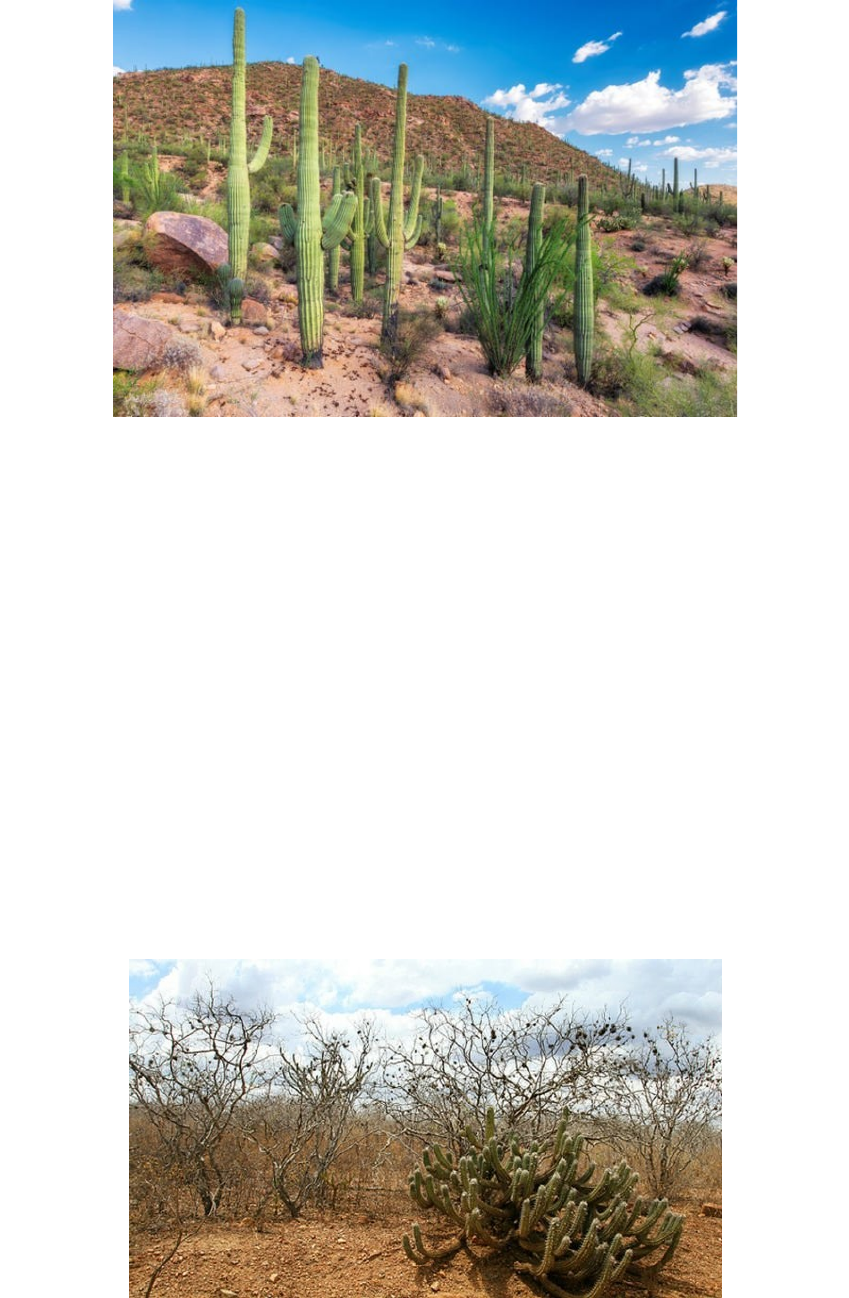Deserto de Sonora Por ter um clima árido, o deserto de Sonora na fronteira dos Estados Unidos com o México possui uma vegetação bem parecida com a vegetação do bioma caatinga localizado no Nordeste brasileiro, mas não confunda, a fauna e a flora dessas paisagens são bem diferentes. ➡️Caatinga é o único bioma exclusivamente brasileiro, o que significa que grande parte do seu patrimônio biológico não pode ser encontrado em nenhum outro lugar do planeta. Em função do clima semiárido da região onde se encontra, a vegetação da Caatinga costuma ser bastante seca, com espinhos e pouquíssimas folhas. No entanto, quando ocorrem as chuvas, ela se transforma rapidamente, ganhando um aspecto diferenciado, com árvores cobertas de folhas e pequenas plantas, forrando o chão. ➡️Deserto de Sonora: Está situado entre o Mojave e o Chihuahua, no sudeste dos Estados Unidos e no noroeste do México, ocupando uma área de 311.000 quilômetros quadrados. Suas duas estações de chuva, no inverno e no verão, dão-lhe a maior variedade de flora entre os desertos, o que por consequência permite suportar uma grande variedade de fauna. image1.jpeg image2.jpeg image3.jpeg image4.png
