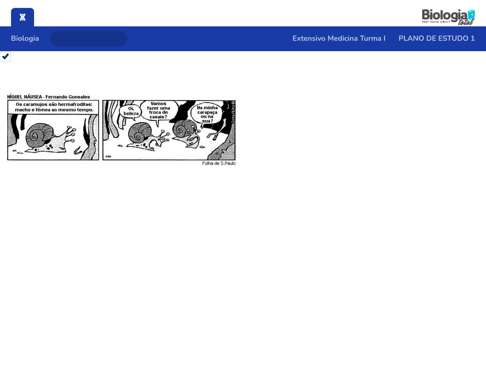 https://www.biologiatotal.com.br/medio/cursos/extensivo-medicina-2020 1/6 Biologia Lista de Exercícios Extensivo Medicina Turma I PLANO DE ESTUDO 1 Ex. 8 Introdução à Reprodução (PUCSP 2012) Analise a tira de quadrinhos abaixo. Embora hermafroditas, os caramujos normalmente têm fecundação cruzada, mecanismo que leva a descendência a apresentar Ex. 14 Introdução à Reprodução (FATEC 2007) Considere os seguintes processos: I. Uma planária fragmenta-se em três pedaços, originando três novas planárias. II. Uma população de microcrustáceos é formada somente por fêmeas que põem ovos dos quais se desenvolvem novas fêmeas. III. Um rato macho acasala-se com uma fêmea, produzindo seis �lhotes. Pode-se a�rmar, com certeza, que a variabilidade genética é uma das características dos descendentes resultantes somente de Ex. 11 Introdução à Reprodução (MACKENZIE 2009) Suponha a existência de dois tipos de uma mesma espécie de verme: um, que se reproduz assexuadamente, por brotamento, e outro, que é sexuado. Ambos vivem em um mesmo lago, também habitado por uma bactéria que provoca uma doença nesses vermes. A espécie assexuada é mais frequentemente atacada por essa bactéria. Após um período de seca, no qual a população desse verme foi drasticamente reduzida, observou-se que os indivíduos sexuados passaram a ser mais atacados pelas bactérias do que os assexuados. Considere as a�rmações a seguir. I. A reprodução sexuada, devido à variabilidade genética que ela proporciona, garantia uma maior resistência à infecção pela bactéria; II. A diminuição da população de vermes no lago, em consequência da seca, resultou na diminuição dessa variabilidade genética, tornando a população mais vulnerável à infecção pelas bactérias; III. Com a seca, os indivíduos assexuados se tornaram resistentes à infecção. Assinale: Ex. 9 Introdução à Reprodução (UDESC 2011) Analise cada proposição em relação ao processo de embriogênese e assinale (V) para verdadeira ou (F) para falsa. ( ) A fecundação é a união entre os gametas masculino e feminino, que são haploides, para formar um zigoto (diploide). ( ) Quando vários espermatozoides se aproximam do óvulo, ocorre o processo chamado de ativação. ( ) A monoespermia ocorre quando o espermatozoide é formado por apenas um �agelo. Imprimir mais exercícios por página a) aumento de variabilidade genética em relação à autofecundação e maior chance de adaptação das espécies ao ambiente. b) diminuição da variabilidade genética em relação à autofecundação e maior chance de adaptação das espécies ao ambiente. c) variabilidade genética semelhante à da autofecundação e as mesmas chances de adaptação das espécies ao ambiente. d) diminuição de variabilidade genética em relação à autofecundação e menor chance de adaptação das espécies ao ambiente. e) variabilidade genética semelhante à da autofecundação e menor chance de adaptação das espécies ao ambiente. a) I. b) II. c) III d) I e II. e) I e III. a) se somente I e II forem corretas. b) se somente I for correta. c) se somente II e III forem corretas. d) se somente II for correta. https://www.biologiatotal.com.br/medio/cursos/extensivo-medicina-2020 2/6 ( ) A an�mixia consiste na formação do tubo polínico nas plantas superiores. ( ) A partenogênese é o desenvolvimento sem fecundação do óvulo pelo espermatozoide. Este processo ocorre, por exemplo, nas abelhas. Assinale a alternativa que contém a sequência correta, de cima para baixo. Ex. 6 Introdução à Reprodução (UPE 2013) Os zangões, machos das abelhas, são formados por um processo de partenogênese e possuem 16 cromossomos. Já as abelhas operárias são fruto de um processo de fecundação. Diante dessas informações, analise as a�rmativas a seguir: I. Por serem fruto de partenogênese, os machos possuem o dobro de cromossomos encontrados na abelha rainha. II. A abelha rainha possui óvulos com o mesmo número de cromossomos encontrados nas células somáticas das operárias, pois ela também é uma fêmea. III. Todas as fêmeas possuem 32 cromossomos nas suas células somáticas, o dobro que os machos possuem. IV. A abelha rainha possui 16 cromossomos em seus óvulos, que, quando fecundados, geram indivíduos com 32 cromossomos. Estão CORRETAS Ex. 7 Introdução à Reprodução (UEPG 2013) Assinale o que for correto com relação aos ciclos, mecanismos reprodutivos e embriogênese. Ex. 2 Introdução à Reprodução (FGV 2015) Autotomia é a capacidade que alguns animais apresentam em soltar membros do corpo e regenerá-los posteriormente, como por exemplo, a autotomia caudal observada em algum as espécies de lagartos, conforme mostra a �gura. Nem todos os tecidos se recompõem e a regeneração torna-se menos e�ciente a cada perda da cauda, podendo inclusive não ocorrer, dependendo do local da mutilação. É correto a�rmar que a regeneração dos tecidos ocorre em função da capacidade de células se desdiferenciarem, retornando à condição Ex. 1 Introdução à Reprodução (PUCRS 2016) Para responder à questão, analise as informações sobre as etapas necessárias para que ocorra a variabilidade genética em seres vivos com reprodução sexuada. 1. Fertilização aleatória. 2. Crossing over na prófase da meiose II. 3. Segregação independente na anáfase da meiose I. 4. Introdução do órgão reprodutor masculino no órgão reprodutor feminino. Está/Estão correta(s) apenas a(s) etapa(s) a) V – V – V – V – V b) V – F – F – F – F c) V – F – V – F – F d) F – V – F – V – V e) V – V – F – F – V a) I e II. b) I e III. c) II e III. d) II e IV. e) III e IV. 01) A bipartição, mecanismo de reprodução sexuada, ocorre entre as angiospermas. 02) Os poríferos e cnidários podem partir-se em dois ou mais pedaços e cada um desses pedaços pode regenerar a parte perdida (
