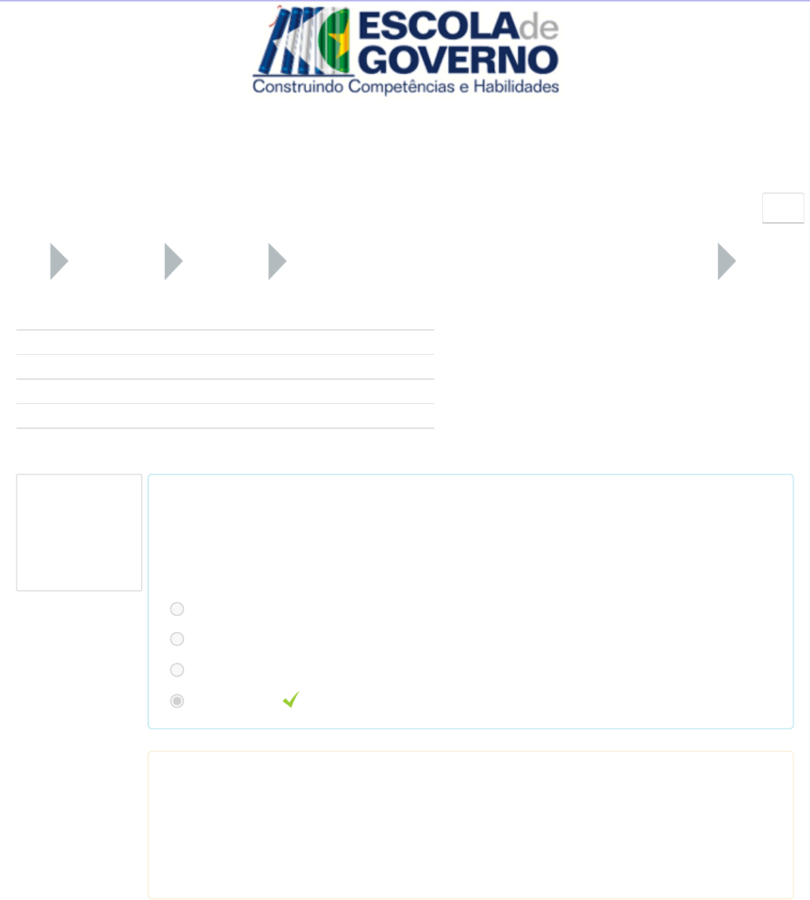 Buscar cursos Questão 1 Correto Atingiu 10,00 de 10,00 Noções de Administração do Trabalho - T1/2024 Iniciado em domingo, 31 Mar 2024, 22:10 Estado Finalizada Concluída em domingo, 31 Mar 2024, 22:31 Tempo empregado 20 minutos 44 segundos Avaliar 70,00 de um máximo de 100,00 Em um Estado Democrático de Direito, o administrador público não deve responder apenas em termos de legalidade, impessoalidade, moralidade, publicidade, mas também em termos de: Escolha uma: a. Liberdade contratual; b. Livre iniciativa; c. Personalidade; d. Eficiência. Resposta correta. Sua resposta está correta. Resposta correta: Em um Estado Democrático de Direito, o administrador público não deve responder apenas em termos de legalidade, impessoalidade, moralidade, publicidade, mas também em termos de eficiência. A resposta correta é: Eficiência.. Mensagens FABIULA TOPOLNIAK ALVES DA LUZ 2024 Cursos NADT0124 Unidade 1 - Noções de Sistemas de Trabalho (25/03 a 31/03/2024) Q105 Avaliação Virtual 1. Unidade 1. http://eadeg.gestao.mt.gov.br/ http://eadeg.gestao.mt.gov.br/message/index.php http://eadeg.gestao.mt.gov.br/ http://eadeg.gestao.mt.gov.br/course/index.php?categoryid=14 http://eadeg.gestao.mt.gov.br/course/view.php?id=157 http://eadeg.gestao.mt.gov.br/course/view.php?id=157§ion=1 http://eadeg.gestao.mt.gov.br/mod/quiz/view.php?id=8283 Questão 2 Correto Atingiu 10,00 de 10,00 No Estado Democrático de Direito a busca pelo melhor atendimento, melhor administração de recursos e maximização de resultados das finalidades do Estado e da própria Administração Pública no alcance da excelência e da eficiência da máquina pública é realizada por meio da: Escolha uma: a. Administração pública patrimonialista; b. Convocação de plebiscito ou referendo; c. Governança pública. Resposta correta. d. Administração pública burocrática; Sua resposta está correta. Resposta correta: Sendo assim, a governança concerne aos meios e processos utilizados para produzir resultados eficazes, o que garante a existência da legitimidade do Estado, uma vez que se associa à capacidade de administrar, seja em termos financeiro, sejam gerenciais, sejam técnicos. A construção da Governança deu-se em razão da necessidade de abarcar todas as formas de gestão dos problemas na sociedade e seus múltiplos atores. [...] Como se observa há, de fato, uma “migração” de conceitos e perspectivas da gestão privada de empresas para o setor público. Se justifica tal “importação” de modus operandi em função de, como já assinalado, não mais figurar o Estado como mero tutor da sociedade, mas verdadeiro gestor de recursos, pessoas e finalidades. A busca pelo melhor atendimento, melhor administração de recursos e maximização de resultados contribui assim, sobremaneira, para atendimento das finalidades do Estado e da própria Administração Pública. Alcança-se, obviamente, com essa otimização, o Estado Democrático de Direito no alcance da excelência e da eficiência da máquina pública. A resposta correta é: Governança pública.. Questão 3 Incorreto Atingiu 0,00 de 10,00 Questão 4 Correto Atingiu 10,00 de 10,00 A governabilidade no Estado Democrático de Direito diz respeito: Escolha uma: a. a adoção de mecanismos que proporcionem a observância da governança e da accountability; Resposta incorreta. b. as regras e normas burocráticas que determinam quem detém poder e como são tomadas as decisões sobre o exercício da autoridade nas organizações públicas; c. ao conjunto de atributos políticos, econômicos e sociais que são essenciais ao exercício do governo em si considerado, sem os quais nenhum poder será exercido; d. a falta de interação entre os diversos níveis de governo, e ainda, entre esses e as demais organizações empresariais e da sociedade civil. Sua resposta está incorreta. Resposta correta: Sendo assim, encontra-se no plano do Estado, e representa um conjunto de atributos essenciais ao exercício do governo, sem os quais nenhum poder será exercido. A resposta correta é: ao conjunto de atributos políticos, econômicos e sociais que são essenciais ao exercício do governo em si considerado, sem os quais nenhum poder será exercido;. Indique a opção que se refere ao modelo de administração pública verificada no Estado Democrático de Direito ao qual a governança pública surge como um requisito necessário: Escolha uma: a. Administração pública burocracia; b. Administração pública patrimonialista; c. Administração pública societal. d. Administração pública gerencial; Resposta correta. Sua resposta está correta. Resposta correta: Da definição dada por Grindle, depreende-se que a Governança está intimamente ligada à possibilidade de uma gestão pública eficiente, isso porque vem como uma continuidade do modelo de Administração Pública gerencial, focada em eficácia. A resposta correta é: Administração pública gerencial;. Questão 5 Correto Atingiu 10,00 de 10,00 Questão 6 Correto Atingiu 10,00 de 10,00 Indique a opção abaixo que representa as particularidades técnicas que caracterizam um sistema de produção onde ocorre alta taxa de variedade na transformação para obter uma grande diversidade de produto ou serviço a ser entregue: Escolha uma: a. Especialização e sistematização de procedimentos; b. Flexibilidade produtiva com complexidade no atendimento ao usuário; Resposta correta. c. Tolerância a espera limitada e habilidade no atendimento. d. Estabilidade, rotina, previsibilidade e elevada utilização; Sua resposta está correta. Resposta correta: A elevada variedade de operações com produtos ou serviços implica em um sistema de produção com alta flexibilidade, complexidade no atendimento da necessidade do usuário e custo unitário elevado. A pequena variedade de operações com produtos ou serviços implica produção rotinizada, padronizada, regular e de custo unitário baixo. A resposta c