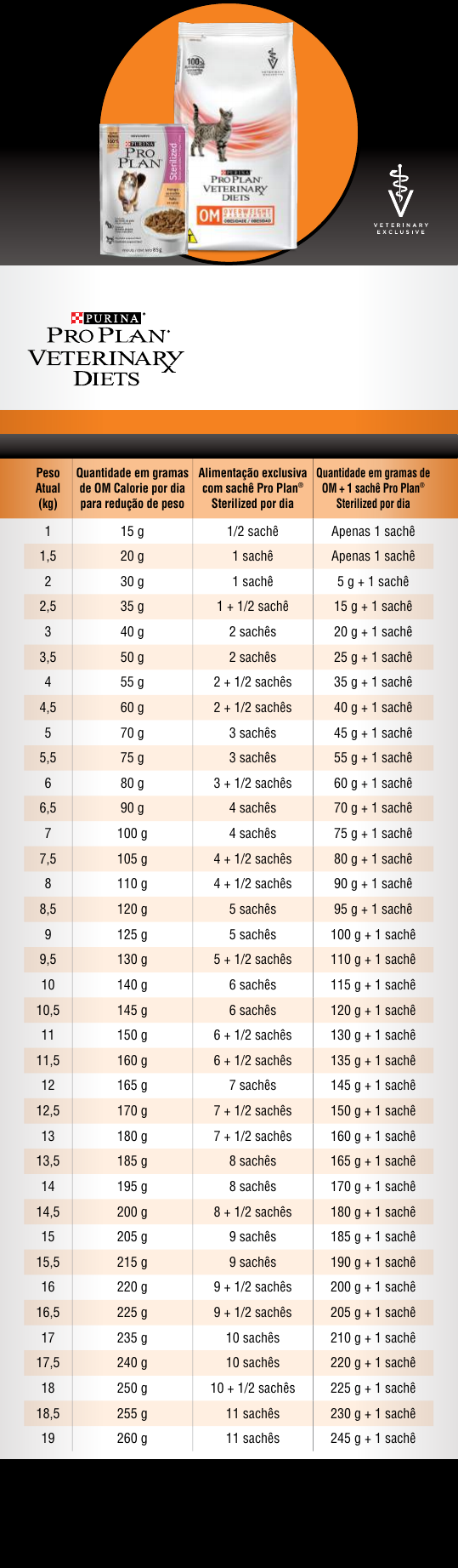 Peso Atual (kg) Quantidade em gramas de OM Calorie por dia para redução de peso Alimentação exclusiva com sachê Pro Plan® Sterilized por dia Quantidade em gramas de OM + 1 sachê Pro Plan® Sterilized por dia 1 15 g 1/2 sachê Apenas 1 sachê 1,5 20 g 1 sachê Apenas 1 sachê 2 30 g 1 sachê 5 g + 1 sachê 2,5 35 g 1 + 1/2 sachê 15 g + 1 sachê 3 40 g 2 sachês 20 g + 1 sachê 3,5 50 g 2 sachês 25 g + 1 sachê 4 55 g 2 + 1/2 sachês 35 g + 1 sachê 4,5 60 g 2 + 1/2 sachês 40 g + 1 sachê 5 70 g 3 sachês 45 g + 1 sachê 5,5 75 g 3 sachês 55 g + 1 sachê 6 80 g 3 + 1/2 sachês 60 g + 1 sachê 6,5 90 g 4 sachês 70 g + 1 sachê 7 100 g 4 sachês 75 g + 1 sachê 7,5 105 g 4 + 1/2 sachês 80 g + 1 sachê 8 110 g 4 + 1/2 sachês 90 g + 1 sachê 8,5 120 g 5 sachês 95 g + 1 sachê 9 125 g 5 sachês 100 g + 1 sachê 9,5 130 g 5 + 1/2 sachês 110 g + 1 sachê 10 140 g 6 sachês 115 g + 1 sachê 10,5 145 g 6 sachês 120 g + 1 sachê 11 150 g 6 + 1/2 sachês 130 g + 1 sachê 11,5 160 g 6 + 1/2 sachês 135 g + 1 sachê 12 165 g 7 sachês 145 g + 1 sachê 12,5 170 g 7 + 1/2 sachês 150 g + 1 sachê 13 180 g 7 + 1/2 sachês 160 g + 1 sachê 13,5 185 g 8 sachês 165 g + 1 sachê 14 195 g 8 sachês 170 g + 1 sachê 14,5 200 g 8 + 1/2 sachês 180 g + 1 sachê 15 205 g 9 sachês 185 g + 1 sachê 15,5 215 g 9 sachês 190 g + 1 sachê 16 220 g 9 + 1/2 sachês 200 g + 1 sachê 16,5 225 g 9 + 1/2 sachês 205 g + 1 sachê 17 235 g 10 sachês 210 g + 1 sachê 17,5 240 g 10 sachês 220 g + 1 sachê 18 250 g 10 + 1/2 sachês 225 g + 1 sachê 18,5 255 g 11 sachês 230 g + 1 sachê 19 260 g 11 sachês 245 g + 1 sachê PERDA DE PESO ADEQUADA PARA GATOS QUANTIDADES DIÁRIAS RECOMENDADAS PARA Um programa de perda de peso não precisa ser complexo para prescrever e nem para realizar. Para isso Purina® Pro Plan® Veterinary Diets desenvolveu uma tabela rápida e prática, que permite prescrever diversos tipos de dietas para os seus pacientes. As quantidades diárias recomendadas são apenas orientativas e devem ser ajustadas de acordo com as diretrizes clínicas para a perda ou manutenção do peso corporal ideal do gato. As mudanças na alimentação do gato devem ser feitas gradualmente durante um período de 7 a 10 dias. Substitua pequenas quantidades de alimento até que o gato coma exclusivamente Purina® Pro Plan® Veterinary Diets OM Overweight Management Fórmula Felina. * Uma xícara de chá padrão de 200 ml contém aproximadamente 90 g de Purina® Pro Plan® Veterinary Diets OM Overweight Management Fórmula Felina. / ** O cálculo da necessidade energética diária foi baseado na equação para manutenção de gatos pouco ativos. / *** A quantidade diária sugerida para perda de peso é baseada no peso atual do gato e nas necessidades calóricas médias para a perda de 1% do peso corporal por semana. A quantidade diária recomendada deverá ser ajustada a cada quatro semanas ou a critério do Médico Veterinário. Dieta para perda de peso, ideal para gatos acima do Escore Corporal 6. Peso Atual (kg) Quantidade em gramas de Reduced Calorie por dia para perda de peso Alimentação exclusiva com sachê Pro Plan® Sterilized por dia Quantidade em gramas de Reduced Calorie + 1 sachê Pro Plan® Sterilized por dia 1 15 g 1/2 sachê Apenas 1/2 sachê 1,5 20 g 1 sachê Apenas 1 sachê 2 25 g 1 sachê 5 g + 1 sachê 2,5 30 g 1 + 1/2 sachê 10 g + 1 sachê 3 40 g 2 sachês 15 g + 1 sachê 3,5 45 g 2 sachês 20 g + 1 sachê 4 50 g 2 + 1/2 sachês 30 g + 1 sachê 4,5 55 g 2 + 1/2 sachês 35 g + 1 sachê 5 60 g 3 sachês 40 g + 1 sachê 5,5 70 g 3 sachês 50 g + 1 sachê 6 75 g 3 + 1/2 sachês 55 g + 1 sachê 6,5 80 g 4 sachês 60 g + 1 sachê 7 90 g 4 sachês 70 g + 1 sachê 7,5 95 g 4 + 1/2 sachês 75 g + 1 sachê 8 100 g 4 + 1/2 sachês 80 g + 1 sachê 8,5 110 g 5 sachês 85 g + 1 sachê 9 115 g 5 sachês 90 g + 1 sachê 9,5 120 g 5 + 1/2 sachês 100 g + 1 sachê 10 125 g 6 sachês 105 g + 1 sachê 10,5 130 g 6 sachês 110 g + 1 sachê 11 140 g 6 + 1/2 sachês 120 g + 1 sachê 11,5 145 g 6 + 1/2 sachês 125 g + 1 sachê 12 150 g 7 sachês 130 g + 1 sachê 12,5 160 g 7 + 1/2 sachês 135g + 1 sachê 13 165 g 7 + 1/2 sachês 140 g + 1 sachê 13,5 170 g 8 sachês 150 g + 1 sachê 14 175 g 8 sachês 155 g + 1 sachê 14,5 180 g 8 + 1/2 sachês 160 g + 1 sachê 15 190 g 9 sachês 170 g + 1 sachê 15,5 195 g 9 sachês 175 g + 1 sachê 16 200 g 9 + 1/2 sachês 180 g + 1 sachê 16,5 210 g 9 + 1/2 sachês 185 g + 1 sachê 17 215 g 10 sachês 190 g + 1 sachê 17,5 220 g 10 sachês 200 g + 1 sachê 18 230 g 10 + 1/2 sachês 205 g + 1 sachê 18,5 235 g 11 sachês 210 g + 1 sachê 19 240 g 11 sachês 220 g + 1 sachê PERDA DE PESO ADEQUADA PARA GATOS QUANTIDADES DIÁRIAS RECOMENDADAS PARA As quantidades diárias recomendadas são apenas orientativas e devem ser ajustadas de acordo com as diretrizes clínicas para a perda ou manutenção do peso corporal ideal do gato. As mudanças na alimentação do gato devem ser feitas gradualmente durante um período de 7 a 10 dias. Substitua pequenas quantidades de alimento até que o gato coma exclusivamente Purina® Pro Plan® Reduced Calorie. * Uma xícara de chá padrão de 200 ml contém aproximadamente 90 g de Purina® Pro Plan® Reduced Calorie. / ** O cálculo da necessidade energética diária foi baseado na equação para manutenção de gatos pouco ativos. / *** A quantidade diária sugerida para perda de peso é baseada no peso atual do gato e na redução de 25% das calorias. A quantidade diária recomendada deverá ser ajustada a cada quatro semanas ou a critério do Médico Veterinário. Um programa de perda de peso não precisa ser complexo para prescrever e nem para realizar. Para isso Purina® Pro Plan® desenvolveu uma tabela rápida e prática, que permite prescrever diversos tipos de dietas para os seus pacientes. Dieta para manutenção e perda de peso, para gatos acima do peso ideal em até 15% ou com Escore Corporal 6.