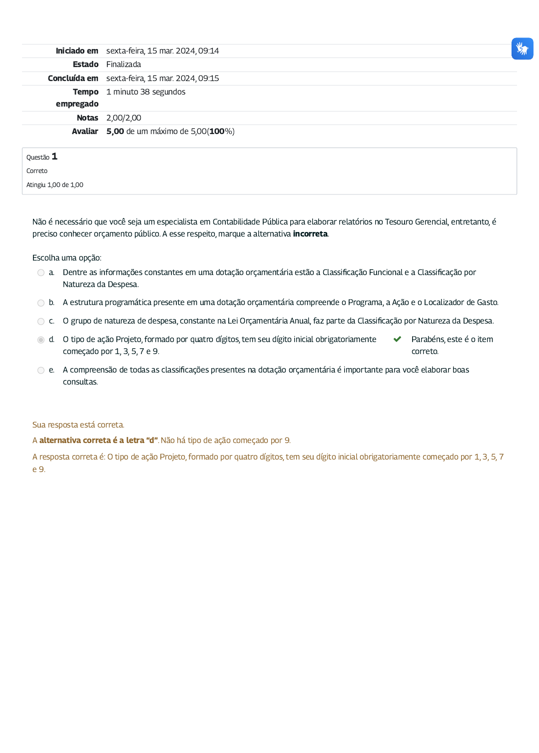 15/03/2024, 09:16 Exercício Avaliativo - Módulo 5: Revisão da tentativa https://mooc41.escolavirtual.gov.br/mod/quiz/review.php?attempt=2514427&cmid=47288 1/2 Iniciado em sexta-feira, 15 mar. 2024, 09:14 Estado Finalizada Concluída em sexta-feira, 15 mar. 2024, 09:15 Tempo empregado 1 minuto 38 segundos Notas 2,00/2,00 Avaliar 5,00 de um máximo de 5,00(100%) Questão 1 Correto Atingiu 1,00 de 1,00 Não é necessário que você seja um especialista em Contabilidade Pública para elaborar relatórios no Tesouro Gerencial, entretanto, é preciso conhecer orçamento público. A esse respeito, marque a alternativa incorreta. Escolha uma opção: a. Dentre as informações constantes em uma dotação orçamentária estão a Classi�cação Funcional e a Classi�cação por Natureza da Despesa. b. A estrutura programática presente em uma dotação orçamentária compreende o Programa, a Ação e o Localizador de Gasto. c. O grupo de natureza de despesa, constante na Lei Orçamentária Anual, faz parte da Classi�cação por Natureza da Despesa. d. O tipo de ação Projeto, formado por quatro dígitos, tem seu dígito inicial obrigatoriamente começado por 1, 3, 5, 7 e 9. Parabéns, este é o item correto. e. A compreensão de todas as classi�cações presentes na dotação orçamentária é importante para você elaborar boas consultas. Sua resposta está correta. A alternativa correta é a letra “d”. Não há tipo de ação começado por 9. A resposta correta é: O tipo de ação Projeto, formado por quatro dígitos, tem seu dígito inicial obrigatoriamente começado por 1, 3, 5, 7 e 9. 15/03/2024, 09:16 Exercício Avaliativo - Módulo 5: Revisão da tentativa https://mooc41.escolavirtual.gov.br/mod/quiz/review.php?attempt=2514427&cmid=47288 2/2 Questão 2 Correto Atingiu 1,00 de 1,00 A Classi�cação por Natureza da Despesa e a Classi�cação por Fonte de Recursos estão presentes na execução orçamentária da despesa, por isso é importante conhecer a estrutura dessas classi�cações para elaborar consultas no Tesouro Gerencial. Acerca desse tema, julgue cada uma das questões seguintes como verdadeira ou falsa e depois selecione a opção correspondente. I. A Classi�cação por Natureza da Despesa é formada pela categoria econômica, grupo de natureza de despesa, modalidade de aplicação, elemento de despesa e subelemento. II. Conhecer a tabela dos elementos de despesa é importante para a decodi�cação das demandas de consultas. Por exemplo, se houver uma solicitação de consulta do total de despesas empenhadas com material de consumo, deve-se saber o código referente a material de consumo. III. A Classi�cação por Fonte de Recursos é formada pelo Identi�cador de Uso, o Grupo Fonte, a Fonte de Recursos e o Detalhamento da Fonte. IV. Se houver uma solicitação de consulta para as despesas empenhadas com recursos do Tesouro Nacional do exercício corrente, é necessário entender que recursos do Tesouro Nacional do exercício corrente é o Grupo da Fonte de Recurso e o número correspondente é 1. V. A Fonte de Recurso Ordinária é a fonte de recurso 48. Escolha uma opção: a. V V V V F Parabéns, este é o item correto. b. V V V F F c. F F F V V d. V V F V V e. V F V F V Sua resposta está correta. A alternativa correta é a letra “a”. De acordo com a tabela de Fonte de Recursos, a Fonte Ordinária é a 00. A resposta correta é: V V V V F