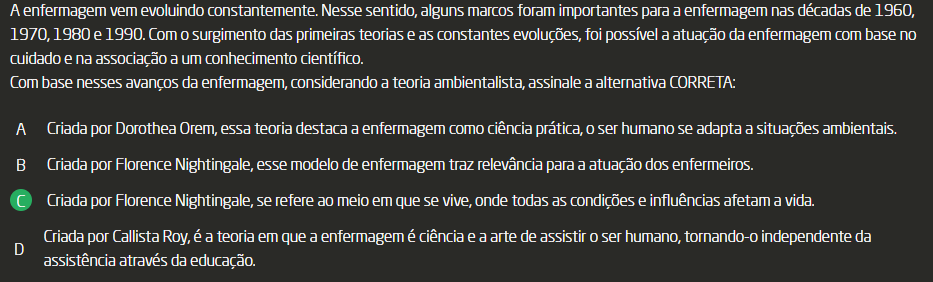 A Criada por Dorothea Orem, essa teoria destaca a enfermagem como ciência prática, ser humano se adapta a situações ambientais. B Criada por Florence Nightingale, esse modelo de enfermagem traz relevância para a atuação dos enfermeiros. C Criada por Florence Nightingale, se refere ao meio em que se vive, onde todas as condições e influências afetam a vida. D Criada por Callista Roy, é a teoria em que a enfermagem é ciência e a arte de assistir ser humano, independente da assistência através da educação.