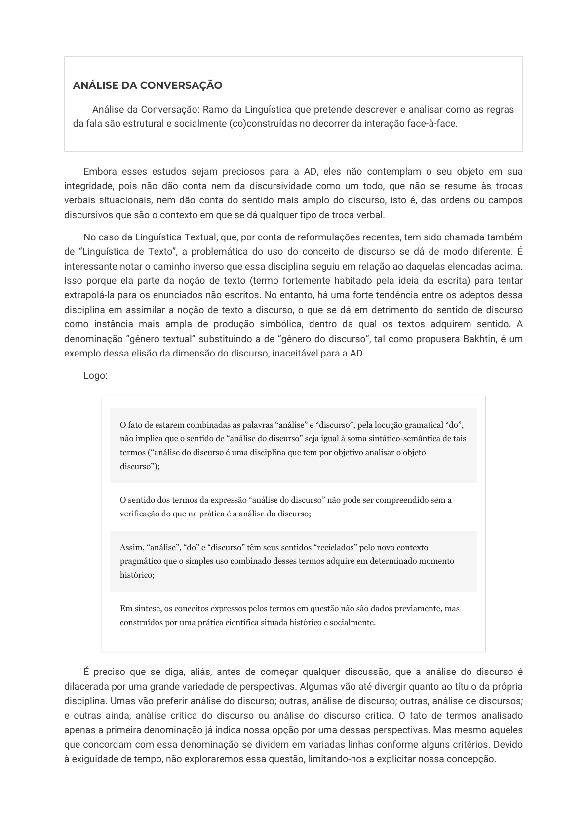 ANÁLISE DA CONVERSAÇÃO Análise da Conversação: Ramo da Linguística que pretende descrever e analisar como as regras da fala são estrutural e socialmente (co)construídas no decorrer da interação face-à-face. Embora esses estudos sejam preciosos para a AD, eles não contemplam o seu objeto em sua integridade, pois não dão conta nem da discursividade como um todo, que não se resume às trocas verbais situacionais, nem dão conta do sentido mais amplo do discurso, isto é, das ordens ou campos discursivos que são o contexto em que se dá qualquer tipo de troca verbal. No caso da Linguística Textual, que, por conta de reformulações recentes, tem sido chamada também de “Linguística de Texto”, a problemática do uso do conceito de discurso se dá de modo diferente. É interessante notar o caminho inverso que essa disciplina seguiu em relação ao daquelas elencadas acima. Isso porque ela parte da noção de texto (termo fortemente habitado pela ideia da escrita) para tentar extrapolá-la para os enunciados não escritos. No entanto, há uma forte tendência entre os adeptos dessa disciplina em assimilar a noção de texto a discurso, o que se dá em detrimento do sentido de discurso como instância mais ampla de produção simbólica, dentro da qual os textos adquirem sentido. A denominação “gênero textual” substituindo a de “gênero do discurso”, tal como propusera Bakhtin, é um exemplo dessa elisão da dimensão do discurso, inaceitável para a AD. Logo: O fato de estarem combinadas as palavras “análise” e “discurso”, pela locução gramatical “do”, não implica que o sentido de “análise do discurso” seja igual à soma sintático-semântica de tais termos (“análise do discurso é uma disciplina que tem por objetivo analisar o objeto discurso”); O sentido dos termos da expressão “análise do discurso” não pode ser compreendido sem a verificação do que na prática é a análise do discurso; Assim, “análise”, “do” e “discurso” têm seus sentidos “reciclados” pelo novo contexto pragmático que o simples uso combinado desses termos adquire em determinado momento histórico; Em síntese, os conceitos expressos pelos termos em questão não são dados previamente, mas construídos por uma prática científica situada histórico e socialmente. É preciso que se diga, aliás, antes de começar qualquer discussão, que a análise do discurso é dilacerada por uma grande variedade de perspectivas. Algumas vão até divergir quanto ao título da própria disciplina. Umas vão preferir análise do discurso; outras, análise de discurso; outras, análise de discursos; e outras ainda, análise crítica do discurso ou análise do discurso crítica. O fato de termos analisado apenas a primeira denominação já indica nossa opção por uma dessas perspectivas. Mas mesmo aqueles que concordam com essa denominação se dividem em variadas linhas conforme alguns critérios. Devido à exiguidade de tempo, não exploraremos essa questão, limitando-nos a explicitar nossa concepção. 14