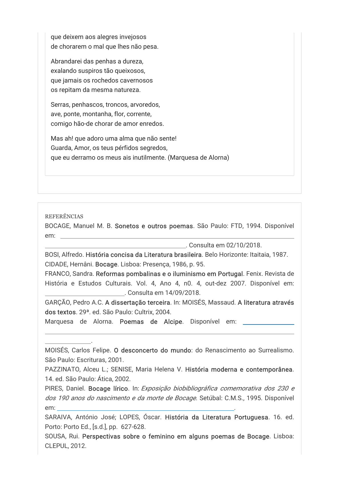 que deixem aos alegres invejosos de chorarem o mal que lhes não pesa. Abrandarei das penhas a dureza, exalando suspiros tão queixosos, que jamais os rochedos cavernosos os repitam da mesma natureza. Serras, penhascos, troncos, arvoredos, ave, ponte, montanha, flor, corrente, comigo hão-de chorar de amor enredos. Mas ah! que adoro uma alma que não sente! Guarda, Amor, os teus pérfidos segredos, que eu derramo os meus ais inutilmente. (Marquesa de Alorna) REFERÊNCIAS BOCAGE, Manuel M. B. Sonetos e outros poemas. São Paulo: FTD, 1994. Disponível em: http://www.dominiopublico.gov.br/download/texto/bv000059.pdf [20] (Visite a aula online para realizar download deste arquivo.). Consulta em 02/10/2018. BOSI, Alfredo. História concisa da Literatura brasileira. Belo Horizonte: Itaitaia, 1987. CIDADE, Hernâni. Bocage. Lisboa: Presença, 1986, p. 95. FRANCO, Sandra. Reformas pombalinas e o iluminismo em Portugal. Fenix. Revista de História e Estudos Culturais. Vol. 4, Ano 4, n0. 4, out-dez 2007. Disponível em: www.revistafenix.pro.br [21]. Consulta em 14/09/2018. GARÇÃO, Pedro A.C. A dissertação terceira. In: MOISÉS, Massaud. A literatura através dos textos. 29ª. ed. São Paulo: Cultrix, 2004. Marquesa de Alorna. Poemas de Alcipe. Disponível em: https://www.luso- livros.net/wp-content/uploads/2013/09/Poemas-de-Alcipe.pdf Consulta em 02/10/2018 [22]. MOISÉS, Carlos Felipe. O desconcerto do mundo: do Renascimento ao Surrealismo. São Paulo: Escrituras, 2001. PAZZINATO, Alceu L.; SENISE, Maria Helena V. História moderna e contemporânea. 14. ed. São Paulo: Ática, 2002. PIRES, Daniel. Bocage lírico. In: Exposição biobibliográfica comemorativa dos 230 e dos 190 anos do nascimento e da morte de Bocage. Setúbal: C.M.S., 1995. Disponível em: http://purl.pt/1276/1/lirico.html. Consulta em 11/10/2018 [23]. SARAIVA, António José; LOPES, Óscar. História da Literatura Portuguesa. 16. ed. Porto: Porto Ed., [s.d.], pp. 627-628. SOUSA, Rui. Perspectivas sobre o feminino em alguns poemas de Bocage. Lisboa: CLEPUL, 2012. 34