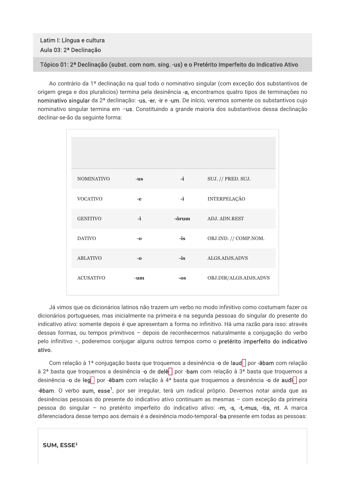 Latim I: Língua e cultura Aula 03: 2ª Declinação Tópico 01: 2ª Declinação (subst. com nom. sing. -us) e o Pretérito Imperfeito do Indicativo Ativo Ao contrário da 1ª declinação na qual todo o nominativo singular (com exceção dos substantivos de origem grega e dos pluralícios) termina pela desinência -a, encontramos quatro tipos de terminações no nominativo singular da 2ª declinação: -us, -er, -ir e -um. De início, veremos somente os substantivos cujo nominativo singular termina em –us. Constituindo a grande maioria dos substantivos dessa declinação declinar-se-ão da seguinte forma: CASO SINGULAR PLURAL FUNÇÕES SINTATICAS NOMINATIVO -us -i SUJ. // PRED. SUJ. VOCATIVO -e -i INTERPELAÇÃO GENITIVO -i -ōrum ADJ. ADN.REST DATIVO -o -is OBJ.IND. // COMP.NOM. ABLATIVO -o -is ALGS.ADJS.ADVS ACUSATIVO -um -os OBJ.DIR/ALGS.ADJS.ADVS Já vimos que os dicionários latinos não trazem um verbo no modo infinitivo como costumam fazer os dicionários portugueses, mas inicialmente na primeira e na segunda pessoas do singular do presente do indicativo ativo: somente depois é que apresentam a forma no infinitivo. Há uma razão para isso: através dessas formas, ou tempos primitivos – depois de reconhecermos naturalmente a conjugação do verbo pelo infinitivo –, poderemos conjugar alguns outros tempos como o pretérito imperfeito do indicativo ativo. Com relação à 1ª conjugação basta que troquemos a desinência -o de laudo por -ābam com relação à 2ª basta que troquemos a desinência -o de delĕo por -bam com relação à 3ª basta que troquemos a desinência -o de lego por -ēbam com relação à 4ª basta que troquemos a desinência -o de audĭo por -ēbam. O verbo sum, esse1, por ser irregular, terá um radical próprio. Devemos notar ainda que as desinências pessoais do presente do indicativo ativo continuam as mesmas – com exceção da primeira pessoa do singular – no pretérito imperfeito do indicativo ativo: -m, -s, -t,-mus, -tis, nt. A marca diferenciadora desse tempo aos demais é a desinência modo-temporal -ba presente em todas as pessoas: SUM, ESSE¹ 21 impress_parcial LatimILinguaecultura_aula_03