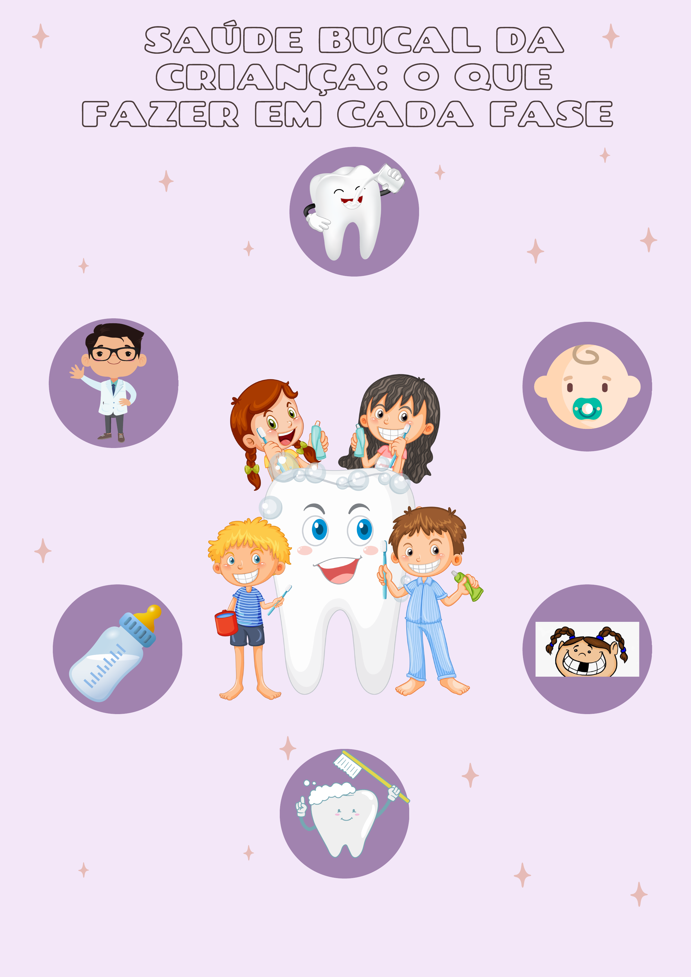 A primeira escovação deve ser feita com o nascimento dos dentinhos. Os pais devem usar escova e um creme dental infantil na quantidade certa (meio grão de arroz_ Liberada até 2 anos de idade. Exceder esse tempo pode causar problemas de má oclusão exigindo uso de aparelho no futuro. Após mamar, limpe a boca e a gengiva do bebê com uma gaze para retirar o excesso de leite. Isso evita cárie de mamadeira. É um momento de muita dor e choro para a criança. Alivie esses incômodos com ajuda de um mordedor. Se o bebê tiver febre, leve ao dentista. Leve o pequeno ao odontopediatra assim que os primeiros dentinhos nascerem. Os dentes podem ser arrancados em casa, mas com muito cuidado. Se o pequeno não se sentiu confortavél, os pais devem levá-los ao dentista para extração. SAÚDE BUCAL DASAÚDE BUCAL DA CRIANÇA: O QUECRIANÇA: O QUE FAZER EM CADA FASEFAZER EM CADA FASE