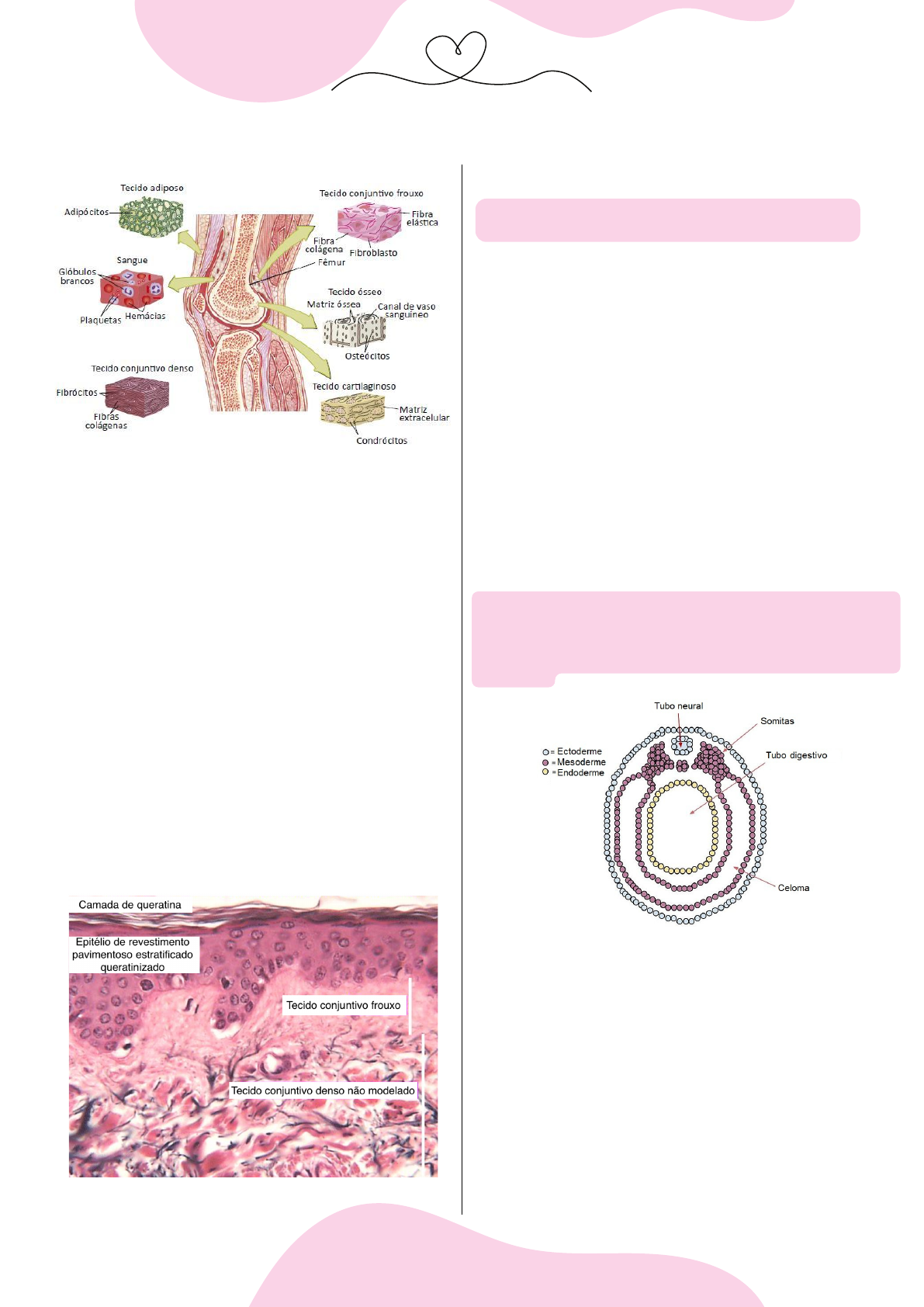 Tecido Conjuntivo O tecido conjuntivo é composto por células e matriz extracelular (MEC). A MEC é constituída por fibras proteicas colágenas, elásticas e reticulares, e por um componente não fibrilar que possui moléculas especializadas: proteoglicanos, glicoproteínas multiadesivas e glicosaminoglicanos. O tecido conjuntivo constitui um compartimento vasto e contínuo no corpo, limitado por lâminas basais dos epitélios e por lâminas basais ou externas das células musculares e células de sustentação dos nervos. A classificação do tecido conjuntivo se dá principalmente pela composição e organização dos componentes extracelulares e suas funções, abrangendo diversos tecidos com diferentes propriedades, mas ainda sim com características comuns. Tecido Conjuntivo Embrionario Os tecidos conjuntivos se originam do mesênquima embrionário a partir do mesoderma. Uma exceção é a região da cabeça, onde as células progenitoras específicas se originam do ectoderma através das células da crista neural. Através da proliferação e migração das células mesodérmicas e das células da crista neural se origina o tecido conjuntivo primitivo, o mesênquima. A proliferação do mesênquima origina, além dos diversos tecidos conjuntivos, os sistemas muscular, vascular, urogenital e as membranas serosas que revestem as cavidades corporais. Células Mesodérmicas: Dará origem ao músculo cardíaco, músculo esquelético, células do rim, células sanguíneas e muscúlo liso, entre outros. As primeiras células mesodérmicas inicialmente formarão uma camada fina de tecido ao redor de cada lado da linha primitiva. O tecido conjuntivo embrionário pode ser encontrado no embrião e no interior do cordão umbilical e é classificado em dois subtipos: o mesênquima e o tecido conjuntivo mucoso. O mesênquima é encontrado principalmente no embrião e apresenta células pequenas e fusiformes, que se caracterizam por possuir finos prolongamentos citoplasmáticos que entram em contato com as células vizinhas, assim como as junções comunicantes, formando uma rede celular tridimensional. O mesênquima apresenta uma substância fundamental viscosa, que possui fibras colágenas e reticulares. O tecido conjuntivo mucoso é característico do cordão umbilical e consiste em MEC especializada, composta principalmente de ácido hialurônico. A substância fundamental do tecido conjuntivo mucoso pode também ser chamada de geleia de Wharton. O tecido conjuntivo propriamente dito pode ser classificado em tecido conjuntivo frouxo e tecido conjuntivo denso, que pode ser ainda classificado como modelado ou não modelado. 1) Tecido conjuntivo frouxo Esse tecido está presente abaixo dos epitélios que cobrem as superfícies corporais e que revestem as superfícies internas do corpo e está associado ao epitélio das glândulas e aos vasos sanguíneos de menor calibre. Dessa forma, pode-se concluir que o tecido conjuntivo frouxo consiste no local pelo qual os agentes patogênicos adentram o corpo e se defrontam com as células do sistema imune, gerando reações inflamatórias e imunes. O tecido conjuntivo denso não modelado apresenta fibras abundantes, principalmente colágenas, e poucas células, principalmente fibroblastos. Devido à alta concentração de fibras colágenas, o tecido conjuntivo denso não modelado proporciona uma resistência significativa. O termo não modelado é utilizado porque as fibras estão dispostas em feixes orientados em várias direções, de forma a garantir que possam suportar estresses sobre órgãos ou estruturas. Nesse tecido, as células fusiformes estão afastadas umas das outras de modo semelhante aos fibroblastos no cordão umbilical do feto a termo. Algumas das células da geleia de Wharton expressam grandes quantidades de marcadores de células-tronco mesenquimatosas e possuem a capacidade de se diferenciar em osteócitos, condrócitos, adipócitos e alguns tipos de célula neural. Tecido Conjuntivo Propriamente Dito O tecido conjuntivo frouxo é composto por fibras frouxamente dispostas, diversas células e uma substância fundamental, de forma que apresenta consistência entre viscosa e gelatinosa e realiza importante papel na difusão de oxigênio e de nutrientes a partir de seus pequenos vasos. Essas reações podem causar aumento de volume no tecido conjuntivo frouxo, causando o edema, que configura uma das características marcantes da inflamação. 2) Tecido conjuntivo denso não modelado TNM: Tecido conjuntivo denso não modelado A pele apresenta uma camada relativamente espessa de tecido conjuntivo denso não modelado, denominada camada reticular da derme. Os órgãos ocos também possuem uma camada distinta de tecido conjuntivo denso não modelado, chamada submucosa. O tecido conjuntivo denso modelado apresenta arranjos ordenados e densamente compactados de fibras e células e é o principal componente de tendões, ligamentos e aponeuroses. As aponeuroses apresentam fibras dispostas em múltiplas camadas de arranjos regulares, onde os feixes de fibras colágenas em uma camada tendem a possuir um arranjo em um ângulo de 90° em relação aos das camadas adjacentes. Existem três tipos principais de fibras do tecido conjuntivo, que podem ser encontradas em quantidades variáveis dependendo das necessidades estruturais ou da função do tecido: fibras colágenas, reticulares e elásticas. Elas são produzidas por fibroblastos e compostas de proteínas. Os tendões são estruturas semelhantes a cordas que possuem a função de inserir o músculo ao osso e são compostos por feixes paralelos de fibras colágenas e tendinócitos. As fibras colágenas são flexíveis, possuem grande força e são o tipo mais abundante de fibras do tecido conjuntivo. Na microscopia óptica, as fibras colágenas são visualizadas como estruturas onduladas de largura e comprimentos variáveis, corando-se facilmente por corantes ácidos. 3) Tecido conjuntivo denso 