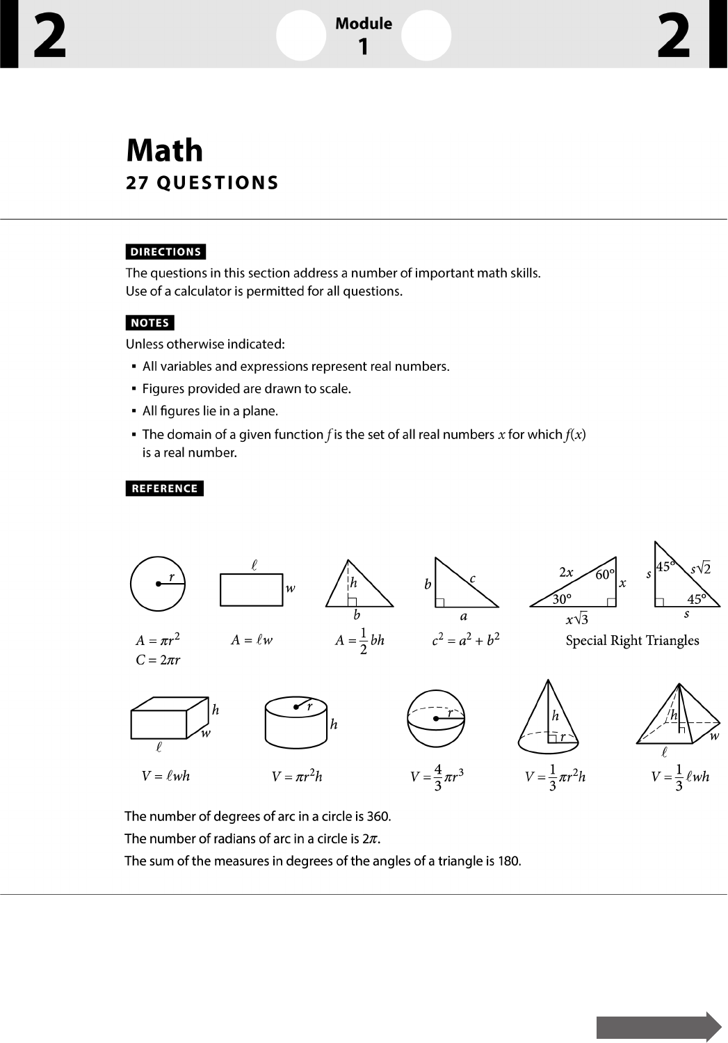 Module 1 Math 27 QUESTIONS DIRECTIONS The questions in this section address a number of important math skills. Use of a calculator is permitted for all questions. NOTES,a-nH Unless otherwise indicated: • All variables and expressions represent real numbers. • Figures provided are drawn to scale. • All figures lie in a plane. • The domain of a given function f is the set of all real numbers x for which f(x) is a real number. REFERENCE li04ii1Ut31 G A =nr2 C=2nr £ b~ CJw ~ x 0 b a x--../3 '~ 45° s A= Rw A =_!bh 2 c2 = a2 + b2 Special Right Triangles 62h E} £ V= Rwh V= nr2h Unauthorized copying or reuse of any part of this page is illegal. CONTINUE30 The number of degrees of arc in a circle is 360. The number of radians of arc in a circle is 2n. @ 4 V = i,.r3 3 V=½nr2h £ 1 V =3£wh The sum of the measures in degrees of the angles of a triangle is 180. Module 1 For multiple-choice questions, solve each problem, choose the correct answer from the choices provided, and then circle your answer in this book. Circle only one answer for each question. If you change your mind, completely erase the circle. You will not get credit for questions with more than one answer circled, or for questions with no answers circled. For student-produced response questions, solve each problem and write your answer next to or under the question in the test book as described below. • Once you've written your answer, circle it clearly. You will not receive credit for anything written outside the circle, or for any questions with more than one circled answer. • If you find more than one correct answer, write and circle only one answer. • Your answer can be up to 5 characters for a positive answer and up to 6 characters (including the negative sign) for a negative answer, but no more. • If your answer is a fraction that is too long (over 5 characters for positive, 6 characters for negative), write the decimal equivalent. • If your answer is a decimal that is too long (over 5 characters for positive, 6 characters for negative), truncate it or round at the fourth digit. • If your answer is a mixed number (such as 3.!. 2 ), write it as an improper fraction (7/2) or its decimal equivalent (3.5). • Don't include symbols such as a percent sign, comma, or dollar sign in your circled answer. Unauthorized copying or reuse of any part of this page is illegal. CONTINUE31 Module 1 - -- - -- y y - 9 I I - 8 \ - 7 \ I \ V - 6 '/ - 5 i-v, ,. \ - 3 \ - 2 ' -1 \ 2 -1 U 1 2 3 4 s\ 6 7 8 9 rg \ . X ... " --8 I \ --7 I \ --6 ' I --5 \ I --4 I \ --3 ' I --2 \ I --1 I \ 2 1u 1 ' 19 lf 11 +-1 ,. X - --------~ 1 The graph of a system of a linear equation and a nonlinear equation is shown. What is the solution (x, y) to this system? A) (0, 0) B) (0, 4) C) (4, 5) D) (5, 0) 2 On the first day of a semester, a film club has 90 members. Each day after the first day of the semester, 10 new members join the film club. If no members leave the film club, how many total members will the film club have 4 days after the first day of the semester? A) 400 B) 130 C) 94 D) 90 3 The graph of the linear function f is shown, where y = f (x). What is the y-intercept of the graph of f ? A) (0, 0) B) 0, − 16 11 C) (0, −8) D) (0, 8) ............................................................................................................................................................................................................................................................................................................... Unauthorized copying or reuse of any part of this page is illegal. CONTINUE32 Module 1 - --------- - - y --s • I ' I --4 \ \ I --3 --2 \ I \ I --1 /\ 1 u 1 2 3/ 4' 6 7 8 9 -L1 _lz J \ . • X - --------- 4 s + 7r = 27 r = 3 What is the solution (r, s) to the given system of equations? A) (6, 3) B) (3, 6) C) (3, 27) D) (27, 3) ............................................................................................................................................................................................................................................................................................................... 5 The table shows selected values from function f. x f(x) −1 16 0 17 1 18 2 19 Which of the following is the best description of function f ? A) Decreasing linear B) Increasing linear C) Decreasing exponential D) Increasing exponential 6 The graph of a system of linear equations is shown. The solution to the system is (x, y). What is the value of x ? 7 23, 27, 27, 32, 35, 36, 52 What is the range of the 7 scores shown? Unauthorized copying or reuse of any part of this page is illegal. CONTINUE33 Module 1 - ------- - --------~ k m n Note: Figure not drawn to scale. - --------~ - --------~ 8 In the figure, line m is parallel to line n, and line k intersects both lines. Which of the following statements is true? A) The value of x is less than 145. B) The value of x is greater than 145. C) The value of x is equal to 145. D) The value of x cannot be determined. 9 The equation x + y = 1,440 represents the number of minutes of daylight (between sunrise and sunset), x, and the number of minutes of non-daylight, y, on a particular day in Oak Park, Illinois. If this day has 670 minutes of daylight, how many minutes of non-daylight does it have? A) 670 B) 770 C) 1,373 D) 1,440 10 Scott selected 20 employees at random from all 400 employees at a company. He found that 16 of the employees in this sample are enrolled in exactly three professional development courses this year. Based on Scott’s findings, which of the following is the best estimate of the number of employees at the company who are enrolled in exactly three professional development courses this year? A) 4 B) 320 C) 380 D) 384 11 If 4x − 28 = −24, what is the value of x − 7 ? A) −24 B) −22 C) −6 D) −1 ........................................................................................................................