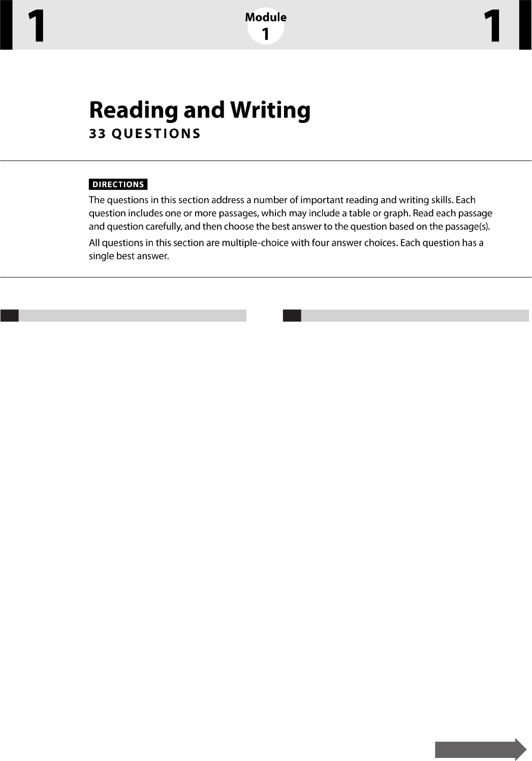 Module 1 Reading and Writing 33 QUESTIONS DIRECTIONS The questions in this section address a number of important reading and writing skills. Each question includes one or more passages, which may include a table or graph. Read each passage and question carefully, and then choose the best answer to the question based on the passage(s). All questions in this section are multiple-choice with four answer choices. Each question has a single best answer. - --------~ - --------~ 1 Though not closely related, the hedgehog tenrecs of Madagascar share basic _______ true hedgehogs, including protective spines, pointed snouts, and small body size—traits the two groups of mammals independently developed in response to equivalent roles in their respective habitats. Which choice completes the text with the most logical and precise word or phrase? A) examples of B) concerns about C) indications of D) similarities with ...................................................................................................................................................................................................... 2 In editor Lisa Yaszek’s introduction to her anthology The Future Is Female! More Classic Science Fiction Stories by Women, Yaszek identifies an increasing sense of _______ feminist mode of writing in the 1970s, in contrast to many woman-authored science fiction stories of the 1920s to 1960s whose politics were less deliberately signaled. Which choice completes the text with the most logical and precise word or phrase? A) a prudently B) an overtly C) a cordially D) an inadvertently Unauthorized copying or reuse of any part of this page is illegal. CONTINUE2 Module 1 3 _______ the long-standing trend of overemphasizing teenagers and young adults in research on social media use, scholars have recently begun to expand their focus to include the fastest-growing cohort of social media users: senior citizens. Which choice completes the text with the most logical and precise word or phrase? A) Exacerbating B) Redressing C) Epitomizing D) Precluding 4 The following text is adapted from James Baldwin’s 1956 novel Giovanni’s Room. The narrator is riding in a taxi down a street lined with food vendors and shoppers in Paris, France. The multitude of Paris seems to be dressed in blue every day but Sunday, when, for the most part, they put on an unbelievably festive black. Here they were now, in blue, disputing, every inch, our passage, with their wagons, handtrucks, their bursting baskets carried at an angle steeply self-confident on the back. ©1956 by James Baldwin As used in the text, what does the word “disputing” most nearly mean? A) Arguing about B) Disapproving of C) Asserting possession of D) Providing resistance to ............................................................................................................................................................................................................................................................................................................... 5 While recent scholarship has undermined claims that the works of twelfth-century Islamic philosopher Ibn Rushd were _______ other Muslim philosophers of his time, it is indisputable that his location in the Muslim-ruled area of what is now Spain meant that his works were primarily available thousands of miles west of the era’s center of Islamic thought. Which choice completes the text with the most logical and precise word or phrase? A) controversial among B) antagonistic toward C) imitated by D) inconsequential to Unauthorized copying or reuse of any part of this page is illegal. CONTINUE3 Module 1 6 On painter William H. Johnson’s return to the United States in 1938 after a decade in Europe, his style underwent an abrupt transformation. Turning away from landscapes painted in an expressionist style—a style that often involves using fluid, distorted shapes and thick, textured brushstrokes to express the artist’s subjective experience of reality—Johnson began painting portraits of Black Americans in a bold new way. Evocative of African sculpture and American and Scandinavian folk art, these portraits feature flat, deliberately oversimplified figures in a vibrant but limited color palette. Which choice best describes the function of the underlined sentence in the text as a whole? A) It elaborates on the previous sentence’s statement about a transitional moment in Johnson’s artistic career. B) It provides information about Johnson’s travels in support of a claim about his artistic influences, which is advanced in the following sentence. C) It recounts a moment in Johnson’s personal life that enabled the success of his subsequent career, which is summarized in the following sentence. D) It presents evidence that calls into question the previous sentence’s characterization of Johnson’s artistic development. ............................................................................................................................................................................................................................................................................................................... 7 When classical pianist Martha Argerich performs, it appears as if the music is coming to her spontaneously. She’s highly skilled technically, but because of how freely she plays and her willingness to take risks, she seems relaxed and natural. Her apparent ease, however, is due to a tremendous amount of preparation. Despite Argerich’s experience and virtuosity, she never takes for granted that she knows a piece of music. Instead, she approaches the music as if encountering it for the first time and tries to understand it anew. Which choice best states the main purpose of the text? A) To provide details about how Argerich identifies which pieces of music she will perform B) To assert that Argerich’s performances look effortless because of how she pr