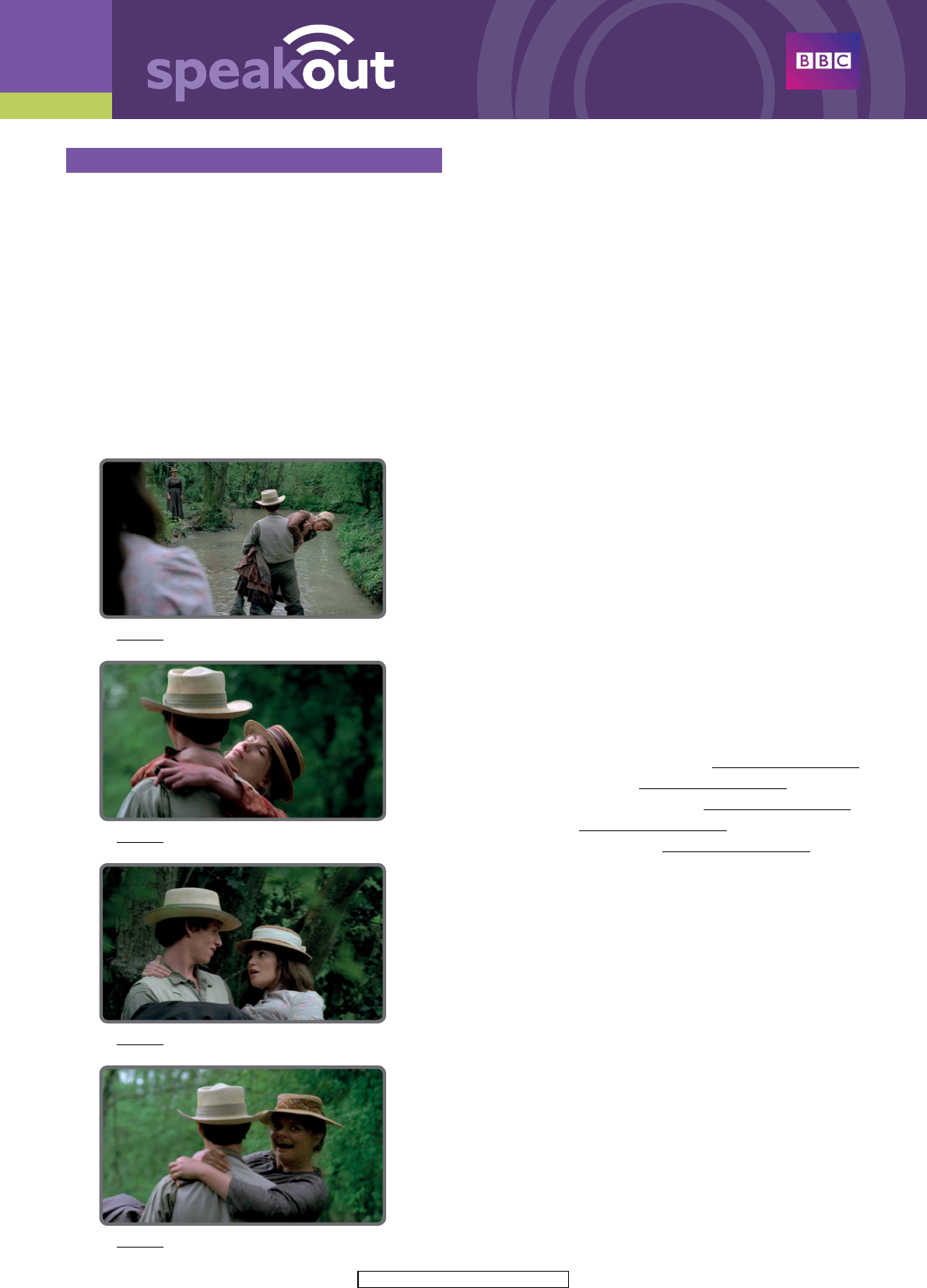 3 © Pearson Education Limited 2016 DVD EXTRA UPPER-INTERMEDIATE UNIT 3 1 Work in pairs. Discuss the questions. 1 If you’re a man, which of these things do you do for women? If you’re a woman, do you like it when men do these things for you? • hold the door open • give up a seat on a bus or train • pay for dinner in a restaurant • pull out the chair when sitting at a table 2 Do you think this behaviour is old-fashioned? 3 What other types of behaviour do you like or do? 2 A Watch the DVD and number the photos in the order you see them. B What is happening in each photo? How does each person feel? 3 A Match 1–10 with a)–j). 1 We can’t get there without 2 That’s that then, 3 Good morning ladies, 4 Perhaps I can be of assistance . 5 I’m supposed to put my arms around his neck, 6 I don’t care what happens, 7 How do I look? 8 I think I can climb 9 Compared to Marion you’re like gossamer , 10 I didn’t expect a) and how lovely you all look. b) I’m going to kiss him. c) walking through it. d) you’re a billow warmed by the sun. e) an event like this today. f) Who’s fi rst? g) along the bank a� er all. h) Do I look pretty? i) I’m going back to bed. j) and put my face against his … B Watch the DVD again to check. 4 Match the words/phrases in bold in Exercise 3A with their defi nitions below. 1 a very light, thin material 2 that’s the end 3 it’s not important to me 4 help 5 the side of a river 5 A Choose one of the characters from a fi lm or a famous novel and fi nd out as much as you can about him/her. Use questions 1–4 to help you. • Mr Darcy (Pride and Prejudice) • James Bond • Harry Potter • Heathcli� (Wuthering Heights) • Lisbeth Salander (The Girl with the Dragon Tattoo) 1 Which novel/fi lm is he/she from? 2 What type of story is it? 3 What is his/her character like? 4 What is his/her role in the story? B Work in groups. Ask and answer questions about the character you chose. Would you like to read any of these novels/watch any of these fi lms? A B C D