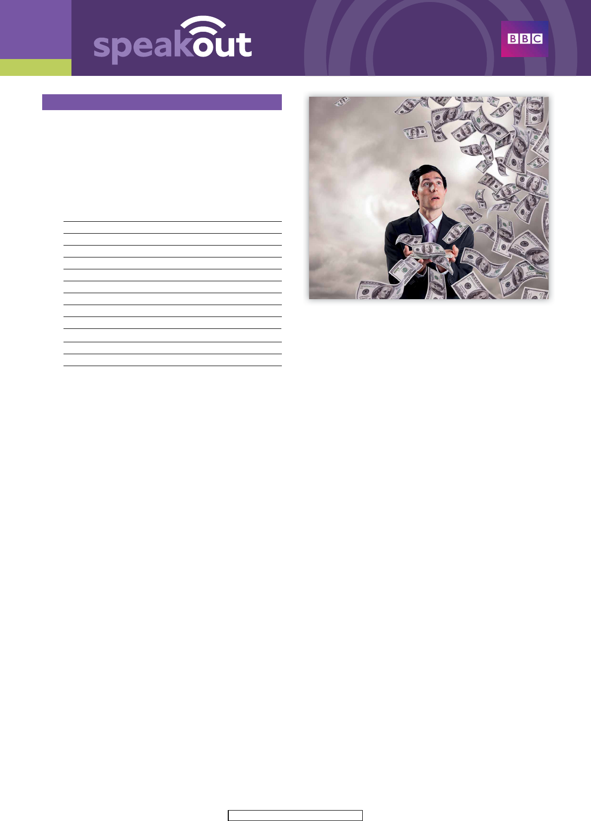4 © Pearson Education Limited 2016 DVD EXTRA UPPER-INTERMEDIATE UNIT 4 1 A Think of a time when you were very happy. Answer the questions and make notes. 1 How old were you? 2 Where were you? 3 What were you doing? 4 Why were you so happy? Was it down to one thing or a combination of things? B Work in pairs. Tell your partner about the time you were happy. 2 A Watch the DVD and number the things in the order you see them. a) Mark Easton drawing a graph b) people in suits walking to work c) people working in an old factory d) toy cars e) people on holiday f) a pile of coins B Work in pairs. What is the signifi cance of each of the things in Exercise 2A? 3 A Decide if the sentences are true (T) or false (F). 1 Science says we need to change the way we live. 2 In New York city, branded goods are important. 3 Money only makes people happy when they earn above £10,000 a year. 4 Since 1950, incomes have stayed the same but happiness has increased. 5 We can feel happier by comparing what we have to others. 6 We need to work harder to be happier. 7 Things are starting to change. 8 Politicians are starting to think di� erently about creating happiness. B Watch the DVD again to check. 4 Match the words/phrases 1–7 with their meanings a)–f). You can use one meaning twice. 1 average 2 income 3 brand new 4 consumerist 5 designer label 6 income 7 leisure a) what most people earn in an economy b) never used before c) a person who believes buying a lot of goods and services is good d) made by a well-known producer of quality goods e) money you earn f) free time 5 A EITHER choose a person you know OR choose one of the people below who have changed their lives in the pursuit of happiness and fi nd out as much as you can about him/her. Use questions 1–5 to help you. • Wayne Adams and Catherine King • Richard Proenneke • Emma Orbach • Prince Alwaleed bin Talal 1 Who is he/she? 2 Where does he/she live? 3 How did he/she change his/her life? 4 How much money does he/she have? 5 What is his/her life like? B Work in groups. Ask and answer questions about the person you chose. A: I chose Emma Orbach. B: Who’s she? A: She’s a woman who lives in a mud hut. She lives off the land.