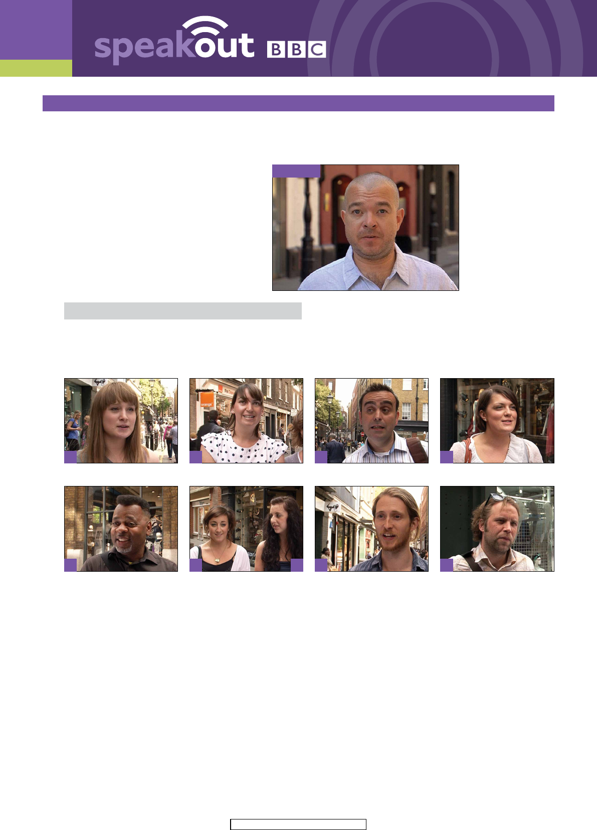9 1© Pearson Education Limited 2015 INTERVIEWS EXTRA UPPER INTERMEDIATE UNIT 9 1 OVERVIEW: Watch the video. Do you share any fears or phobias with the people in the video? 2 Read about Pasha’s fears and phobias below. Then watch the video from 0:12–0:25 and delete the incorrect words. Hi. Like 1 a lot of/many people, I do have some 2 small/minor fears and phobias: some things 3 worry/scare me but there’s nothing 4 really/particularly that a� ects my life. 5 What/How about you? Do you have any fears or 6 worries/phobias? 3 Do you have any fears or phobias? Look at the phobias 1–8 that the people in the video talk about. Then watch the video from 0:25–1:26 and match the people (A–I) to the phobias. Some people have more than one phobia and others share the same phobia. 1 heights _____________ 2 rats _____________ 3 very crowded places _____________ 4 pencils and the noise they make on paper _____________ 5 spiders _____________ 6 dogs _____________ 7 committing to marriage and children _____________ 8 fl ying _____________ Pasha Glossary: phobia = a strong, unreasonable fear of something A E B F G C H D I Gemma Colin Claire Alexandra Chloe Chris Alex Hannah Stuart C, 9 2© Pearson Education Limited 2015 INTERVIEWS EXTRA 4 How do your fears or phobias interfere with your life? Look at the people in the pictures and read the sentences. Then watch the video from 1:27–2:08 and write true (T) or false (F) next to each sentence. 5 What fear or phobia would be the most troublesome in the modern world? Read the words and phrases in the box below and use them to complete what people say in the video. There are three extra answers. Then watch the video from 2:10–2:52 to check your answers. claustrophobia trapped in a small space fl ying agoraphobia liked or loved fear of illness technophobia Chris: I suppose not being 1_____________ . Stuart: I would have thought it would be something like 2_____________ because it would just keep people in their homes and not being able to, sort of, integrate with society in any way. Hannah: Perhaps, 3_____________ , perhaps, especially in London because you are so ‘closed in’ a lot of the time, so things like li� s and also transport, so fl ying perhaps and using trains, tubes: I think that would probably get in the way quite a lot. Colin: People like to move and like their freedom and I think to be 4_____________ is quite scary for a lot of people. 1 Gemma tries not to go to crowded places. _____ 2 She guesses where the crowds will be. _____ 1 Chloe wrote with a pencil at school. _____ 2 She used to cringe when other children used a pen. _____ 1 Hannah would plan trips that didn’t involve fl ying. _____ 2 She tries to fl y as o� en as she can. _____ 1 Chris missed the opportunity to go on a balloon ride. _____ 2 He tried to overcome his phobia by going on a balloon trip. _____ 1 Marie always buys bargains in the sales. _____ 2 She loves to go shopping in the sales. _____ F Marie Gemma Chloe Hannah Chris 9 3© Pearson Education Limited 2015 INTERVIEWS EXTRA 6 THE WAY WE SPEAK: The people below talk about their fears and phobias. Read what they say and try to complete the sentences. Then watch the video from 0:25–1:26 and check your answers. Glossary: the tube = the system of trains that run underground in London bins = containers for storing waste blunt pencil = a pencil that is not sharp or pointed Gemma Claire Chris Hannah Colin 1 Yeah, I _____________ very crowded places, like when the tube is really busy. 2 I think for me the biggest one is _____________ heights, which I fi nd really illogical, and it’s something that’s developed as I’ve got older. 3 I __________________________ height and, or fl ying, even, as well. 4 I don’t know if it’s strange, but I do __________________________ fl ying. 5 I __________________________ spiders … from childhood. 9 4© Pearson Education Limited 2015 INTERVIEWS EXTRA Alexandra Alex Stuart Chloe 6 I’m _____________ rats. And when I walked from college to my fl at, there’s lots of bins and lots of rats – that was _____________. 7 I’d say that, probably, a _____________ that a lot of people have today is, that I share, is committing: potentially looking at getting married at a young age; looking to have a family. 8 One in particular is, dogs. I had __________________________ with a dog years and years ago. 9 I have __________________________ pencils: blunt pencils and the noise it would make on paper. 7 PERSONALISATION: Write a short paragraph about any fears or phobias you have. Use Pasha’s questions to help you and also use some of the language from the video. • Do you have any fears and phobias? • How do your fears or phobias interfere with your life? • What fear or phobia would be the most troublesome in the modern world? ____________________________________________________________________________________________________ ____________________________________________________________________________________________________ ____________________________________________________________________________________________________ ____________________________________________________________________________________________________ ____________________________________________________________________________________________________ ____________________________________________________________________________________________________