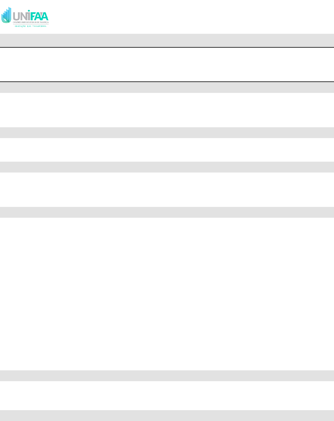 Rua Sargento Vitor Hugo, 161 - Bairro Fátima - Valença/RJ - 27.600-000 Tel: (24) 2453 0700 FUNDAÇÃO EDUCACIONAL DOM ANDRÉ ARCOVERDE UNIFAA-CENTRO UNIVERSITÁRIO DE VALENÇA Plano de Ensino Disciplina: HISTOLOGIA E EMBRIOLOGIA Medicina VeterináriaCurso: 2º PERÍODOPeríodo: 2º PERÍODO MED. VETERINÁRIA - 2953Turma: 2018/2Período Letivo: Carga Horária: 60 horas Ementa Métodos de estudo de tecidos. Estrutura, ultraestrutura e histofisiologia dos tecidos epiteliais de revestimento e glandular, conjuntivo propriamente dito, adiposo, cartilaginoso, ósseo, sanguíneo, muscular e nervoso. Conceitos fundamentais de ontogenia e filogenia. Características dos órgãos reprodutores de diferentes espécies animais, formação de gametas e tipos de gametas. Ciclos reprodutivos. Fecundação e nidação. Gastrulação. Evolução dos folhetos e delimitação do corpo. Placentação e anexos embrionários. Organogênese dos diversos sistemas e teratologia. Objetivo Geral Noções básicas sobre a histologia e a embriologia, bem como dos processos patológicos associados, tendo assim subsídios para posterior utilização nas disciplinas de conhecimentos correlatos e na sua aplicação clínica. Correlacionar a histomorfologia e a histofisiologia dos tecidos dos animais doméstico. Descrever a estrutura, a ultraestrutura e a histofisiologia dos diferentes tecidos dos animais domésticos. Correlacionar as noções básicas de embriologia, visando o entendimento sobre a formação dos tecidos e, futuramente, dos órgãos. Correlacionar o conteúdo aprendido com as aplicações práticas do médico veterinário. Reconhecer os tecidos em fotomicrografias e ao microscópio óptico. Objetivo Específico Conteúdo Programático Embriologia: noções do sistema reprodutor masculino e feminino e gametogênese.1. Embriologia: Primeira semana do desenvolvimento - Fecundação e Clivagem.2. Embriologia: 2ª semana de desenvolvimento embrionário3. Embriologia: 3ª semana de desenvolvimento embrionário.4. Embriologia: 4ª semana de desenvolvimento embrionário.5. Histologia do Tecido Epitelial de Revestimento.6. Histologia do Tecido Epitelial Glandular.7. Histologia do Tecido Conjuntivo Propriamente Dito8. Histologia do Tecido Adiposo.9. Histologia do Tecido cartilaginoso.10. Histologia do Tecido Ósseo.11. Histologia do Tecido Sanguíneo.12. Histologia do Tecido Muscular.13. Histologia do Tecido Nervoso.14. Metodologia A disciplina dispõe de aulas teóricas com recursos multimídia e aulas práticas em laboratórios com a utilização de recursos multimídia para projeção de lâminas histológicas, microscópios e coleção histológica referente aos conteúdos teóricos ministrados. Os alunos serão incentivados a elaborar um atlas histológico durante as aulas expositivas, utilizando o material e recursos didáticos disponibilizados durante as aulas práticas. Sistema de Avaliação ___NPC 1___ P1 (AVALIAÇÃO TEÓRICA: 6,5 PONTOS + AVALIAÇÃO PRÁTICA* 2,0 ponto) + TIN 1 0,5 pontos + DI: 1,0 ponto = Totalizando 10,0 pontos; (a avaliação teórica do conteúdo ministrado até à época da NPC 1; Avaliação teórica será composta por questões objetivas) ___NPC 2___ P2 (AVALIAÇÃO TEÓRICA: 7,5 PONTOS + SEMINÁRIOS DE EMBRIOLOGIA: 2,0 pontos ) + TIN 2 0,5 pontos = Totalizando 10,0 pontos; (avaliação teórica e a prática de todo o conteúdo do semestre (conteúdo acumulativo); Avaliação teórica será composta por 8 questões objetivas e 4 questões discursivas). 2Emitido em 23/07/2021 21:03 | JACAD - Sistema Acadêmico 3.1.44 Código de identificação: 9561DC001R285208 Para consultar a autenticidade do documento acesse: https://faa.jacad.com.br/academico/docs/ Página 1 de Disciplina: HISTOLOGIA E EMBRIOLOGIA Medicina VeterináriaCurso: 2º PERÍODOPeríodo: 2º PERÍODO MED. VETERINÁRIA - 2953Turma: 2018/2Período Letivo: Carga Horária: 60 horas ___NPC 3___ P3 - AVALIAÇÃO TEÓRICA: 10,0 pontos (avaliação teórica do conteúdo de todo o conteúdo do semestre para os alunos que não obtiveram a média em vigor em NPC1+ NPC2, que tenham faltado à avaliação NPC1 ou NPC2; Avaliação teórica será composta por 8 questões objetivas e 4 questões discursivas) * Avaliação Prática - apresentação de imagens (fotografias) histológicas apresentadas nas aulas teóricas ou obtidas nas coleções histológicas do Núcleo Biomédico do CESVA e/ou nas literaturas recomendadas (bibliografia básica, bibliografia complementar ou sites online recomendados). JUNQUEIRA, Luis Carlos Uchoa; Histologia básica. 11.ed. Rio de Janeiro: Guanabara Koogan, 2011. PIEZZI, Ramóm S. Novo atlas de histologia normal de Di Fiori. 1.ed. Rio de Janeiro: Guanabara Koogan, 2008. ALMEIDA, Jorge Mamede de. Embriologia veterinária comparada. 1.ed. Rio de Janeiro: Ganabara Koogan, 1999. Bibliografia Básica Bibliografia Complementar BANKS, W.J. Histologia veterinária aplicada. 2.ed. São Paulo: Manole, 1992. 629p. DI FIORE, M.S.H. Novo atlas de histologia normal de Di Fiori.1. ed. Rio de Janeiro: Guanabara Koogan, 2008. 336p ROSS, M. H.; PAWLINA, W.; BARNASH, T. A. Porto Alegre: Artmed, 2012. Disponível em: https://online.vitalsource.com/books/9788536327495/pageid/0 HAM, Arthur W.; CORMACK, David H. Ham: histologia. 9.ed. Rio de Janeiro: Guanabara Koogan, 1991. 570p. DELMANN; BROWN. Histologia veterinária (Estante Virtual) Docente: ANA PAULA DE ARAGÃO GAMA Coordenadora: LILIAN CRISTINA DE SOUSA OLIVEIRA BATISTA CIRNE 2Emitido em 23/07/2021 21:03 | JACAD - Sistema Acadêmico 3.1.44 Código de identificação: 9561DC001R285208 Para consultar a autenticidade do documento acesse: https://faa.jacad.com.br/academico/docs/ Página 2 de