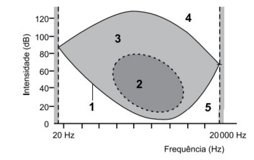 A orelha humana tem suas limitações com relação à percepção de ondas sonoras, tanto em relação à frequência, medida em Hertz (Hz), como em relação à intensidade do som, medida em decibéis(dB). Para ilustrar essa capacidade auditiva, o gráfico a seguir mostra os limites humanos para a frequência e a intensidade. (http://www.cochlea.org/po/som/campo-auditivo-humano#. Adaptado) Considerando o gráfico e os valores de frequência e intensidade, a relação entre o número e a percepção auditiva está correta em: a)4 representa a região de frequência e intensidade capazes de serem percebidos pela orelha humana. b)3 indica o campo auditivo humano, limitado pelos níveis superiores e inferiores de frequência e intensidade. c)1 representa a combinação de frequência e intensidade que não é percebida pela orelha. d)2 representa a situação em que os valores de frequência e intensidade atingem o limiar de audição humana. e)5 indica os valores de frequência e intensidade que ficam dentro da área auditiva para a orelha humana. Correta: e)5 indica os valores de frequência e intensidade que ficam dentro da área auditiva para a orelha humana. image1.png
