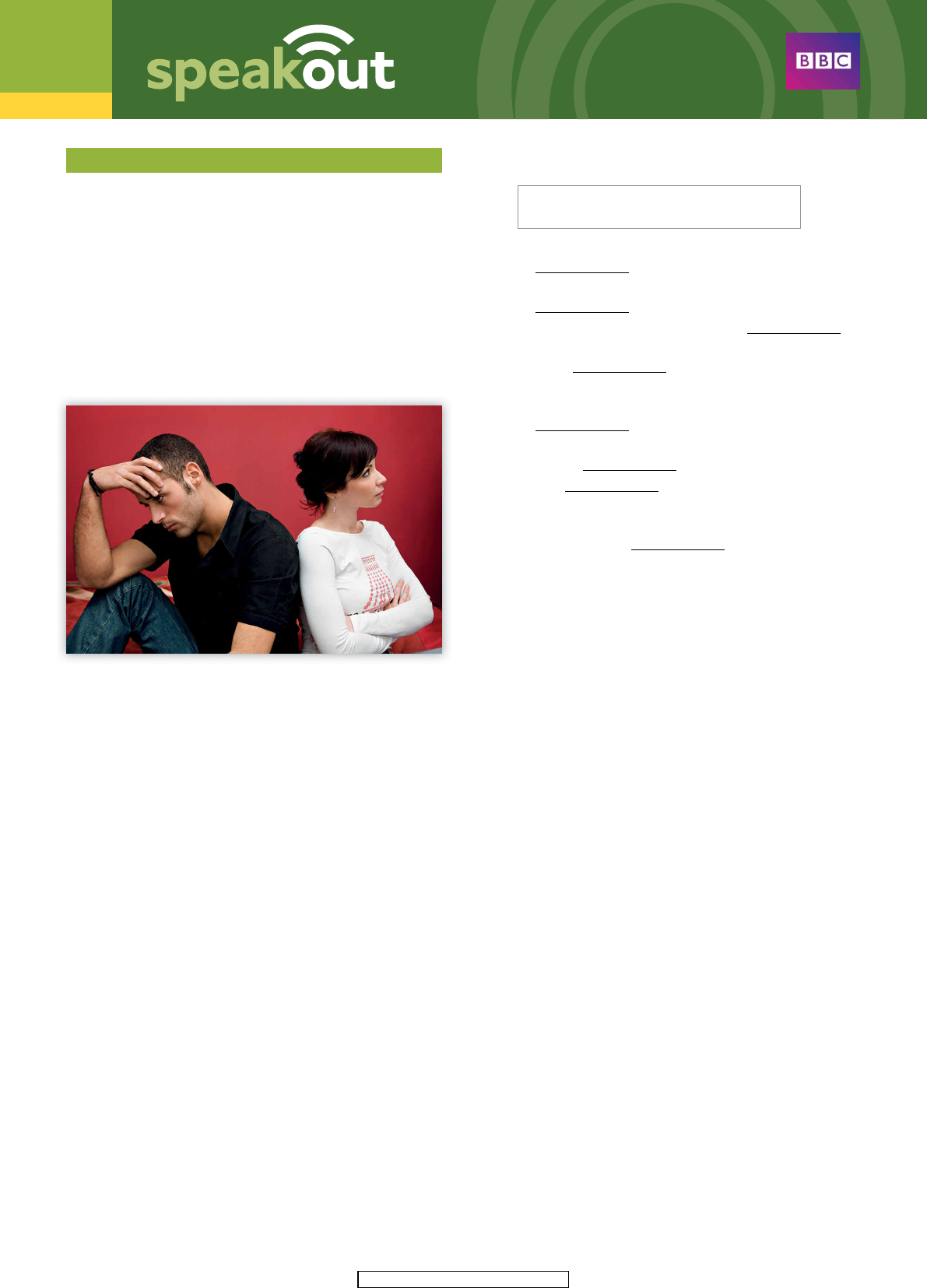 1 © Pearson Education Limited 2016 DVD EXTRA PRE-INTERMEDIATE UNIT 1 1 Work in pairs. Discuss the questions. Which of these are good (G) and which are bad (B) ways to end a relationship? Why? Give reasons. • in person • by text message • by email • on the phone • with a letter • posting on a social networking site • via a friend 2 Watch the DVD and choose the best sentence to summarise the clip, a), b) or c). a) Miranda loves Mike but Mike doesn’t love her. b) Gary and Mike both love Miranda but she doesn’t love either of them. c) Miranda loves Mike but realises she’s in love with Gary. 3 Decide if the sentences below are true (T) or false (F). 1 Gary’s restaurant is called Gary’s . 2 Miranda doesn’t like doughnuts. 3 Miranda’s new friend thinks she should break up with Mike. 4 Stevie thinks Miranda is in love with Mike. 5 Miranda is too direct. 6 Both her friends think it’s a good idea to write Mike a letter. 7 Gary is really stressed and needs help. 8 Miranda is in love with Gary. 4 A Complete the sentences with the words in the box. bean dash freak manly mean skip springs split 1 Please don’t tell my mum what happened, she’ll out! 2 I like your beard, it makes you look very . 3 Oh no, is that the time? I have to , sorry! 4 What to mind when you think of London? 5 I love you so much, you make my heart every time I see you. 6 I’m sorry, I don’t love you anymore. I think we should up. 7 This bag is so comfortable, where did you get it? 8 I think you should apologise to Mandy, what you said was really . B Match words/phrases in Exercise 4A with their meanings a)–h). a) miss a beat b) macho, traditionally male c) the fi rst thing you think of d) a big cushion you can sit on e) not kind f) get very angry or lose control h) leave quickly g) fi nish our relationship 5 A EITHER choose a famous love story you know OR choose one of the love stories below and fi nd out as much as you can about it. Use questions 1–4 to help you. • Pride and Prejudice • Wuthering Heights • Jane Eyre • Antony and Cleopatra • Romeo and Juliet 1 Where is it set? 2 Who are the main characters? 3 What is the plot of the story? 4 How does it end? B Work in groups. Ask and answer questions about the love story you chose. A: I chose Romeo and Juliet. B: Where is it set? A: In Verona, in Italy. 2 © Pearson Education Limited 2016 DVD EXTRA PRE-INTERMEDIATE UNIT 2 1 Work in pairs. Discuss the questions. 1 What are the advantages and disadvantages of having a long journey to work/college every day? 2 Have you ever had a long commute? 3 What’s your favourite way to travel? Why? 2 Watch the DVD. Match the times 1–3 to the places where Justin is a)–c). 1 Friday a� ernoon/evening 2 six o’clock 3 Saturday morning a) boarding the plane b) at home in France c) leaving the o� ce 3 Work in pairs. Watch the DVD again and answer the questions. 1 Which European nationality spends most time travelling to/from work? 2 What is Justin’s job? 3 Which of these is NOT one of the jobs done by the group of commuters? • charity manager • IT worker • hotel operator • marketing manager • BT consultant 4 Why did Justin and his wife decide to move to France? 5 How much are the fl ights if he books early? 6 How long does it take Justin to drive from Toulouse airport to his home? 7 How does Justin feel on Saturday morning? 4 A Complete the extracts with a word from box A and a word from box B. A Euro make transformed river takes tra� c B commuter jams lifestyle move o� view 1 Do you feel like you’re wasting time, sitting in ? 2 But his home is in France. Justin is a . 3 The fl ight . There’s no time for shopping with these guys. 4 So why did you decide to this in the fi rst place? 5 That’s the house down there, with the terrace, with the . 6 We’ve just our . B Watch the DVD again to check. 5 A Choose one of the work-related trends/practices below and fi nd out as much as you can about it. What are the good aspects of each trend/practice? Make notes. • telecommuting • fl exitime • pop-up businesses • zero-hours contracts • call centres B Work in groups. Ask and answer questions about the trend/practice you chose. A: I chose flexitime. B: What is it? A: It’s when you work a number of hours each month, but you can change the time you start or finish your working day. 3 © Pearson Education Limited 2016 DVD EXTRA PRE-INTERMEDIATE UNIT 3 1 Work in pairs. Discuss the questions. 1 What are the most popular things to do/places to visit for visitors to your city? 2 Do you like doing these things too, or are they only for tourists? 3 Where do you usually take people who come to visit you? 2 A Watch the DVD and number the photos in the order you see them. B Label the photos with the items in the box. the view from the cable car ‘Samba da mesa’ looking for exotic fruit 3 A What do these things refer to in the DVD? 1 3.5 2 1 3 2 4 Açaí 5 completely free 6 Lapa B Watch the DVD again to check. 4 Match the words/phrases from the DVD 1–7 with their meanings a)–g). 1 common sights 2 the core 3 fl avours 4 get up to 5 locals 6 poverty 7 slums a) very poor areas b) the particular taste of food and drink c) people who live in an area d) do something e) things you o� en see f ) the situation of being very poor g) the centre 5 A You can fi nd the things below in Rio de Janeiro. What do you think they are? Find out as much as you can about them. • churrasco • mate • Santa Teresa • futevôlei B Work in groups. Ask and answer questions about the things above. Which of the things would you most like to do/taste/visit? A: I chose futevôlei. B: What is it? A: It’s a mixture of football and volleyball. A B C 4 © Pearson Education Limited 2016 DVD EXTRA 4 A Complete the extracts with the words in the box. cracked hang humble matter radical replica rudder 1 Today billions of us can travel across the planet in a of hours. 2 But that everyday miracle started in a 