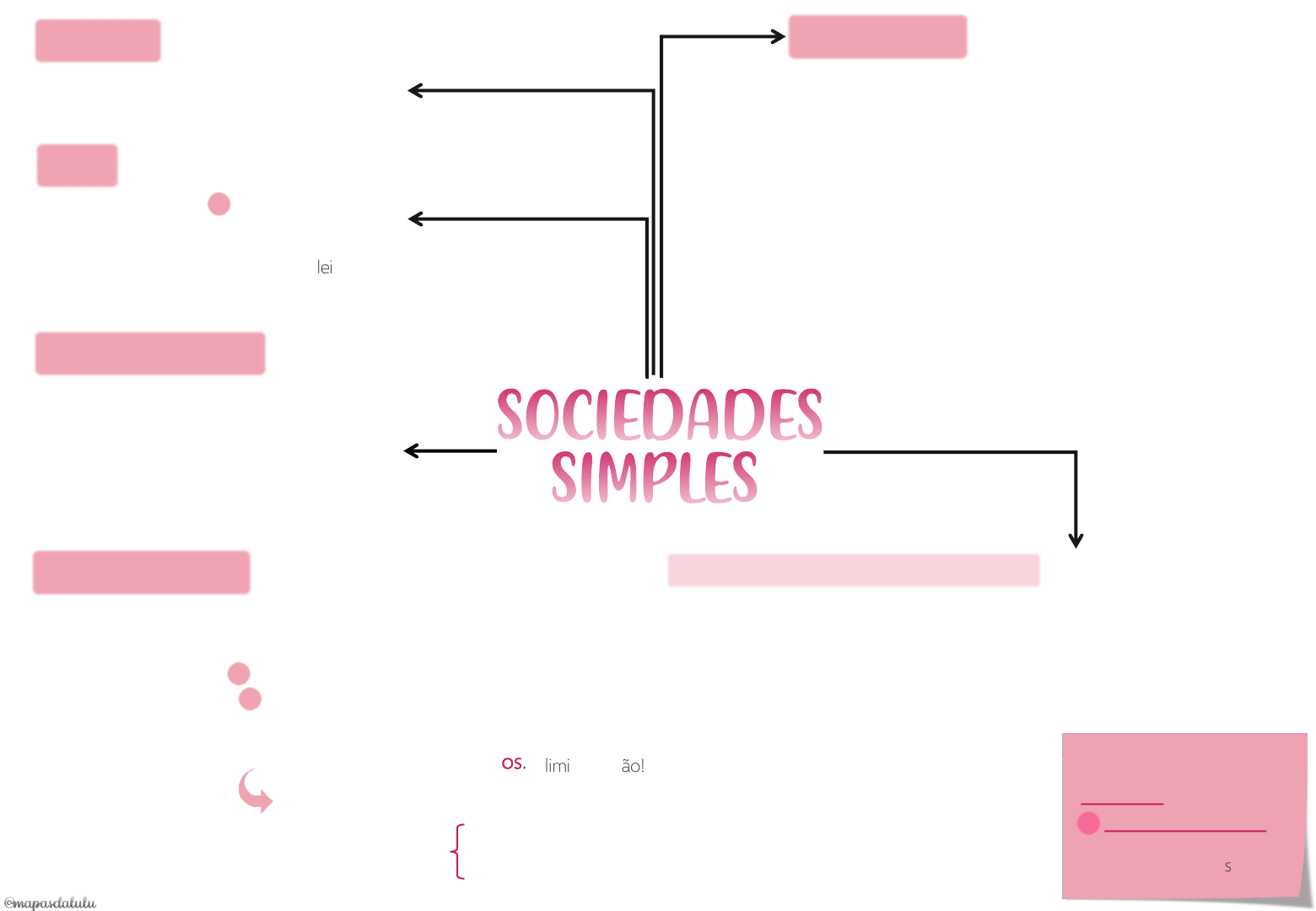 REGISTRO • Registro Civil das Pessoas Jurídicas NOME • Denominação “ss” • Equiparado ao nome empresarial + (Proteção da lei) FORMAS ADOTADAS • Simples pura • Em nome coletivo • Em comandita simples • Limitada sociedades simples SÓCIO REMISSO • O sócio que não integralizar sua quota nos 30 dias após a notificação da sociedade responderá pelo dano emergente da mora. • A maioria dos sócios poderá: • Excluir o sócio remisso CONTRATO SOCIAL • Pode ser público ou particular. • Deve mencionar: • Capital social bens suscetíveis de avaliação pecuniária= =• Administração por pessoa física • Sócios podem ser pessoas físicas ou jurídicas • Contribuição dos sócios pode ser em serviços. Na sociedade limitada, não! Em regra, esse sócio não pode empregar-se em atividade estranha à sociedade ( ) • Todos os sócios devem participar de lucros e perdas MODIFICAÇÃO DO CONTRATO SOCIAL • Consentimento unânime: • Dados dos sócios • Denominação, sede, objeto, prazo • Capital social • Quota de cada sócio • Contribuição por serviços • Participação em lucros e perdas • Sócios responderem ou não pelas obrigações • Demais assuntos: maioria absoluta. Decisões sobre os negócios da sociedade maioria dos votos= Segundo o valor das quotas )( • Reduzir sua quota ao valor já realizado. RESPONSABILIDADE DOS SÓCIOS • Os sócios podem limitar a responsabilidade entre si, à proporção do capital social. • Pode ser limitada ilimitada Previsão expressa( (Regra geral ) ) É o padrão, caso o contrato social seja silente. CESSÃO DE QUOTAS • É possível a cessão de quotas sociais, desde que: • Concordem os demais sócios • Averbado o registro ( É sociedade de pessoas ) tempo Saída da sociedade 2 anos O sócio que saiu responde pelas obrigações que tinha antes da saída. • O sócio admitido à sociedade já constituída não se eximirá das dívidas sociais anteriores. DISTRIBUIÇÃO DE LUCROS • Conforme estipulações no contrato social. CLÁUSULA LEONINA Nenhum sócio pode ser excluído da distribuição de lucros. DISSOLUÇÃO DA SOCIEDADE JUDICIAL A requerimento dos sócios( ) • Extinção da autorização para funcionar • Anulada sua constituição • Exaurido o fim social • Verificada sua inexequibilidade EXTRAJUDICIAL • Falta de pluralidade de sócios não restituída em até 180 dias. • Dissolução antes do prazo unanimidade • Se vencido o prazo, a sociedade não entrar em liquidação será prorrogada por tempo indeterminado. • Regra geral: participação proporcional às respectivas quotas. • Sócio que só participa com serviços: na proporção da média do valor das quotas. • Por maioria absoluta dos sócios. sociedades simples SOCIEDADE DE PRAZO DETERMINADO SOCIEDADE DE PRAZO INDETERMINADO • Expõe a vontade da sociedade. • Administração só por pessoa física + ser feita com cuidado e diligência. ASPECTOS GERAIS ADMINISTRADOR POR ATO SEPARADO • Instrumento deve ser averbado à margem da inscrição. Administrador responde pessoal e solidariamente com a sociedade pelos atos anteriores à averbação. • Seus poderes são revogáveis a qualquer tempo. VEDAÇÕES Não podem ser administradores: • Impedidos por lei especial • Condenados a pena que vede o acesso a cargos públicos • Condenados por: Enquanto perdurar o efeito da condenação( ) • Crime falimentar • Prevaricação, peita, suborno • Concussão • Peculato • Crime contra Economia popular Sistema Financeiro Nacional Concorrência Relações de consumo Fé pública Propriedade ADMINISTRAÇÃO= = SÓCIO-ADMINISTRADOR • São irrevogáveis os poderes do sócio investido na administração pelo contrato social. Salvo justa causa • O sócio não pode ser substituído em suas funções sem consentimento dos demais. INVESTIDO POR ATO SEPARADO • Revogáveis a qualquer tempo. INVESTIDO PELO CONTRATO SOCIAL ATOS DE COMPETÊNCIA CONJUNTA • Em regra: concurso de todos. • Exceção: atos urgentes. (Omissão ou retardo dano grave ouirreparável )= LIMITES DE ATUAÇÃO • Administrador deve agir dentro dos limites do contrato social. com excesso de poder A sociedade pode opor esse argumento a terceiros Haverá responsabilidade pessoal do administrador Se ocorrer uma das hipóteses: • Limitação no registro da sociedade, ou • Prova de que o terceiro conhecia, ou • A operação foi nitidamente estranha ao objeto da sociedade sociedades simples Se administrador agir