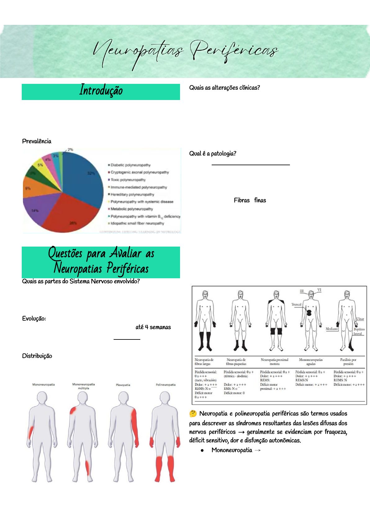 Sandy Vanessa Med 08 - UFPE-CAA Introdução ● Doenças que acometem os nervos periféricos causando disfunção em nervos sensitivos, motores e autonômicos Prevalência→ 2100/100.000 Questões para Avaliar as Neuropatias Periféricas Quais as partes do Sistema Nervoso envolvido? ● Somático, autonômico ou ambos ● Motor, sensitivo ou ambos Evolução: ● Aguda→Guillain-Barré, porfiria→ até 4 semanas ● Subaguda e crônica→DM, hanseníase→ >4 semanas Distribuição ● Predominantemente distal ou proximal, ou ambos ● Dermátomo, plexo, radicular Quais as alterações clínicas? ● Sinais, sintomas, exame físico (força muscular, sensibilidade, reflexos, etc..) ● Condições médicas → doenças relatadas, medicações usadas ● História familiar Qual é a patologia? ● Axonal, desmielinizante ou mista ● Neuropatias sensitivas→ destruição das fibras neurais de diâmetro pequeno ou grande → + comum a combinação de fibras afetadas. ○ Fibras finas → em geral tem disfunção autonômica associada → associada ao diabetes melito, à amiloidose, à doença de Fabry e à hanseníase lepromatosa. ○ Fibras grossas→ menos prevalente, mas está associada a intoxicação por tálio, ganglioneurite paraneoplásica, doença de Sjögren, toxicidade da piridoxina (vitamina B6) e sífilis. 🤔 Neuropatia e polineuropatia periféricas são termos usados para descrever as síndromes resultantes das lesões difusas dos nervos periféricos → geralmente se evidenciam por fraqueza, déficit sensitivo, dor e disfunção autonômicas. ● Mononeuropatia → acometimento de um único nervo → consequência de traumatismo, compressão ou encarceramento local. 1 Sandy Vanessa Med 08 - UFPE-CAA ● Mononeuropatia múltipla → acometimento focal de dois ou mais nervos→ doença sistêmica como diabetes melito ou vasculite. Sintomas Associados ● Queimação→DM ● Polineuropatia → dor, parestesias, fraqueza e déficit sensitivo distais. A dor pode ser espontânea ou desencadeada pela estimulação da pele e pode ser do tipo cortante ou ardente. ● Perda da sensibilidade à dor pode acontecer com as lesões traumáticas repetitivas associadas à degeneração das articulações (artropatia ou articulações de Charcot) e com as úlceras crônicas. Padrão de comprometimento: ● Simétrica → polirradiculoneuropatias(GB) ● Assimétricas → focal/traumática, mononeuropatias múltiplas (vasculite) Padrão de comprometimento de fibras sensitivas, motoras, autonômicas, fibras finas. ● Distribuição ○ Proximal→ polirradiculoneuropatia ○ Distal→Charcot Marie Tooth ● Tipo de lesão ○ Axonal→ mercúrio, porfiria ○ Desmielinizante→ polirradiculoneurites ● Causas ○ Adquiridas (DM, hanseníase, drogas) ○ Hereditárias (Charcot Marrie Tooth) Neuropatia motora ● 2º neurônio ou inferior (corno da medula) → Fraqueza, atrofia, fasciculações, cãibra ● 1º neurônio ou superior → fraqueza, atrofia, espasticidade (tônus aumentado, reflexo aumentado) Neuropatia sensitiva → parestesias, dor, queimação, choque, hipersensibilidade, hipoestesia, instabilidade postural Polineuropatias proximal motora simétrica ● Síndrome Guillain Barré → Polirradiculoneurite inflamatória desmielinizante aguda ● É de caráter ascendente, podendo comprometer a musculatura respiratória ● Muito comum no COVID → SARS-CoV-2 → neurotrópico com entrada pelo trato olfativo ● Polirradiculoneurite inflamatória desmielinizante crônica (PIDC): Guillain Barré que cronifica ● Porfiria ● DM ● Intoxicação/arsênico ● HIV/AIDS Polineuropatia sensitivo motora simétrico distal Endócrinas ● DM, hipotireoidismo Nutricional ● Deficiência de B12 Polineuropatia do doente crítico→ PRN Infecciosa ● AIDS Autoimune ● Sarcoidose Neuropatia tóxica ● Acrilamida, tolueno, mercúrio Drogas ● Alfainterferona Inspeção ● Pé cavo→ sinal de polineuropatia ○ Charcot Marie Tooth ● Pé de Charcot→ abaulamento no pé = DM 2 Sandy Vanessa Med 08 - UFPE-CAA ● Pernas em garrafa de champagne invertida (lipodermatoesclerose) ● Alteração da coloração da pele, presença de peles, atrofia Acometimento Neurônio Pode acometer a mielina ou o axônio. O DM pode acometer os 2 locais. Acometimento axonal: ● Neuropraxia ○ + comum por insulto leve, resultando em desmielinização focal, sem degeneração axônica associada. ○ Bloqueio da condução focal transitório através da lesão. ○ O axônio distal ao local de lesão permanece intacto, e o nervo mantém a sua continuidade. ○ Pode se manifestar na forma de fraqueza ou perda sensitiva na distribuição anatômica do nervo afetado. ○ Não há necessidade de nenhuma intervenção terapêutica específica ○ Pessoas bêbadas que dormem de todo jeito ● Axonotmesis → destruição do axônio , podendo ficar mielina → consiste de interrupção anatômica do axônio, sem interrupção, ou com uma interrupção parcial somente da estrutura do tecido conectivo ○ Ocorre durante lesões por esmagamento, distensão ou percussão, como ferimentos por arma de fogo, em que a lesão é causada, com mais frequência, pelo calor indireto e onda de choque da bala, e não por transecção. ○ Resultam em dano irreversível aos elementos axônicos, incluindo a bainha de mielina, com consequente degeneração distal. ○ As estruturas de sustentação, como o epineuro, o perineuro e, algumas vezes, o endoneuro, permanecem intactas. ○ O prognóstico para as lesões axonotméticas depende de vários fatores → grau de ruptura da estrutura interna do nervo, distância do órgão-alvo e as características particulares do nervo lesionado. ● Neurotmese → ruptura total do axônio, incluindo a destruição do nervo →DM ○ Perda completa de continuidade do nervo. 3 Sandy Vanessa Med 08 - UFPE-CAA ○ Todas as camadas de tecido conjuntivo, o axônio e a bainha de mielina sofrem 