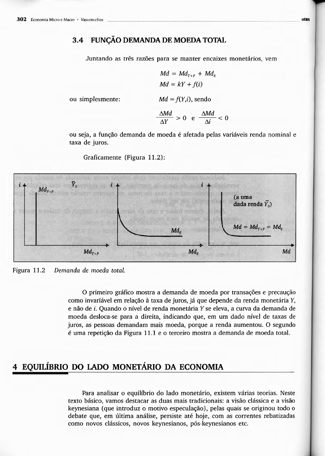 302 Economia M icro e Macro • V a s c o n c c llo s _______________________________________________________________________________________________________________________ atlas 3.4 FUNÇÃO DEMANDA DE MOEDA TOTAL Juntando as três razões para se manter encaixes monetários, vem Md = MdT+p + MdF Md = k Y + f ( i ) ou simplesmente: Md = /(Y,í), sendo AMd AMd > 0 e — t~- < 0 AY Al ou seja, a função demanda de moeda é afetada pelas variáveis renda nominal e taxa de juros. Graficamente (Figura 11.2): (a uma dada renda Y0) Md = Mdr+P = Mde * MdTyP MdE Md Figura 11.2 Demanda de moeda total. O primeiro gráfico mostra a demanda de moeda por transações e precaução como invariável em relação à taxa de juros, já que depende da renda monetária Y, e não de i. Quando o nível de renda monetária Y se eleva, a curva da demanda de moeda desloca-se para a direita, indicando que, em um dado nível de taxas de juros, as pessoas demandam mais moeda, porque a renda aumentou. O segundo é uma repetição da Figura 11.1 e o terceiro mostra a demanda de moeda total. 4 EQUILÍBRIO DO LADO MONETÁRIO DA ECONOMIA_____________ Para analisar o equilíbrio do lado monetário, existem várias teorias. Neste texto básico, vamos destacar as duas mais tradicionais: a visão clássica e a visão keynesiana (que introduz o motivo especulação), pelas quais se originou todo o debate que, em última análise, persiste até hoje, com as correntes rebatizadas como novos clássicos, novos keynesianos, pós-keynesianos etc. w atlas O Lado M onetário da Economia 3 0 3 Em ambos os casos, supõe-se normalmente que oferta de moeda (A í) é constante (ou inelástica) em relação à taxa de juros. Ou seja, a oferta de moeda é fixada institucionalmente, o que significa que ela depende da política do Ban co Central e do governo (por exemplo, se adota políticas recessivas ou de cresci mento). Isto é, ela é fixada pelo governo e não é afetada pela taxa de juros i. Graficamente (Figura 11.3): Figura 11.3 Oferta de moeda. 4.1 EQUILÍBRIO DO LADO MONETÁRIO PELA TEORIA CLÁSSICA: A TEORIA QUANTITATIVA DA MOEDA • oferta de moeda: Aí, = M° • demanda de moeda: Md = kPy • equilíbrio: Aí° = M s = Md e Aí° = kPy A equação A/° = kPy também pode ser escrita como: Aí° = —7 7 — • Py ou V J que é a equação quantitativa da moeda, ou Teoria Quantitativa da Moeda, sendo V a velocidade-renda da moeda, que é o número de “giros” que uma unidade monetária dá, criando renda durante certo período de tempo. É o inver so do coeficiente marshalliano (/c é a retenção de moeda, enquanto V é a utiliza ção da moeda, em relação à renda nacional). Como M°V = Py, podemos escrever: Py fluxo de renda nacional nominalV = — í— = --------------------------------------------- Aí° estoque de moeda Então, se, por exemplo, M° = 60.000 Py = Y = 1.440.000 segue que L440000_ 60.000 M V = Py 1 3 0 4 Economia M icro c Macro • Vasconcellos Ou seja, a moeda circulou 24 vezes no decorrer de um ano para criar 1.440.000 de renda, fsso mostra que, para gerar uma renda de 1.440.000 num ano, não são necessários 1.440.000 em moeda (ou meios de pagamento'), dado que o estoque de dinheiro circula, passando de mão em mão, gerando renda nesse processo. No Brasil, em dezembro de 1998, a velocidade-renda da moeda foi igual a PIB = R$ 899.814 milhões M l R$ 50.707 milhões ’ Na teoria clássica, V é considerado relativamente estável ou constante a cur to prazo, já que depende de alguns parâmetros que se modificam lentamente, tais como hábitos da coletividade (quanto maior a utilização de cheques e cartões de crédito, menor a necessidade de reter moeda) e o grau de ver ticalização da economia (por exemplo, quando a Ford comprou a Philco, dimi nuiu sua necessidade de manter moeda em caixa, dado que as operações en tre Ford e Philco passaram a ser meramente contábeis, no âmbito do próprio grupo). Por raciocínio análogo, a terceirização também afeta a velocidade da moeda. A equação quantitativa MV = Py revela simplesmente que, ao multiplicar a quantidade de moeda M pela velocidade V com que ela cria renda, teremos a própria renda nominal Py. Nesse sentido, é uma tautologia ou truísmo (uma verdade em si mesma), que decorre simplesmente da maneira como a defini mos. Ou seja, uma identidade contábil. Passa a ser uma teoria monetária, quan do estabelecemos hipóteses sobre o comportamento das variáveis no contexto de uma relação de causa e efeito (se V é ou não constante, se y está ou não a pleno emprego etc.).8 4.2 EQUILÍBRIO DO LADO MONETÁRIO NA VISÃO KEYNESIANA • oferta de moeda: M — M'> S • demanda de moeda: M = f (Y ,i) • equilíbrio: M° = M = Md e M° = f(Y ,i) 8 Uma versão anterior da Teoria Quantitativa da Moeda (a versão original) era apresentada da seguinte forma: MV = PT onde T é o volume total de transações (e não apenas as transações que criavam renda) e V a velocidade de circulação da moeda ou velocidade de transações da moeda. Evidentemente, como a velocidade de circulação envolve transações com todos os bens e serviços, inclusive intermediários, ela é maior que a velocidade-renda da moeda. O Lado M onetário da Economia 3 0 5 Graficamente (Figura 11.4): i ^ Md (a um dado nível de renda y0) * M M° Figura 11.4 Equilíbrio do lado monetário pela Teoria Keynesiana. Como se observa, a teoria keynesiana da moeda depende da elasticidade ou sensibilidade da demanda de moeda em relação à taxa de juros. Na teoria clás sica, a demanda de moeda seria completamente inelástica em relação à taxa de juros (ou seja, simplesmente a taxa de juros não seria relevante para explicar o comportamento da demanda de moeda). Por esse motivo, na concepção keynesiana, a taxa de juros é o resultado do equilíbrio entre a oferta e a deman da de moeda. 5 EFEITOS DA POLÍTICA MONETÁRIA SOBRE NÍVEL DE RENDA E DE PREÇOS__________________________