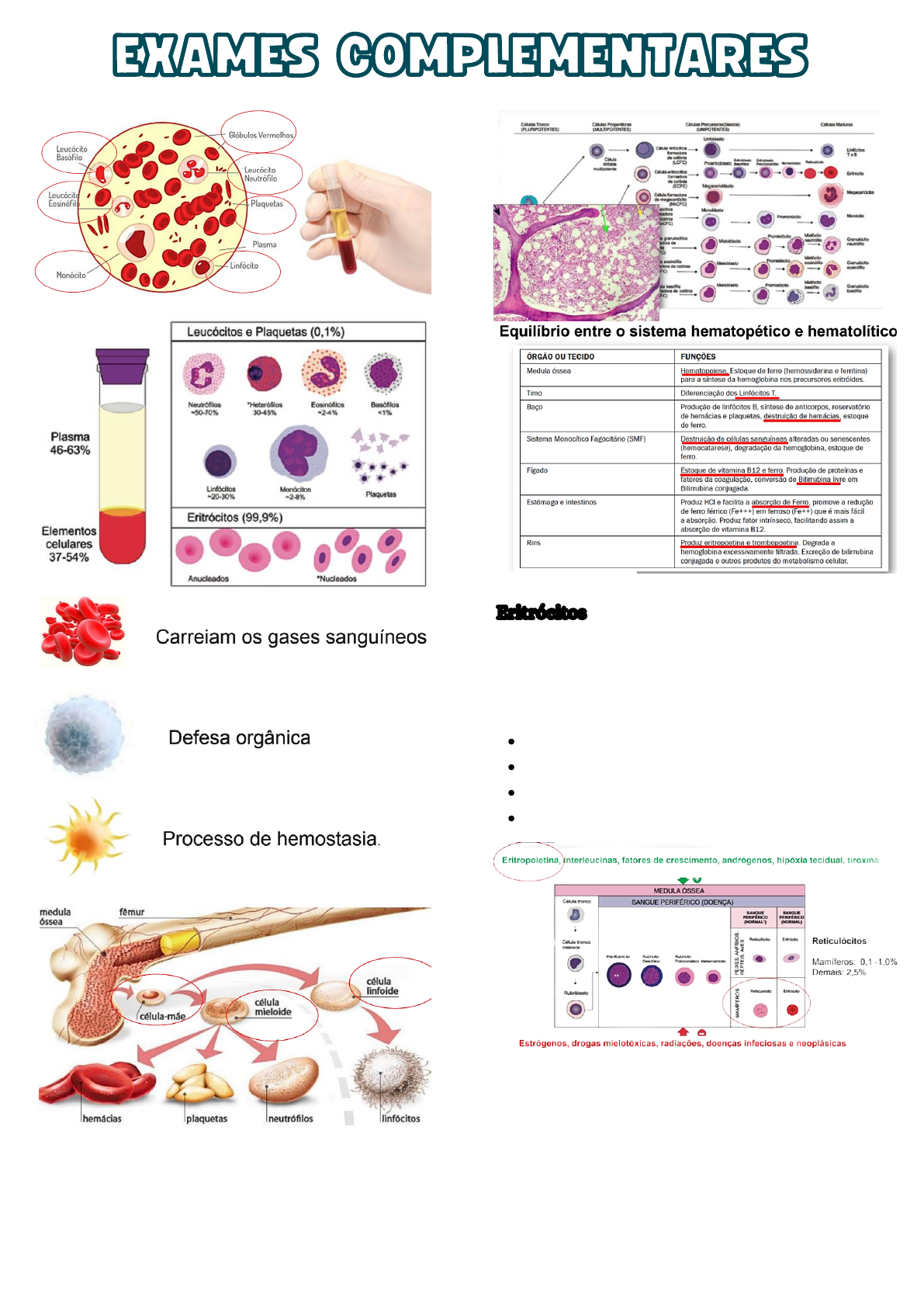 EXAMES COMPLEMENTARESEXAMES COMPLEMENTARES EritrócitosEritrócitos Mamíferos: anucleadas, bicôncavas e sem organelas. Aves, Répteis, anfíbios e peixes: nucleadas. Composição: 61% de água. 32% de proteína (hemoglobina). 7% de carboidratos. 0,4% de lipídios. hemácias devem ser avaliadas quantohemácias devem ser avaliadas quanto Formato: As hemácias podem variar em formato dependendo da espécie e de possíveis condições de saúde. Em mamíferos, as hemácias são geralmente redondas e bicôncavas, mas podem apresentar variações em diferentes espécies. Tamanho: O tamanho das hemácias também pode variar entre as espécies e pode ser avaliado através do Volume Globular Médio (VGM) ou Volume Corpuscular Médio (VCM). Coloração: A coloração das hemácias pode ser avaliada através da Concentração de Hemoglobina Corpuscular Média (CHCM). Isso pode indicar se as hemácias são normocrômicas, hipocrômicas ou hipercrômicas. Alterações Morfológicas e Corpúsculos de Inclusão: Corpúsculos de Heinz: São estruturas redondas que se formam na membrana interna das hemácias devido à oxidação da hemoglobina. Gatos: Em gatos, os corpúsculos de Heinz não estão diretamente relacionados com anemia e são encontrados em cerca de 5% dos casos. Cães: Nos cães, a presença de corpúsculos de Heinz está associada a anemias hemolíticas, mas não é esperada em animais saudáveis. Esquistócitos: São fragmentos de hemácias com formatos diversos, causados por deterioração mecânica. Em situações de saúde, eles podem não ser importantes, mas em casos de CID (Coagulação Intravascular Disseminada) ou anormalidades microvasculares, sua presença pode ser significativa. Reticulócitos: São jovens glóbulos vermelhos que indicam uma resposta da medula óssea à intensidade da anemia. Em cães, sua presença é inferior a 1,5%, enquanto em gatos é rara. Ruminantes raramente apresentam reticulócitos, e em equinos eles não são observados. Agregados: jovens/ recente (12 horas) Ponteados: tempo já passou (10 dias), felinos. Eliptócitos ou Ovalócitos: São hemácias com formato alongado devido à membrana delgada. Em camelídeos, isso é considerado normal, mas em outras espécies pode indicar anemias hemolíticas. Esferócitos: São hemácias que perderam o formato bicôncavo devido à perda de membrana. São comuns em situações de AHIM (Anemia Hemolítica Imediata e Maciça). Dacriócitos: São hemácias com formato de lágrima devido ao estiramento da membrana. Podem ser observados em casos de anemias hemolíticas e fibrose medular Células em Alvo (Codócitos): Apresentam excesso de membrana, formando um anel central claro. São associadas a doenças hepáticas. Hemácias Crenadas: Apresentam projeções múltiplas na membrana. Podem estar presentes em casos de glomerulopatias, envenenamento crotálico, queimaduras graves, picadas de abelha, depleção de eletrólitos, gastroenterites em cães e cólica em equinos. A coleta inadequada de sangue, com uso excessivo de EDTA ou sangue envelhecido, também pode levar à formação de hemácias crenadas. Acantócitos: São hemácias com protuberâncias múltiplas. Estão associados a alterações na composição de colesterol e fosfolipídios, alterações hepáticas e hemangiossarcomas. São mais comuns em cães e gatos. Corpúsculo de Lentz: Causado pelo efeito citopático do vírus da cinomose, é uma inclusão eosinofílica presente também em leucócitos. Roleaux Eritrocitário: Refere-se à aglomeração das hemácias em pilhas, perdendo a capacidade de repulsão. Pode ocorrer em situações de doenças infeciosas e inflamatórias. Em equinos, é considerado fisiológico, enquanto em búfalos e felinos há uma tendência em formar o roleaux eritrocitário. Pontilhado Basofílico: Refere-se a pequenas inclusões basofílicas nas hemácias. Pode ser observado em casos de deseritropoiese, plumbismo e durante a regeneração eritrocitária em ruminantes. Aglutinação de Hemácias: Consiste na formação de grumos de hemácias, observados em casos de AHIM e transfusões incompatíveis. Erros pré-analíticos, como demora na coleta do material ou homogeneização inadequada, também podem levar à aglutinação das hemácias. ANEMIA NÃO É DIAGNÓSTICO. É uma condição clínico-hematológica caracterizada pela diminuição do número de eritrócitos e/ou dos níveis de hemoglobina no sangue, podendo ou não estar acompanhada de redução do hematócrito. Suspeita de Anemia Mascarada por Desidratação: Em alguns casos, a anemia pode estar mascarada pela desidratação, especialmente quando há sinais de regeneração sem anemia, desidratação clínica, hiperproteinemia e valores próximos ao limite inferior. Anemia Falsa por Hemodiluição: Pode ocorrer em situações como gestação, lactação, filhotes e fluidoterapia desbalanceada. Fatores Fisiológicos Relacionados ao Animal que Influenciam no Eritrograma: Idade (jovens têm maior atividade hematopoiética), sexo (machos geralmente têm maiores valores eritrocitários), altitude (pode aumentar os valores eritrocitários), raça (cavalos sanguíneos versus cavalos linfáticos), exercício (contração esplênica) e estado fisiológico (gestação e lactação). Etiologias Comuns de Anemia: Podem ser de origem infecciosa (como mycoplasmose, leptospirose, leishmaniose, erliquiose, babesiose e Anemia Infecciosa Equina - AIE), traumática (acidentes automobilísticos, cirurgias cruentas), ou oncogênica (leucemia associada ao vírus da FELV, hemangiossarcomas). Sinais Clínicos de Anemia: Incluem palidez de mucosas e órgãos, cianose, letargia, fraqueza, intolerância ao exercício, síncope, taquipneia e taquicardia. Classificação da Anemia: Pode ser feita levando em consideração vários aspectos, como o mecanismo fisiopatológico, valor do hematócrito, grau de regeneração medular, tamanho das hemácias, teor de hemoglobina e análise qualitativa celu