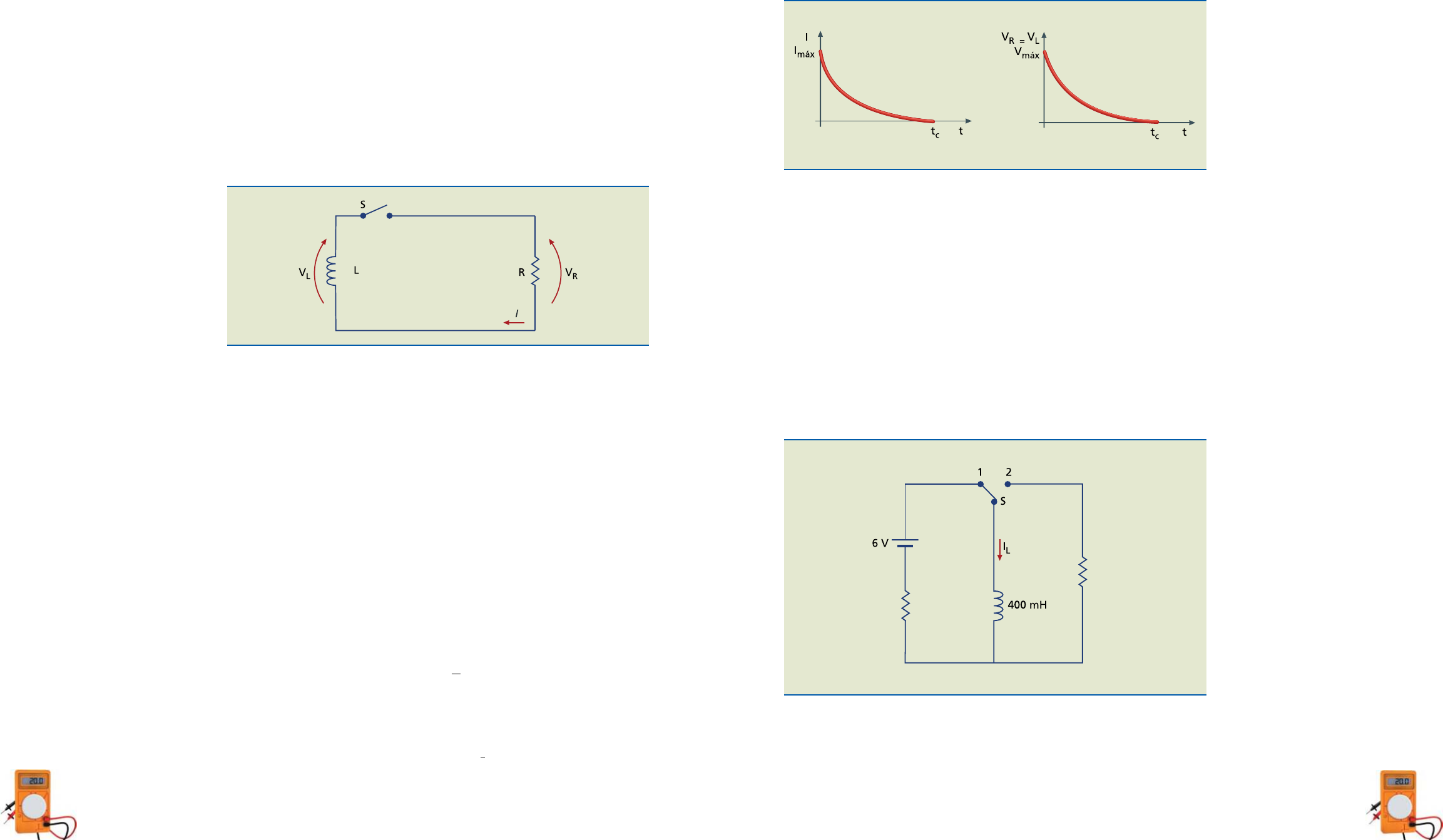 CAPÍTULO 10ELETRôNICA 1 190 191 A figura 10.36 mostra graficamente a variação da corrente e da tensão em função do tempo. Da mesma forma, fazendo a análise matemática das equações, verifica-se que o tempo gasto para desenergizar totalmente o indutor é igual a 5τ (observado experimentalmente). Assim: td = tempo de desenergização = 5τ Exemplo Determine o gráfico de i(t) para o circuito da figura 10.37, no intervalo de 0 a 6 ms, destacando os pontos de 1 em 1 milissegundo. Sabe-se que a chave S é co- locada na posição 1 em t = 0, permanecendo durante 3 ms nessa posição antes de passar para a posição 2, onde se mantém indefinidamente. Considere que o indutor está desenergizado no início. Solução: De 0 a 3 ms (figura 10.38): chave na posição 1 (circuito para energizar o indutor). Figura 10.36 Variação da tensão e da corrente em circuito com indutor energizado. 400 Ω 200 Ω Figura 10.37 finais de tensão e corrente pretendidos. Portanto, é possível afirmar que o tempo necessário para o indutor se energizar plenamente é igual a 5τL, o que pode tam- bém ser observado experimentalmente. Em resumo: • t = 0: o indutor está desenergizado; comporta-se como circuito aberto. • t = 5τL: o indutor está energizado; comporta-se como curto-circuito. Circuito para energizar o indutor Consideremos o indutor energizado, com corrente imáx, que pode ou não ser a máxima corrente determinada no circuito de energização (figura 10.35). Com o fechamento da chave S, o indutor passa a se comportar como fonte de corrente para o circuito, fornecendo corrente à resistência R e dando origem à tensão VR, a partir de um valor máximo e decrescendo exponencialmente até zero. Considerando t = 0 o exato instante do fechamento da chave S, tem-se: i = imáx VR = VRmáx = Rimáx VL = VR = VRmáx = Rimáx Nos instantes imediatamente posteriores ao fechamento da chave S, a variação da tensão e da corrente no circuito segue uma função exponencial, que depende da constante de tempo τL do indutor. Logo: i i e máx t L = − τ Portanto: V V V e R L máx t = = − τ Figura 10.35 circuito com indutor inicialmente energizado. CAPÍTULO 10ELETRôNICA 1 192 193 τ τ L L Lmáx t t L R mH ms i t i e e eL 2 2 3 2 400 200 2 14 25 14 25 = = = = = = − − − Ω ( ) , , ( ) (( )3 2 − t Para t = 3 ms = iL(3) = 14,25 mA Esse é o valor com que o indutor se energiza no último instante da chave na posição 1. Para t = 4 ms ⇒ = = − i e mAL ( ) , ,4 14 25 8 64 3 4 2 Para t = 5 ms ⇒ = = − i e mAL ( ) , ,5 14 25 5 94 3 5 2 Para t = 6 ms ⇒ = = − i e mAL ( ) , ,6 14 25 3 18 3 6 2 Com esses dados, pode-se construir o gráfico da variação da corrente em função do tempo (figura 10.40). Figura 10.40 τL Lmáx L Lmáx t L R mH ms i E R V mA i t i e 1 1 400 400 1 6 400 15 1 = = = = = = = − − Ω Ω ( ) ( ττL e t ) ( )= ⋅ − − − 15 10 13 1 Note que, na última expressão e nas seguintes, t e τ estão expressos na mesma unidade (ms). Para t = 1 ms ⇒ iL(1) = 15 · 10–3 · (1 – e–1/1) ⇒ iL(1) = 9,48 mA Para t = 2 ms ⇒ iL(2) = 15 · 10–3 · (1 – e–2) ⇒ iL(2) = 12,97 mA Para t = 3 ms ⇒ iL(3) = 15 · 10–3 · (1 – e–3/1) ⇒ iL(3) = 14,25 mA De 3 ms em diante (figura 10.39): chave na posição 2 (circuito para desenergizar o indutor). 400 Ω Figura 10.38 200 Ω Figura 10.39 Capítulo 11 Corrente alternada