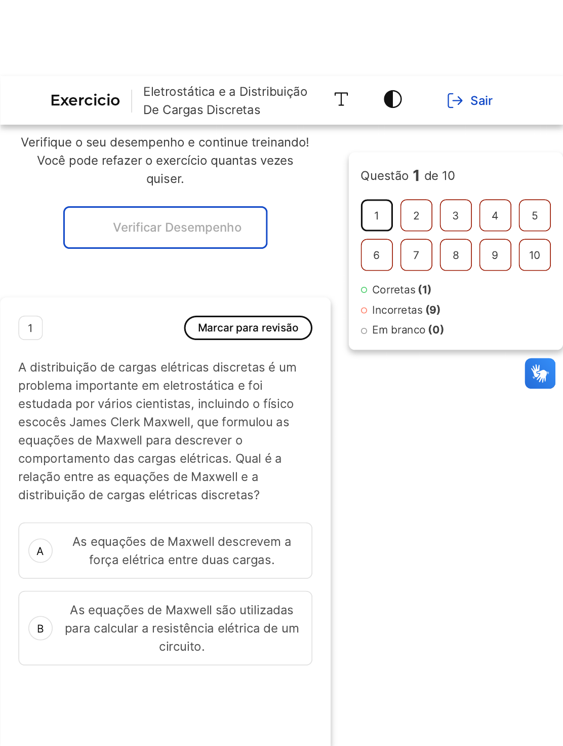 4/15/24, 1:22 PM estacio.saladeavaliacoes.com.br/exercicio/661d5432257ea9c026b1ca9a/gabarito/ https://estacio.saladeavaliacoes.com.br/exercicio/661d5432257ea9c026b1ca9a/gabarito/ 1/15 Você acertou 1 de 10 questões Verifique o seu desempenho e continue treinando! Você pode refazer o exercício quantas vezes quiser. Verificar Desempenho A B 1 Marcar para revisão A distribuição de cargas elétricas discretas é um problema importante em eletrostática e foi estudada por vários cientistas, incluindo o físico escocês James Clerk Maxwell, que formulou as equações de Maxwell para descrever o comportamento das cargas elétricas. Qual é a relação entre as equações de Maxwell e a distribuição de cargas elétricas discretas? As equações de Maxwell descrevem a força elétrica entre duas cargas. As equações de Maxwell são utilizadas para calcular a resistência elétrica de um circuito. Questão 1 de 10 Corretas �1� Incorretas �9� Em branco �0� 1 2 3 4 5 6 7 8 9 10 Exercicio Eletrostática e a Distribuição De Cargas Discretas Sair 4/15/24, 1:22 PM estacio.saladeavaliacoes.com.br/exercicio/661d5432257ea9c026b1ca9a/gabarito/ https://estacio.saladeavaliacoes.com.br/exercicio/661d5432257ea9c026b1ca9a/gabarito/ 2/15 C D E As equações de Maxwell descrevem o comportamento das cargas elétricas em movimento. As equações de Maxwell descrevem a relação entre o campo elétrico e a densidade de cargas elétricas. As equações de Maxwell são utilizadas para calcular a corrente elétrica em um circuito. Resposta correta Parabéns, você selecionou a alternativa correta. Confira o gabarito comentado! Gabarito Comentado As equações de Maxwell são um conjunto de quatro equações que descrevem o comportamento do campo elétrico e do campo magnético em presença de cargas elétricas e correntes elétricas. A terceira equação de Maxwell (também conhecida como Lei de Gauss) descreve a relação entre o campo elétrico e a densidade de cargas elétricas. Essa equação é fundamental para o estudo da distribuição de cargas elétricas discretas e permite calcular o campo elétrico gerado por uma distribuição de cargas elétricas em um ponto específico. 4/15/24, 1:22 PM estacio.saladeavaliacoes.com.br/exercicio/661d5432257ea9c026b1ca9a/gabarito/ https://estacio.saladeavaliacoes.com.br/exercicio/661d5432257ea9c026b1ca9a/gabarito/ 3/15 A B C D E 2 Marcar para revisão Quando uma carga elétrica é colocada em um campo elétrico, ela sofre a ação de uma força elétrica que pode ser repulsiva ou atrativa, dependendo dos sinais das cargas envolvidas. O que acontece com uma carga de prova positiva em uma região de campo elétrico repulsivo? Ela se move em direção à posição de potencial negativo. Ela se move em direção à posição de potencial positivo. Ela se mantém em repouso. Ela se move em direção à posição do potencial neutro. Ela se move em direção à carga que cria o campo elétrico repulsivo. Resposta incorreta Opa! A alternativa correta é a letra D. Confira o gabarito comentado! Gabarito Comentado Como a carga de prova é positiva e o campo elétrico é repulsivo, ela tende a se afastar da fonte do campo elétrico. A posição onde a carga de prova fica em equilíbrio é aquela em 4/15/24, 1:22 PM estacio.saladeavaliacoes.com.br/exercicio/661d5432257ea9c026b1ca9a/gabarito/ https://estacio.saladeavaliacoes.com.br/exercicio/661d5432257ea9c026b1ca9a/gabarito/ 4/15 A B C que o campo elétrico é nulo, ou seja, a posição de potencial neutro. 3 Marcar para revisão A radiação luminosa é uma forma de radiação eletromagnética, que pode ser visualizada pelos nossos olhos. O campo eletrostático, por outro lado, é um campo constante de ação a distância, que não pode ser visto diretamente, mas cujos efeitos na matéria podem ser observados. Qual é a diferença entre a radiação luminosa e o campo eletrostático? A radiação luminosa é uma forma de energia térmica, enquanto o campo eletrostático é uma forma de energia elétrica. A radiação luminosa é um campo elétrico constante, enquanto o campo eletrostático é uma forma de radiação eletromagnética. A radiação luminosa pode ser vista diretamente pelos nossos olhos, enquanto o campo eletrostático não pode ser visto, mas seus efeitos podem ser observados. 4/15/24, 1:22 PM estacio.saladeavaliacoes.com.br/exercicio/661d5432257ea9c026b1ca9a/gabarito/ https://estacio.saladeavaliacoes.com.br/exercicio/661d5432257ea9c026b1ca9a/gabarito/ 5/15 D E A radiação luminosa é uma forma de onda sonora, enquanto o campo eletrostático é uma forma de onda de luz. A radiação luminosa é uma forma de energia magnética, enquanto o campo eletrostático é uma forma de energia térmica. Resposta incorreta Opa! A alternativa correta é a letra C. Confira o gabarito comentado! Gabarito Comentado A principal diferença entre a radiação luminosa e o campo eletrostático é que a primeira pode ser vista diretamente pelos nossos olhos, enquanto o segundo não pode ser visto diretamente, mas seus efeitos podem ser observados na matéria. As outras opções de resposta apresentam informações incorretas ou irrelevantes em relação ao tema proposto. 4 Marcar para revisão O campo elétrico é uma grandeza vetorial que possui direção, sentido e intensidade. A direção e o sentido do campo elétrico são determinados pela carga que o cria, enquanto a intensidade é determinada pela magnitude da carga. Como a 4/15/24, 1:22 PM estacio.saladeavaliacoes.com.br/exercicio/661d5432257ea9c026b1ca9a/gabarito/ https://estacio.saladeavaliacoes.com.br/exercicio/661d5432257ea9c026b1ca9a/gabarito/ 6/15 A B C D E intensidade do campo elétrico varia com a distância entre as cargas elétricas? A intensidade do campo elétrico é independente da distância entre as cargas elétricas. A intensidade do campo elétrico aumenta com a distância entre as cargas elétricas. A intensidade do campo elétrico diminui c