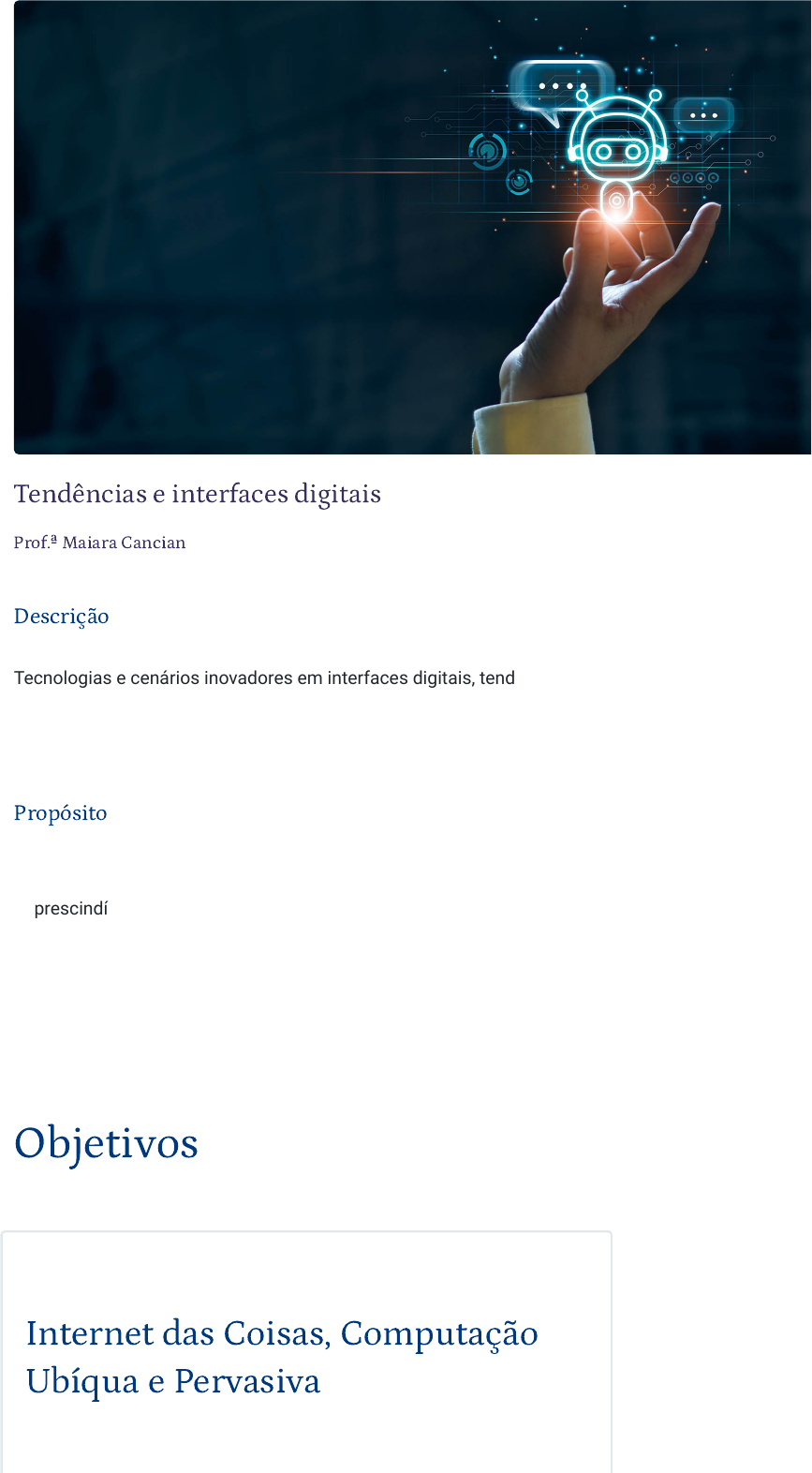 19/04/2024, 12:17 Tendências e interfaces digitais https://stecine.azureedge.net/repositorio/00212ti/04121/index.html?brand=estacio# 1/57 Tendências e interfaces digitais Prof.ª Maiara Cancian Descrição Tecnologias e cenários inovadores em interfaces digitais, tendências, pesquisas em andamento, produtos e tecnologias disponíveis no mercado. Propósito Estar alinhado com as tendências tecnológicas em cada área é imprescindível para profissionais em qualquer setor de atuação. Este conteúdo aborda os conceitos atuais, seus gatilhos para o futuro e como essas tecnologias impactam as interfaces digitais e a vida das pessoas. A constante busca pelas novidades tecnológicas num cenário está em contínua transformação. Objetivos Módulo 1 Internet das Coisas, Computação Ubíqua e Pervasiva 19/04/2024, 12:17 Tendências e interfaces digitais https://stecine.azureedge.net/repositorio/00212ti/04121/index.html?brand=estacio# 2/57 Identificar a aplicabilidade da Internet das Coisas e os conceitos envolvidos em sua concepção. Módulo 2 Captura de movimentos; realidade virtual e aumentada Analisar as principais características da realidade virtual e aumentada. Módulo 3 Voz, tato e olfato; inteligência arti�cial Reconhecer a importância da voz, do tato e do olfato nos sistemas computacionais e nas interfaces digitais. Introdução Falar de tendências e novas tecnologias é sempre um grande desafio, pois a cada dia temos algo novo: uma nova versão, uma nova tecnologia ou um novo produto. Os usuários estão sempre em busca de novidade e isso faz com que as empresas se esforcem para estar sempre à frente. Nesse sentido, o mercado busca profissionais preparados, que não só conheçam as tecnologias atuais, mas que consigam ver além, prospectar algo novo. O módulo 1 apresenta diversas aplicações da Internet das Coisas em diferentes áreas, relacionando-as com situações do nosso 19/04/2024, 12:17 Tendências e interfaces digitais https://stecine.azureedge.net/repositorio/00212ti/04121/index.html?brand=estacio# 3/57 cotidiano. Traz também os conceitos de Computação Ubíqua e Pervasiva, que são os combustíveis da Internet das Coisas, mostrando como elas se relacionam. O módulo 2 traz as novidades em interfaces digitais: a realidade virtual e a realidade aumentada, explicando como essas tecnologias funcionam e como podem contribuir para as mais diversas aplicações. O módulo 3 explora dois dos nossos sentidos, o tato e o olfato, e o reconhecimento da fala. Apresenta toda a complexidade envolvida em transportar esses elementos para o computador e como as aplicações ganham em realidade a cada novo passo nesse sentido. O módulo também apresenta as tecnologias que fazem os computadores imitarem os seres humanos, principalmente a Inteligência Artificial, que tem papel de destaque nesse quesito. 1 - Internet das Coisas, Computação Ubíqua e Pervasiva Ao �nal deste módulo, você será capaz de identi�car a aplicabilidade da Internet das Coisas e os conceitos envolvidos em sua concepção. Ligando os pontos 19/04/2024, 12:17 Tendências e interfaces digitais https://stecine.azureedge.net/repositorio/00212ti/04121/index.html?brand=estacio# 4/57 Procure no Google o termo Internet das Coisas e veja o que vai retornar. Certamente, as primeiras imagens a aparecer serão de um ambiente doméstico: geladeira, ar-condicionado, lâmpadas, tudo se comunicando via um smartphone ou tablet. Sim, isso é Internet das Coisas (IoT)! Mas você sabia que a Internet das Coisas tem muitas outras aplicações nas áreas da saúde, da indústria e do esporte, por exemplo? A Nike lançou o HyperAdapt, um tênis de corrida controlado por um aplicativo, e já se prepara para lançar o Huarache, ainda mais moderno. Para usufruir da tecnologia, o usuário deve ter o tênis e utilizar um aplicativo, que já está sendo preparado para ser integrado com outros produtos que ainda estão em estudo. Esses tênis terão o envio de diversos dados via rede e as luzes de led na sola poderão mudar de cor segundo a configuração do app. A tecnologia também permitirá ao usuário personalizar o tênis com o ajuste certo para os pés, apertando ou soltando o cadarço de acordo com suas necessidades durante a atividade física. Mas a grande novidade está na conectividade, que poderá ser controlada por comando de voz, utilizando o Apple Watch e a Siri, para ajustes no movimento, concentrando-se na melhoria da performance. A Nike já possui outros produtos IoT, como a pulseira chamada Nike FuelBand, que tem como objetivo ajudar os seus usuários a compreenderem melhor a própria saúde. Essa pulseira registra e armazena dados no smartphone. A Internet das Coisas está cada vez mais presente no esporte. Além da Nike, outras empresas investem em soluções, coletando informações e enviando para a rede, e com o apoio de Inteligência Artificial e outras tecnologias, podendo aprimorar o desempenho de atletas em diversas modalidades. Após a leitura do case, é hora de aplicar seus conhecimentos! Vamos ligar esses pontos? Questão 1 O caso apresenta os tênis da Nike com suas novas tecnologias e destaca a questão da conectividade. Por que a conectividade é tão importante para a Internet das Coisas? Assinale a alternativa correta: 19/04/2024, 12:17 Tendências e interfaces digitais https://stecine.azureedge.net/repositorio/00212ti/04121/index.html?brand=estacio# 5/57 Parabéns! A alternativa B está correta. Para ser considerado IoT, é necessário ter uma rede de dispositivos conectados, além de ter a capacidade de coletar e transmitir dados. Dessa forma, a conectividade é essencial, e esse foi um diferencial dos produtos lançados pela Nike. Questão 2 Quais tipos de serviços e benefícios você imagina que a pulseira da Nike pode oferecer ao usuário, além de apenas armazenar os seus dados e disponibilizar serviços simples que outros dispositivos já ofereciam (sem IoT)? A A conectividade 