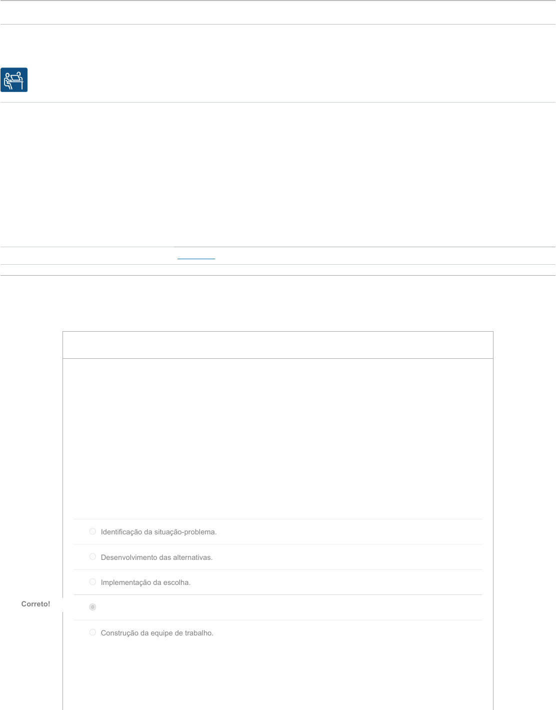 25/02/2023, 22:18 Atividade Avaliativa Final: TOMADA DE DECISÕES ESTRATÉGICAS PARA LÍDERES (2023/11/0090_202311A) https://online.instructure.com/courses/1659/quizzes/47166 1/9 Atividade Avaliativa Final Entrega Sem prazo Pontos 100 Perguntas 10 Limite de tempo 120 Minutos Instruções Histórico de tentativas Tentativa Tempo Pontuação MAIS RECENTE Tentativa 1 32 minutos 90 de 100 Pontuação deste teste: 90 de 100 Enviado 25 fev em 22:18 Esta tentativa levou 32 minutos. Atividade Avaliativa Final Agora faça este teste para verificar sua compreensão sobre o que foi aprendido. Você verá os resultados no final do período de realização do teste. Estude cuidadosamente as explicações para qualquer pergunta que você responda incorretamente. Esse feedback ajudará a redirecioná-lo no início do seu aprendizado se um conceito não estiver claro. 10 / 10 ptsPergunta 1 Organizações internacionais como a ONU buscam, continuamente, estabelecer uma mediação entre os conflitos dos países, proporcionando, assim, a cultura de paz entre os povos, por meio da crença das garantias dos direitos humanos e da promoção do desenvolvimento sustentável e econômico dos países em contínua cooperação mútua. Nessa missão, a ONU recebe denúncias de abusos, excessos, extremismos e violações, visando apurar por meio de seus delegados e em assembleias onde ocorrem as deliberações. Esse esforço mundial é uma forma de garantir acordos bilaterais ou mesmo multilaterais. O texto anterior está relacionado a qual etapa do processo decisório? Identificação da situação-problema. Desenvolvimento das alternativas. Implementação da escolha. Monitoramento e feedback. Correto!Correto! Construção da equipe de trabalho. https://online.instructure.com/courses/1659/quizzes/47166/history?version=1 25/02/2023, 22:18 Atividade Avaliativa Final: TOMADA DE DECISÕES ESTRATÉGICAS PARA LÍDERES (2023/11/0090_202311A) https://online.instructure.com/courses/1659/quizzes/47166 2/9 O monitoramento e o feedback acontecem no momento em que se está realizando uma ação e/ou uma execução. No caso anterior, há uma missão contínua em que há um monitoramento das relações de conflito entre países. Além disso, existe o feedback referente às denúncias de abusos e excesso de extremismo. 10 / 10 ptsPergunta 2 Você, como líder de um processo decisório, em reunião com a sua equipe com o objetivo de mapear, plenamente, os aspectos mais relevantes da situação-problema, escolheu a metodologia do diagrama causa e efeito. A partir de entrevistas, relatórios, e observações coletadas dos Sistemas de Gestão da Orion Distribuidora, identificaram-se os pontos sensíveis, que passarão a ser considerados os critérios da análise para o modelo adotado. São eles: Falta de Peças Fluxo do Processo Conflitos Pessoais Baixa Qualidade Acabamento Demora no Atendimento Controle de Qualidade Faltas ao Trabalho Falta de Equipamento Furtos de Material De acordo com as definições apresentadas, qual das alternativas a seguir representa a ordem correta das correlações dos aspectos identificados por você e sua equipe de trabalho com as dimensões da metodologia do Diagrama de Causa e Efeito? Considere, para sua resposta, a sequência representada na imagem a seguir: 1. Controle de qualidade; 2. Acabamento; 3. Conflitos pessoais; 4. Falta de equipamento; 5. Fluxo do processo; 6. Demora no atendimento. 1. Furto de material; 2. Demora no atendimento; 3.Conflitos pessoais; 4. Falta de equipamento; 5. Acabamento; 6. Baixa qualidade. 25/02/2023, 22:18 Atividade Avaliativa Final: TOMADA DE DECISÕES ESTRATÉGICAS PARA LÍDERES (2023/11/0090_202311A) https://online.instructure.com/courses/1659/quizzes/47166 3/9 1. Demora no atendimento; 2. Furto de material; 3. Conflitos pessoais; 4. Falta de equipamento; 5. Faltas ao trabalho; 6. Controle de qualidade. 1. Falta de peças; 2. Fluxo do processo; 3. Conflitos pessoais; 4. Falta de equipamento; 5. Faltas ao trabalho; 6. Controle de qualidade. 1. Fluxo do processo; 2. Falta de peças; 3. Conflitos pessoais; 4. Falta de equipamento; 5. Controle de qualidade; 6. Faltas ao trabalho. Correto!Correto! A resposta está correta, pois a representação a seguir mostra a alocação correta dos pontos identificados como mais relevantes pela equipe de trabalho: 10 / 10 ptsPergunta 3 Com a evolução das relações entre corporações, colaboradores e consumidores, aliada, também, ao aumento da competição nos mercados, os gestores passaram a ampliar seu leque de métodos de gerir a equipe para o desenvolvimento de projetos que resultem em produtos com maior aceitação no mercado. Assim, considerando essas modificações, analise as asserções a seguir e a relação proposta entre elas. I. O design thinking é um método empático que procura trazer para o gerenciamento a complexidade do mundo, considerando os desejos dos consumidores e passando por diferentes etapas que visam ao desenvolvimento de produtos simplificados, mas efetivos. PORQUE II. O objetivo da adoção de métodos ágeis, nos ambientes corporativos, é permitir que os gestores consigam introduzir para a equipe velocidade e flexibilidade de acordo com os projetos desenvolvidos, considerando fatores internos e externos da corporação e fatores críticos de agilidade. A seguir, assinale a alternativa correta. A asserção I é uma proposição verdadeira, e a II é uma proposição falsa. 25/02/2023, 22:18 Atividade Avaliativa Final: TOMADA DE DECISÕES ESTRATÉGICAS PARA LÍDERES (2023/11/0090_202311A) https://online.instructure.com/courses/1659/quizzes/47166 4/9 As asserções I e II são proposições verdadeiras, mas a II não é uma justificativa correta da I. Correto!Correto! As asserções I e II são proposições verdadeiras, e a II é uma justificativa correta da I. As asserções I e II são proposições falsas. A asserção I é uma proposição falsa, e a II é uma proposição verdadeira. A resposta