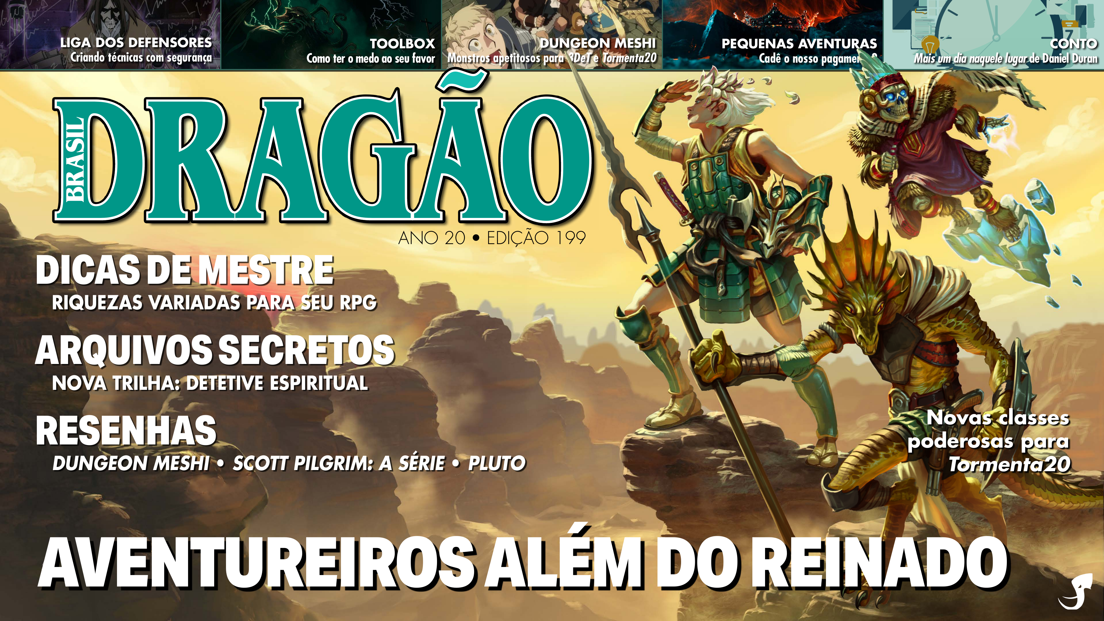 DUNGEON MESHI Monstros apetitosos para 3DeT e Tormenta20 PEQUENAS AVENTURAS Cadê o nosso pagamento? CONTO Mais um dia naquele lugar de Daniel Duran LIGA DOS DEFENSORES Criando técnicas com segurança TOOLBOX Como ter o medo ao seu favor DRAGAODRAGAOB R A SI L ANO 20 • EDIÇÃO 199 ~~ DICAS DE MESTRE RIQUEZAS VARIADAS PARA SEU RPG ARQUIVOS SECRETOS NOVA TRILHA: DETETIVE ESPIRITUAL RESENHAS DUNGEON MESHI • SCOTT PILGRIM: A SÉRIE • PLUTO AVENTUREIROS ALÉM DO REINADO Novas classes poderosas para Tormenta20 AVENTUREIROS NOVOS Forças além do Reinado para Tormenta20 PEQUENAS AVENTURAS Cadê o nosso pagamento? CONTO Mais um dia naquele lugar de Daniel Duran LIGA DOS DEFENSORES Criando técnicas com segurança TOOLBOX Como ter o medo ao seu favor B R A SI L ANO 19 • EDIÇÃO 199 Monstros apetitosos para Tormenta20 e 3DeT VictoryDRAGAODRAGAOB R A SI L DICAS DE MESTRE RIQUEZAS VARIADAS PARA SEU RPG ARQUIVOS SECRETOS NOVA TRILHA: DETETIVE ESPIRITUAL RESENHAS DUNGEON MESHI • SCOTT PILGRIM: A SÉRIE • PLUTO ~~ DUNGEON MESHI A CAPA Na CCXP, há menos de uma semana, um fã com quem conversava elogiou um dos meus editoriais. Agradeci e disse que estava começando a manter uma lista de controle dos temas, porque meu maior pesadelo é escrever um editorial e descobrir que já o fiz em alguma edição passada. Muito provavelmente eu já até falei desse tema específico aqui. Mas meio que não importa. Essa introdução é para dizer que já falei meio por cima dos fãs de Ordem Paranormal, mas vou falar de novo. Não sei nas redes sociais, onde fãs de qualquer coisa têm seus destaques e seus pontos mais baixos, mas pessoalmente, em eventos, os fãs de Ordem estão entre meus favoritos. Falo “os” fãs numa tentativa de abarcar os grupos que não vi, porque a maioria que presenciei eram meninas, adolescentes, em geral acompanhadas de amigas e/ou mães ou pais. E a sensação de maravilhamento delas quando davam de cara com o stand da Jambô era de botar um sorriso na cara de qualquer um. “Estou no paraíso”, disse uma delas. Mas a história de uma garota em especial me marcou, e vai ficar guardada para sempre na minha mente e no meu coração. Eu estava sentado num canto do stand, descansando, quando a vi chegar com a mãe. Normalmente as adolescentes veem os jogos, vibram e imploram para que a mãe ou pai compre o livro, com graus variados de sucesso. Mas ali foi diferente. Foi a mãe quem pegou a caixa de luxo de Ordem Paranormal e mostrou para a filha. A garota, também sorridente, abriu a caixa e mostrou tudo o que havia lá dentro, explicou cada item. A mãe então disse: “Vamos levar”. Para a minha surpresa a menina fechou a cara num semblante triste e passou a implorar para que a mãe não comprasse: “Não mãe, não compra, por favor”. A mãe pareceu não entender direito e insistiu de um modo muito carinhoso, até que a filha soltou, chorando, um último argumento: “Mãe, não compra. Eu não tenho amigos para jogar”. Aquilo acabou comigo. Me arrastou de volta para os meus quinze anos atrapa- lhados em que eu me sentia solitário mesmo cercado de colegas e alguns amigos muito próximos. Mesmo com um nó na garganta, me aproximei. “Desculpa me intrometer. Sou autor de um outro livro, mas ouvi a conversa de vocês”, disse. Então me voltei para a garota. “A maioria das pessoas que compra um livro de RPG também não têm amigos. O RPG é justamente um hobby para descobrir e juntar pessoas. Se você realmente tem vontade de jogar, não deixe que isso te intimide. Talvez seja esse o caminho para encontrar justamente aqueles com os mesmos interesses que você e que, no fim das contas, se tornarão seus amigos”. Voltei para o meu canto. A filha retomou o choro e abraçou a mãe, dessa vez sorrindo. Elas levaram a caixa, mas a compra em si era o de menos. Como disse no carro com os meus amigos depois, a vantagem de ser muito mais velho é poder dizer para gente mais jovem: “Eu venho do futuro, e vai ficar tudo bem”. VIM DO FUTURO 5454 Gazeta do ReinadoGazeta do Reinado A Volta da LebreA Volta da Lebre 5656 Caverna do Saber Caverna do Saber Como aproveitar manobras em Como aproveitar manobras em Tormenta20Tormenta20 6262 Conto Conto Mais um dia naquele lugar, Mais um dia naquele lugar, de Daniel Durande Daniel Duran 7070 Breves Jornadas Breves Jornadas Enfrente o Clã da Lotus em Enfrente o Clã da Lotus em Altos problemas em Nitamu-raAltos problemas em Nitamu-ra 76 76 Aventureiros Além do ReinadoAventureiros Além do Reinado Três novas classes para Três novas classes para Tormenta20Tormenta20!! 96 96 Gloriosos Diários Gloriosos Diários O que rolou no Julgamento de Ignis, em O que rolou no Julgamento de Ignis, em Fim dos TemposFim dos Tempos 100 100 Pequenas Aventuras Pequenas Aventuras Lute pelo seu pagamento em Lute pelo seu pagamento em Cadê o nosso dinheiro?Cadê o nosso dinheiro? 102102 Chefe de Fase Chefe de Fase Uma vilã em redenção, leve Eco para Uma vilã em redenção, leve Eco para Mutantes & Mutantes & Malfeitores e 3DeT VictoryMalfeitores e 3DeT Victory 106106 Liga dos Defensores Liga dos Defensores Crie suas próprias técnicas em Crie suas próprias técnicas em 3DeT Victory3DeT Victory Editora-Chefe Karen Soarele Editor-Executivo J.M. Trevisan Colunistas Leonel Caldela Rafael Dei Svaldi Thiago Rosa Colaboradores Texto: Ana Carolina Gonçalves, Bruno Schlatter, Daniel Duran, Davide Di Benedetto, Hita Aisaka, J.M. Trevisan, João Paulo “Moreau do Bode” Pereira, Marlon Teske, Miguel Souza, Momo Soares, Tiago Oriebir e Vinicius Mendes Arte: Anni Roenkae, Dan Ramos, Leonel Domingos, Samuel Marcelino e Sandro Zambi Diagramação: Cássia Bellmann Revisão: Elisa Guimarães, Rafael Dei Svaldi e Thiago Rosa Extras Fundo de tela: Danilo "Meowchado" M.M. Mapa de batalha: Filipe Borin J.M. TREVISAN PS. Mês que vem tem Dragão Brasil 200. Apertem os cintos! Dragão Brasil é © 2016-23 Jambô Editora. Apoie a Dragão Brasil Siga a Jambô 
