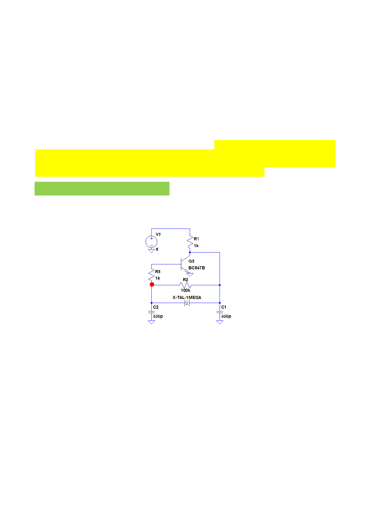 1 SEL0318 - Laboratório de Circuitos Eletrônicos III Laboratório 6 – Oscilador Pierce Osciladores baseados em filtros de ressonância são a melhor forma de se gerar oscilações em alta frequência com grande qualidade harmônica e com a possibilidade de se controlar a sua frequência por intermédio de uma tensão. As principais deficiências desses osciladores são as imprecisões devido ao espalhamento (tolerância) de fabricação dos componentes e a baixa qualidade presente nos indutores práticos. Componentes especiais, os cristais de quartzo (construídos de óxido de silício em cristal) são feitos para possuírem ressonâncias internas em frequências bem específicas, com pouquíssima variação e espalhamento de fabricação. Essas ressonâncias internas, em duas frequências bem definidas e próximas, garantem que um oscilador que emprega um cristal de quartzo irá oscilar na frequência do cristal, o que é essencial para sincronização de microprocessadores, transmissão serial de dados, sistemas de comunicação. 1.1) Implemente o circuito da figura 1 em bancada com alimentação simples de 5V e transistor bipolar. Fig. 1 - Oscilador Pierce 1.2) Capture as formas de onda no coletor do transistor (X) e na entrada do amplificador (Y). 1.3) Faça uma análise da distorção harmônica das duas formas de onda medindo a frequência fundamental das duas ondas, a amplitude pico a pico e a fase de uma com relação à outra. 1.4) Substitua o cristal de 1MHz por outros de 1.8432MHz, 4MHz e 10MHz. Ao utilizar o cristal de 10 MHz substitua os capacitores C1 e C2 por 56pF. Repita os procedimentos dos itens 1.2 e 1.3. 1. Implementação em Protoborad X 2 2.1) Implemente no simulador o cristal de quarto utilizando o componente “xtal”. Esse componente é tratado como um capacitor pelo simulador onde devem ser incluídos os quatro parâmetros que determinam as ressonâncias do dispositivo. Conforme apostila “Osciladores” do Prof. Paulo Roberto Veronese, um cristal de 1MHz apresenta as seguintes características: CS = 9,95358 fF, R =640 Ω, L= 2,54648 H e CP = 2,4884 pF. 2.2) Implemente o circuito da Fig. 2 com uma fonte de varredura AC sendo aplicada ao cristal. Faça a análise .AC e plote a impedância do cristal com uma faixa de frequência adequada e resolução suficiente para a visualização das duas ressonâncias (série e paralelo). Determine o valor da frequência dessas ressonâncias. Fig. 2 - Simulação da resposta em frequência do cristal OBS: Um circuito semelhante ao da Fig. 2 pode ser simulado para a visualização das duas ressonâncias (série e paralelo) utilizando-se as seguintes características de um cristal de 8 MHz: CS = 27 fF, R = 8Ω, L= 14mH e CP = 5,6 pF. 2.3) Qual a caracteristica da impedância do cristal antes e depois das frequências de ressonância e entre as frequências de ressonância ? 2.4) Implemente o circuito da Fig. 1. 1 e faça a análise transiente em um tempo adequado utilizando o comando startup para garantir a oscilação do circuito. 2.5) Plote a forma de onda no nó X. 2.6) Faça a análise de distorção harmônica do sinal de entrada e de saída através das respectivas FFTs destacando a frequência da fundamental. 2. Simulação no LTSpice