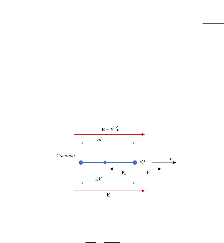 SEL 309 Eletromagnetismo Prof. Dr. Ben-Hur Viana Borges Campo eletrostático: Trabalho, Energia e Potencial 1) Potencial elétrico Das nossas aulas anteriores, sabemos que uma carga Q produz um campo E (intensidade de campo elétrico). Sabemos, ainda, que ao colocarmos uma carga ∆𝑄 em um ponto P próximo a esta carga, a razão entre a força ∆𝐅 e a carga ∆𝑄 é a medida da intensidade do campo elétrico naquele ponto, ou seja, ∆𝐅 ∆𝑄 = 𝐄 (1) Para movermos a carga ∆𝑄 contra o campo elétrico E, é preciso realizar um trabalho (W). Com base na figura abaixo, onde E é uniforme e está na direção +x, e 𝑑𝑙 é a distância que queremos mover a carga ∆𝑄 pelo caminho indicado na direção -x, temos que o diferencial de trabalho realizado é dado por, 𝑑𝑊 = 𝐅𝑎 ∙ 𝑑𝒍 = −𝑄𝐄 ∙ 𝑑𝒍 (2) Assim, uma quantidade diferencial de trabalho 𝑑𝑊 foi realizada quando a força aplicada 𝐅𝑎 produz um deslocamento diferencial 𝑑𝒍 da carga (movendo a carga uma distância 𝑑𝑙 = |𝑑𝒍|. Importante: para uma carga positiva e 𝑑𝒍 na direção de E, a equação (2) é negativa, o que significa que o trabalho é realizado pelo campo elétrico. Caso (2) fosse positiva, teríamos que o trabalho é realizado contra o campo elétrico. Lembrando, trabalho é definido como uma força atuando sobre uma distância. Escrevendo a razão entre o diferencial de trabalho por um diferencial de carga, supondo que a carga se move contra o campo elétrico, temos, 𝑑𝑊 𝑑𝑄 = 𝑑𝐹𝑥𝑑𝑙 𝑑𝑄 = 𝐸𝑥𝑑𝑙 (3) onde 𝐹𝑥 e 𝐸𝑥 são a magnitude de 𝐅𝑎 e E, respectivamente, ambos na direção x. No sistema SI, a equação (3) tem unidade de trabalho carga = Nm C = J C = volts Portanto, a quantidade trabalho por unidade de carga é denominada Potencial. Assim, o trabalho (ou energia) por unidade de carga requerido para transportar dQ por uma distância dl é denominado diferença de potencial V ao longo de dl. E como se pode ver, o potencial tem unidade de volts (V). Assim, considerando uma carga envolvida por um campo elétrico, o trabalho para mover esta carga por uma distância finita é dado por, 𝑊 = −𝑄 ∫ 𝐄 ∙ 𝑑𝒍 𝑓𝑖𝑛𝑎𝑙 𝑖𝑛𝑖𝑐𝑖𝑎𝑙 (4) onde o caminho deve ser especificado a priori. Exemplos: 1) [Hayt Jr.] Suponha 𝐄 = (2𝑦 + 1)𝐚𝑥 + 2𝑥𝐚𝑦 − 3𝐚𝑧. Encontre o trabalho para mover uma carga de 5 C ao longo de uma distância incremental de 1 mm começando em (1,2,-1) se estendendo até: a) (2,2,-1) b) (11,6,-7) c) (3,-3,-1) Respostas: 0; -25; -30.8 nJ 2) [Hayt Jr.] Repita o problema anterior para os mesmos parâmetros, mas começando no ponto (2,3,0). Ou seja, os caminhos agora se estendem até: a) (3,3,0) b) (12,7,-6) c) (4,-2,0) Respostas: 5.57; -35; -42.2 nJ 2) Integral de linha A equação (4) é um exemplo de integral de linha. A solução desta integral pode ser feita de mais de uma maneira, sendo a mais fácil quebrando o caminho A-B em segmentos e somando as contribuições originais. Isso será deixado a critério do aluno. O importante é saber que o trabalho realizado para mover uma carga de um ponto A para o ponto B, em um campo elétrico uniforme, independe da forma do caminho (como o da figura abaixo). Na verdade, depende da carga, de E, e do comprimento do caminho LBA. Assim, em um campo uniforme E, a integral 𝑊 = −𝑄 ∫ 𝐄 ∙ 𝑑𝒍 𝐴 𝐵 (5) Torna-se, 𝑊 = −𝑄𝑬 ∙ ∫ 𝑑𝒍 𝐴 𝐵 (6) onde a integral em (6) resulta em LBA, e o trabalho W, torna-se, 𝑊 = −𝑄𝑬 ∙ 𝑳𝐵𝐴 (7) O processo acima pode ser ilustrado da seguinte forma [Hayt Jr.]: Considere um campo não uniforme dado por, 𝐄 = 𝑦𝐚𝑥 + 𝑥𝐚𝑦 + 2𝐚𝑧 Determine o trabalho requerido para mover uma carga de 2 C de B(1,0,1) para A(0.8,0.6,1) ao longo do arco mais curto do círculo x2 + y2 = 1 𝑧 = 1 Em coordenadas cartesianas, o caminho diferencial 𝑑𝒍 = 𝑑𝑥𝐚𝑥 + 𝑑𝑦𝐚𝑦 + 𝑑𝑧𝐚𝑧. Assim, a integral torna-se, 𝑊 = −𝑄 ∫ 𝐄 ∙ 𝑑𝒍 𝐴 𝐵 = −2 ∫(𝑦𝐚𝑥 + 𝑥𝐚𝑦 + 2𝐚𝑧) ∙ (𝑑𝑥𝐚𝑥 + 𝑑𝑦𝐚𝑦 + 𝑑𝑧𝐚𝑧) 𝐴 𝐵 𝑊 = −2 ∫ 𝑦𝑑𝑥 − 2 ∫ 𝑥𝑑𝑦 − 4 ∫ 𝑑𝑧 1 1 0.6 0 0.8 1 Com base no caminho circular sugerido, e selecionando o sinal do radical que é apropriado ao quadrante envolvido, temos (note o limite de integração em z), 𝑊 = −2 ∫ √1 − 𝑥2𝑑𝑥 − 2 ∫ √1 − 𝑦2𝑑𝑦 − 0 0.6 0 0.8 1 𝑊 = −[𝑥√1 − 𝑥2 + sin−1 𝑥] 1 0.8 − [𝑦√1 − 𝑦2 + sin−1 𝑦] 0 0.6 𝑊 = −0.96 J A título de comparação, suponha, agora, que o caminho seja uma linha reta ligando B e A. Precisamos determinar a equação da reta pare este problema. Qualquer duas das equações abaixo são suficientes para definirmos a linha. Assim, 𝑦 − 𝑦𝐵 = 𝑦𝐴 − 𝑦𝐵 𝑥𝐴 − 𝑥𝐵 (𝑥 − 𝑥𝐵) 𝑧 − 𝑧𝐵 = 𝑧𝐴 − 𝑧𝐵 𝑦𝐴 − 𝑦𝐵 (𝑦 − 𝑦𝐵) 𝑥 − 𝑥𝐵 = 𝑥𝐴 − 𝑥𝐵 𝑧𝐴 − 𝑧𝐵 (𝑧 − 𝑧𝐵) Da primeira equação, temos 𝑦 = −3(𝑥 − 1), e da segunda, 𝑧 = 1. Assim, 𝑊 = −2 ∫ 𝑦𝑑𝑥 − 2 ∫ 𝑥𝑑𝑦 − 4 ∫ 𝑑𝑧 1 1 0.6 0 0.8 1 = 6 ∫ (𝑥 − 1)𝑑𝑥 − 2 ∫ (1 − 𝑦 3 )𝑑𝑦 − 0 0.6 0 0.8 1 𝑊 = −0.96 J Ou seja, caminhos diferentes, mas de mesmo comprimento, produzem o mesmo trabalho. Note que o problema acima foi resolvido em coordenadas cartesianas. Mas por conveniência vale expressar dl nas três coordenadas, para facilitar consultas futuras. Assim, Cartesianas: 𝑑𝒍 = 𝑑𝑥𝐚𝑥 + 𝑑𝑦𝐚𝑦 + 𝑑𝑧𝐚𝑧 Cilíndricas: 𝑑𝒍 = 𝑑𝑟𝐚𝑟 + 𝑟𝑑𝜙𝐚𝜙 + 𝑑𝑧𝐚𝑧 Esféricas: 𝑑𝒍 = 𝑑𝑟𝐚𝑟 + 𝑟𝑑𝜃𝐚𝜃 + 𝑟𝑠𝑖𝑛