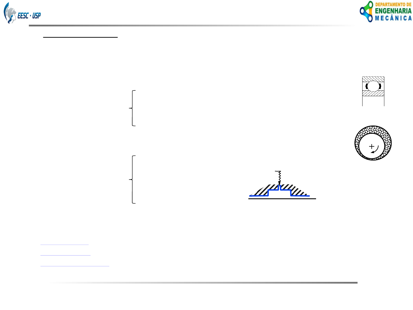 Notas de aula – Aula 11 – Mancais de rolamentos SEM 0241 – ELEMENTOS DE MÁQUINAS I Mancais convencionais Mancais especiais • de rolamentos (de esferas, de rolos, de rolos cônicos, de agulhas); • de deslizamento (buchas,hidrodinâmicos). • Hidrostáticos • Aerostáticos • Aerodinâmicos •Magnéticos 9 – Mancais de Rolamento Mancais são elementos de máquinas que suportam eixo girante, deslizante ou oscilante. São classificados em mancais de: Principais fabricantes : www.skf.com.br www.nsk.com.br www.schaeffler.com.br 11. 1 http://www.skf.com.br/ http://www.nsk.com.br/ http://www.schaeffler.com.br/ Notas de aula – Aula 11 – Mancais de rolamentos SEM 0241 – ELEMENTOS DE MÁQUINAS I 11. 2 • Atrito seco de deslizamento t atrito (estático) 3.0~2.0e NFatr • Atrito seco de rolamento Mancal de elementos rolantes e “rolamento” F W a aWRF W R a F drolam 0015.0~0012.0rolam )(15.0~1.0 cinemáticod 9.1 – Introdução 11. 2 Notas de aula – Aula 11 – Mancais de rolamentos SEM 0241 – ELEMENTOS DE MÁQUINAS I Vantagens do mancal de rolamento sobre o mancal hidrodinâmico 1 - Menor atrito de partida (0,02 contra 0,12) 2 - Lubrificação mais fácil 3 - Amaciamento desnecessário 4 - Liberdade de escolha do material do eixo 5 - Maior capacidade de carga por largura 6 - Padronização Tipos de elementos rolantes • esférico • cilíndrico • cônico Contato linear Contato puntiforme Coeficiente de atrito Capacidade de carga Tipo de contato 11. 3 11. 3 Notas de aula – Aula 11 – Mancais de rolamentos SEM 0241 – ELEMENTOS DE MÁQUINAS I 9.2 – Construção de Rolamentos • anel externo • anel interno • elemento rolante • gaiola • pista externa • pista interna Forma da pista Área de contato Capacidade de carga Blindagem ( opcional ) : • proteção contra partículas externas • placa protetora fixa no anel ext. - Z (1 placa ) - 2Z ( 2 placas ) - 2Z ( pré lubrificadas ) Z 2Z LZ 2LZ Suporta carga axial Não suporta carga axial 11. 4 11. 4 Notas de aula – Aula 11 – Mancais de rolamentos SEM 0241 – ELEMENTOS DE MÁQUINAS I 11. 5 Notas de aula – Aula 11 – Mancais de rolamentos SEM 0241 – ELEMENTOS DE MÁQUINAS I Gaiola Rebitada Estampada Fabricação de rolamentos : • Material : aço liga Cr-Mn • Processo : - Anéis : tubo torneamento tratamento térmico retífica polimento da pista - Elementos : barra conformação a frio (d ≤ 3/4’’) ou a quente tratamento térmico retificação frontal 1a escolha : diferença máxima 1 [µm] entre elementos 2a escolha : diferença diâmetro < 1 [µm] (casos especiais de precisão) Fixo 11. 6 11. 6 Notas de aula – Aula 11 – Mancais de rolamentos SEM 0241 – ELEMENTOS DE MÁQUINAS I • Inserção é feita sem gaiola. • Gaiola é rebitada depois. • Exige grande distância entre esferas. • Mais esferas Melhorar distribuição de esforços • Rolamentos especiais com maior número de esferas Canaleta no anel interno p/ inserção menor carga axial Montagem : Pista do anel externo 11. 7 11. 7 Notas de aula – Aula 11 – Mancais de rolamentos SEM 0241 – ELEMENTOS DE MÁQUINAS I Desvio de batida radial (run out) Precisão Soma dos desvios dos componentes do rolamento Trajetória do centro de rotação Desvio total de giro Normal P6 P5 P4 SP UP Erro Precisão Desvio de um rolamento. d = 50 mm 15 10 5 4 2 [µm] 11. 8 11. 8 Notas de aula – Aula 11 – Mancais de rolamentos SEM 0241 – ELEMENTOS DE MÁQUINAS I 9.3 –Tipos de Rolamentos ROLAMENTO RÍGIDO DE ESFERAS • mais comum, mais barato • suporta cargas radiais e um pouco de carga axial • baixo atrito altas rotações • cargas leves e médias 11. 9 11. 9 Notas de aula – Aula 11 – Mancais de rolamentos SEM 0241 – ELEMENTOS DE MÁQUINAS I 9.3 –Tipos de Rolamentos ROLAMENTOS DE CONTATO ANGULAR • uso parecido ao anterior • inclinação do contato aumenta cargas axiais suportadas • carga axial só num sentido 11. 10 11. 10 Notas de aula – Aula 11 – Mancais de rolamentos SEM 0241 – ELEMENTOS DE MÁQUINAS I 9.3 –Tipos de Rolamentos ROLAMENTO AUTOCOMPENSADOR DE ESFERAS • uma ou duas fileiras de esferas • compensam desalinhamento angular de até 3 graus • suporta cargas radiais e axiais leves 11. 11 11. 11 Notas de aula – Aula 11 – Mancais de rolamentos SEM 0241 – ELEMENTOS DE MÁQUINAS I ROLAMENTOS DE ROLOS CILÍNDRICOS • maior capacidade de carga • os anéis são separáveis • com duas flanges não suporta carga axial ( N, NU ) • com três flanges axial em um sentido • com quatro flanges axial em dois sentidos 11. 12 11. 12 Notas de aula – Aula 11 – Mancais de rolamentos SEM 0241 – ELEMENTOS DE MÁQUINAS I ROLAMENTOS DE ROLOS CILÍNDRICOS 11. 13 11. 13 Notas de aula – Aula 11 – Mancais de rolamentos SEM 0241 – ELEMENTOS DE MÁQUINAS I ROLAMENTO AUTOCOMPENSADOR DE ROLOS • cargas axiais e radiais maiores que anterior ROLAMENTOS DE AGULHAS • d = 1,5 ~ 5 mm, L = 2,5 . d • Usados nos casos de falta de espaço na direção radial • São separáveis • Somente carga radial 11. 14 11. 14 Notas de aula – Aula 11 – Mancais de rolamentos SEM 0241 – ELEMENTOS DE MÁQUINAS I ROLAMENTO DE ROLOS CÔNICOS • Grandes forças inclinadas Fa, Fr • São separáveis. Montados aos pares, pois recebem carga axial num só sentido 11. 15 11. 15 Notas de aula – Aula 11 – Mancais de rolamentos SEM 0241 – ELEMENTOS DE MÁQUINAS I ROLAMENTOS AXIAIS DE ESFERAS • Somente cargas axiais num só sentido • Anel do eixo tem d menor • Anel da caixa tem D maior 11. 16 ROLAMENTOS AXIAIS DE ESFERAS DE CONTATO ANGULAR 11. 16 Notas de aula – Aula 11 – Mancais de rolamentos SEM 0241 – ELEMENTOS DE MÁQUINAS I ROLAMENTOS AXIAIS DE ROLOS CILINDRICOS 11. 17 ROLAMENTOS AXIAIS DE ROLOS CONICOS ROLAMENTOS AXIAIS DE ROLOS DE AGULHAS 11. 17 Notas de aula – Aula 11 – Mancais de rolamentos SEM 0241 – ELEMENTOS DE MÁQUINAS I 9.4 – Seleção de Rolamentos a) Espaço disponível 