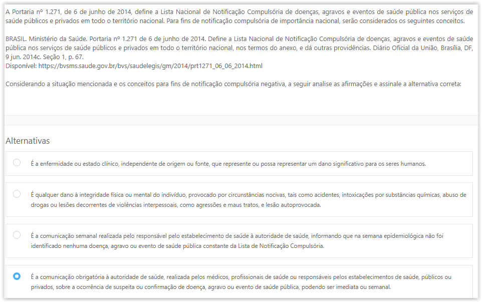 A Portaria n° 1.271, de 6 de junho de 2014, define a Lista Nacional de Notificação Compulsória de doenças, agravos e eventos de saúde pública nos serviços de saúde públicos e privados em todo o território nacional. Para fins de notificação compulsória de importância nacional, serão considerados os seguintes conceitos. Considerando a situação mencionada e os conceitos para fins de notificação compulsória negativa, a seguir analise as afirmacoes e assinale a alternativa correta: a enfermidade ou estado clínico, independente de origem ou fonte, que represente ou possa representar um dano significativo para os seres. É qualquer dano à integridade física ou mental do indivíduo, provocado por circunstâncias nocivas, tais como acidentes, intoxicações por substâncias químicas, abuso de drogas ou lesões decorrentes de violências interpessoais, como agressões e maus tratos, e lesão autoprovocada. É a comunicação semanal realizada pelo responsável pelo estabelecimento de saúde à autoridade de saúde informando que na semana epidemiológica não foi identificado nenhuma doença, agravo ou evento de saúde pública constante da Lista de Notificação Compulsória. a comunicação à autoridade de saúde, realizada pelos médicos, profissionais de saúde ou responsáveis pelos estabelecimentos de saúde públicos ou privados, sobre a ocorrência de suspeita ou confirmação de doença, agravo ou evento de saúde pública, podendo ser imediata ou semanal.