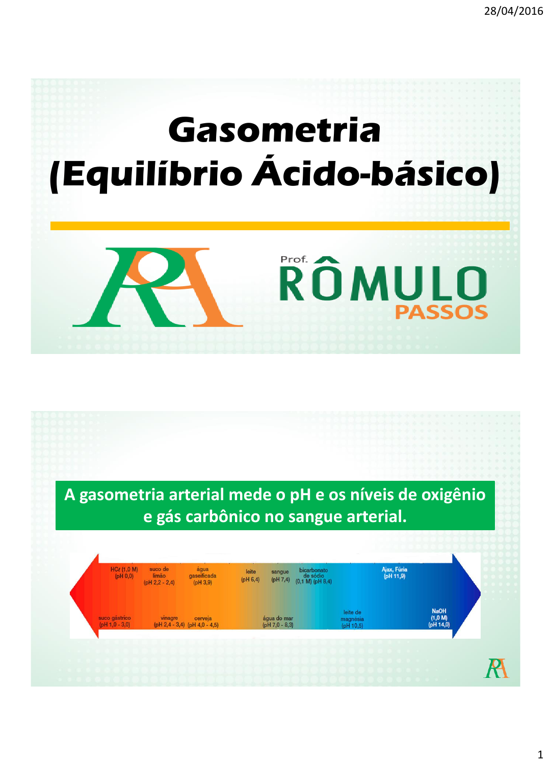 28/04/2016 1 Gasometria (Equilíbrio Ácido-básico) A gasometria arterial mede o pH e os níveis de oxigênio e gás carbônico no sangue arterial. LIVIA HONORATO DOS SANTOS - 049.094.326-80 28/04/2016 2 Conceitos Básicos • Substância que cede H+Ácido • Substâncias que captam H+Bases Para que as células possam desempenhar suas funções, o organismo necessita que a concentração de H+ seja mantida em níveis (pH) que oscilem entre 7,35 e 7,45. Equilíbrio Ácido-Base- Sistema Tampão: LIVIA HONORATO DOS SANTOS - 049.094.326-80 28/04/2016 3 Em condições normais existe um balanço entre os componentes metabólico e respiratório, que mantém o pH estável dentro da normalidade. Este balanço é conhecido como Sistema Tampão, e é representado pelo equilíbrio entre pCO2 e HCO3. Componente Respiratório CO2 Componente Metabólico HCO3 PH = 7,35 e 7,45 Acidose (↑ H+) respiratória ↑ PaCO2 EAP, pneumotórax, ↑ sedação metabólica ↓ bicarbonato (HCO3 -) ↑ FR p/ liberar CO2 mista ↑ PCO2 + ↓ HCO3 - Alcalose (↓ H+) respiratória ↓ PaCO2 hiperventilação metabólica ↑ bicarbonato (HCO3 -) ↓ FR p/ reter CO2 mista ↑ HCO3 - + ↓ PCO2 Resumo - Gasometria LIVIA HONORATO DOS SANTOS - 049.094.326-80 28/04/2016 4 HCO3: 22 a 26 mEq/L BE: - 2 a +2 mEq/L; PaCO2: 35 a 45 mmHg PaO2:80 a 100 mmHg PH: Normal 7,35 e 7,45 Parâmetros Avaliados PH: Alteração sugere desequilíbrio no sistema respiratório ou metabólico; Valores normais: entre 7,35 e 7,45; (pH < 7,35 = acidose; pH > 7,45 = alcalose); Faixa de pH compatível com a vida = 6,8 – 7,8. PaO2: Exprime a eficácia das trocas gasosas através da membrana alveolocapilar; Valores normais: de 80 a 100 mmHg; ↓ 60 mmHg = hipoxemia severa. PaCO2: Eficácia da ventilação alveolar; Valores normais: de 35 a 45 mmhg; Reflete distúrbios respiratórios do pH; (↓PaCO2 = hiperventilação = Alcalose respiratória e ↑PaCO2 = hipoventilação = Acidose respiratória). LIVIA HONORATO DOS SANTOS - 049.094.326-80 28/04/2016 5 HCO3: Concentração depende da função renal; Valores normais: de 22 a 26mEq/l; Reflete distúrbios metabólicos; (↓HCO3 = ↓ pH = acidose metabólica e ↑HCO3 = ↑ pH = alcalose metabólica). Base excess – BE: Sinaliza o excesso ou déficit de bases dissolvidas no plasma sanguíneo; Valores normais: -2 a +2; (BE↑ = alcalose metabólica e BE↓ = acidose metabólica). Como Interpretar uma Gasometria 1º • Avalia pH (normal, acidose ou alcalose) 2º • Que fator esta influenciando o pH (PCO2 ou HCO3?) 3º • Está havendo compensação do outro sistema ou não LIVIA HONORATO DOS SANTOS - 049.094.326-80 28/04/2016 6 Como Interpretar uma Gasometria • Apesar das alterações pH normalCompensado • pH alterado, porém o outro sistema aletrado para tentar compensar o distúrbio Parcialmente compensado • O outro sistema não altera tentando compensarDescompensado EXEMPLO: Um paciente intoxicado por barbitúricos, com respiração superficial, apresenta a seguinte gasometria arterial: PH= 7,19 PaCO2= 80 mmHg PaO2 = 48 mmHg HCO3= 30,5 mEq/L BE= -0,5 mEq/L Assim, teremos os diagnósticos de acidose respiratória parcialmente compensada por alcalose metabólica e hipoxemia grave por hipoventilação. LIVIA HONORATO DOS SANTOS - 049.094.326-80 28/04/2016 7 A interpretação desta gasometria demonstra: PH abaixo de 7,35= acidose PaCo2 acima de 45mmHg = hipoventilação levando à acidose respiratória Pa O2 abaixo de 50mmHg = hipoxemia grave HCo3 acima de 28mEq/L = alcalose metabólica BE normal = ausência de alcalose metabólica efetiva OBS: Teríamos acidose respiratória compensada por alcalose metabólica se o pH estivesse normal pH = 7,30 pCO2 = 52 mmHg HCO3 = 24mEq/l pH Baixo, PCO2 alto HCO3 Normal Acidose Respiratória: Causas - Hipoventilação (acúmulo de CO2), depressão do centro respiratório, obstrução do trato respiratório, doenças pulmonares, doenças neuromusculares, fibrose pulmonar, asma, entre outras. LIVIA HONORATO DOS SANTOS - 049.094.326-80 28/04/2016 8 pH = 7,32 pCO2 = 42 mmHg HCO3 = 19 mEq/l pH baixo, pCO2 normal, HCO3 baixo Acidose metabólica - Causas possíveis: cetoacidose diabética, insuficiência renal (reduz excreção renal de H+), diarreia grave, jejum prolongado, insuficiência hepática, intoxicação externa. pH = 7,49 pCO2 = 33 HCO3 = 23 mEq/l pH alto, pCO2 baixo, HCO3 normal Alcalose Respiratória Hiperventilação (perda CO2) Causas: -Ventilação mecânica excessiva (hiperventilação), febre elevada, sepse (estado hipermetabólito), doenças neurológicas, hipertireoidismo, ansiedade. LIVIA HONORATO DOS SANTOS - 049.094.326-80 28/04/2016 9 pH = 7,49 pCO2 = 44 mmHg HCO3 = 32 mEq/l pH alto, PCO2 normal, HCO3 alto Alcalose Metabólica Causas: - Perda excessiva de H+, estenose pilórica, vômitos, uso excessivo de diuréticos, tumor renal. pH = 7,05 pCO2 = 55 mmHg HCO3 = 18 mEq/l pH muito baixo, pCO2 alto,HCO3 baixo Acidose Mista LIVIA HONORATO DOS SANTOS - 049.094.326-80 28/04/2016 10 pH = 7,42 pCO2 = 22 mmHg HCO3 = 15 mEq/l pH normal, pCO2 baixo,HCO3 baixo Distúrbio Misto: Acidose Metabólica + Alcalose Respiratória PH = 7,35 e 7,45 Acidose (↑ H+) respiratória ↑ PaCO2 EAP, pneumotórax, ↑ sedação metabólica ↓ bicarbonato (HCO3 -) ↑ FR p/ liberar CO2 mista ↑ PCO2 + ↓ HCO3 - Alcalose (↓ H+) respiratória ↓ PaCO2 hiperventilação metabólica ↑ bicarbonato (HCO3 -) ↓ FR p/ reter CO2 mista ↑ HCO3 - + ↓ PCO2 Resumo - Gasometria LIVIA HONORATO DOS SANTOS - 049.094.326-80 28/04/2016 11 Sintomas e Tratamento - Alcalose Metabólica → hipóxia, hipercapnia (diminui a FR), turgor diminuído, hipotensão Estimular a perda do bicarbonato com Hidratação venosa com KCl e NaCl dialise (grave) Tratamento Sintomas e Tratamento - Alcalose Respiratória arritmias cardíacas, parestesias faciais e periféricas, cãibras, confusão mental, síncope e crises Convulsivas ↓ FR ou Volume da VM Analgesia e sedação Tratamento LIVIA HONOR