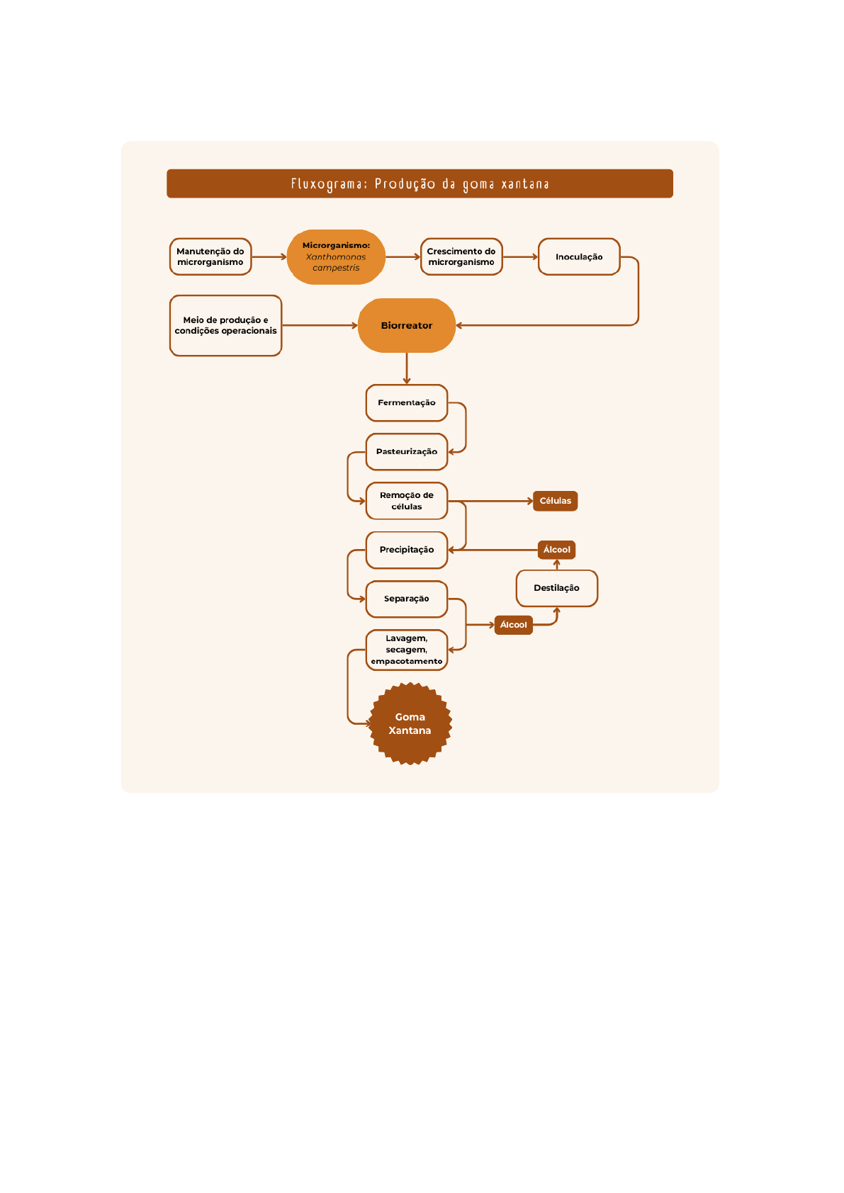 Manutenção do microrganismo: A cultura de microrganismo selecionada é preservada para possível estocagem por longo prazo através de métodos que mantenham suas propriedades desejadas. Microrganismo escolhido: Para produção da goma xantana, utiliza-se a bactéria Xanthomonas campestris. Apresentam células em forma de bastonetes, Gram-negativas e ocorrem predominantemente isoladas. Crescimento do microrganismo: Uma pequena quantidade da cultura preservada é expandida por crescimento em superfícies sólidas ou em meios líquidos para obter o inóculo necessário para biorreatores em larga escala. Para a produção, culturas de X. campestris puras são cultivadas usando fermentação aeróbica submersa. Inoculação: O meio de cultura é inoculado com cultura selecionada. Em função da goma atuar como uma espécie de cápsula bacteriana, sua produção está associada ao crescimento celular. Durante o período de inoculação, ocorre um aumento da concentração celular, mas diminui a produção de GX, uma vez que ela, ao redor da célula, impede o transporte de nutrientes e estende a fase lag de crescimento. Meio de produção e condições operacionais: Preparação do meio com carboidratos, nitrogênio e sais minerais e é esterilizado via calor úmido. E também ajusta-se pH, temperatura. Biorreator: Equipamento capaz de transformar matérias-primas (substratos) em produtos, utilizando agentes biológicos como células, enzimas ou microrganismos, por meio da fermentação. Nele ocorre a produção da goma xantana. Fermentação: A cultura expandida é então introduzida em biorreatores em larga escala onde ocorre a fermentação. Durante a fermentação, o microrganismo cresce e produz xantana. Vários fatores, como o tipo de biorreator, modo de operação (lote ou contínuo), composição do meio e condições de cultura (temperatura, pH, concentração de oxigênio dissolvido), influenciam o crescimento e a produção de xantana. Pasteurização: A pasteurização do caldo fermentado em uma temperatura alta frequentemente causa degradação térmica do exopolissacarídeo microbiano. Quando o caldo é tratado sob condições apropriadas (80 – 130°C, 10 – 20 min, pH 6,3 – 6,9), a dissolução da goma xantana ocorre sem degradação térmica, e o rompimento das células é observado (Smith e Pace, 1982). O aumento da temperatura também diminui a viscosidade do meio, facilitando a remoção dos insolúveis por centrifugação (Giavasis et al., 2000; Moreira et al., 2003; Boza et al., 2004) ou filtração (Giavasis et al., 2000) Remoção de células: A remoção das células podem ser feitas por filtração, decantação ou centrifugação. Precipitação: A goma xantana é precipitada em solvente, (isopropanol, etanol ou acetona), separada, seca, moída, peneirada, e então embalada. O crescimento dos microrganismos e a produção de goma xantana são influenciados por fatores tais como o tipo de biorreator usado, o modo de operação (batelada ou contínuo), a composição do meio, as condições da cultura (temperatura, pH, concentração de oxigênio dissolvido) (García-Ochoa et al., 2000; Chi e Zhao, 2003). Separação e destilação: Nessa etapa ocorre a separação do precipitado e do solvente, sendo o precipitado lavado várias vezes com o solvente que é evaporado posteriormente. Preferencialmente solventes orgânicos solúveis em água como álcool. Lavagem, secagem e empacotamento: Posteriormente ocorre a secagem do biopolimero em secadores contínuos ou em batelada, podendo ser a vácuo ou com circulação forçada de gás inerte. Após são purificados e secos em estufa, a baixas temperaturas ou liofilizados e então armazenados e preparados para análises subsequentes.