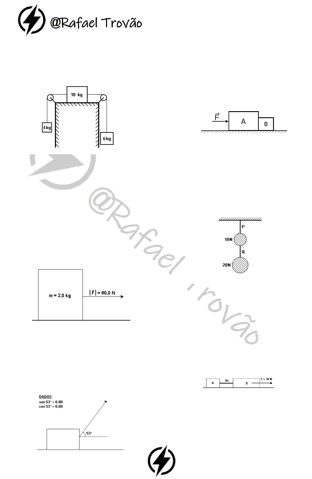 01) (Unicamp) Um carro de 800kg andando a 108km/h, freia bruscamente e para em 5,0s. a) Qual é a aceleração do carro? b) Qual o valor da força de atrito que atua sobre o carro? 02) (Fuvest) O sistema indicado na figura a seguir, onde as polias são ideais, permanece em repouso graças a força de atrito entre o corpo de 10kg e a superfície de apoio. Podemos afirmar que o valor da força de atrito é: a) 20N b) 10N c) 100N d) 60N e) 40N 03) (Fatec) Um corpo atirado horizontalmente, com velocidade de 10m/s, sobre uma superfície horizontal, desliza 20m até parar. Adotando g=10m/s2, o coeficiente de atrito cinético entre o corpo e a superfície é: a) 0,13 b) 0,25 c) 0,40 d) 0,50 e) 0,75 04) O bloco da figura a seguir está em movimento em uma superfície horizontal, em virtude da aplicação de uma força F paralela à superfície. O coeficiente de atrito cinético entre o bloco e a superfície é igual a 0,2. A aceleração do objeto é: dado: g=10,0m/s2 a) 20,0 m/s2 b) 28,0 m/s2 c) 30,0 m/s2 d) 32,0 m/s2 e) 36,0 m/s2 05) (PUC) Um corpo de massa 4,0kg está sobre uma superfície horizontal com a qual tem coeficiente de atrito dinâmico 0,25. Aplica-se nele uma força F constante, que forma com a horizontal um ângulo de 53°, conforme a figura. Se o módulo de F é 20N e a aceleração local da gravidade é 10m/s2, pode- se concluir que a aceleração do movimento do corpo é, em m/s2, a) 2,0 b) 1,5 c) 0,75 d) 0,50 e) 0,25 06) Os blocos A e B têm massas mA=5,0kg e mB=2,0kg e estão apoiados num plano horizontal perfeitamente liso. Aplica-se ao corpo A a força horizontal F, de módulo 21N. A força de contato entre os blocos A e B tem módulo, em newtons: a) 21 b) 11,5 c) 9,0 d) 7,0 e) 6,0 07) Dois corpos, de peso 10N e 20N, estão suspensos por dois fios, P e Q, de massas desprezíveis, da maneira mostrada na figura. A intensidades (módulos) das forças que tensionam os fios P e Q são respectivamente, de: a) 10 N e 20 N b) 10 N e 30 N c) 30 N e 10 N d) 30 N e 20 N e) 30 N e 30 N 08) Dois blocos A e B, com massas mA = 5kg e mB = 10kg, são colocados sobre uma superfície plana horizontal (o atrito entre os blocos e a superfície é nulo) e ligados por um fio inextensível e com massa desprezível (conforme a figura a seguir). O bloco B é puxado para a direita por uma força horizontal F com módulo igual a 30N. Nessa situação, o módulo da aceleração horizontal do sistema e o módulo da força tensora no fio valem, respectivamente, a) 2 m/s2 e 30 N b) 2 m/s2 e 20 N c) 3 m/s2 e 5 N d) 3 m/s2 e 10 N e) 2 m/s2 e 10 N 09) Um corpo de massa 8,0kg é colocado sobre uma superfície horizontal completamente lisa, preso por um fio ideal a outro corpo, de massa 2,0kg. Adote g = 10m/s2 e considere ideal a roldana. A tração no fio tem módulo, em newtons: a) 4,0 b) 12 c) 16 d) 20 e) 24 10) (UFMG) Nessa figura, está representado um bloco de 2,0kg sendo pressionado contra a parede por uma força F. O coeficiente de atrito estático entre esses corpos vale 0,5, e o cinético vale 0,3. Considere g=10m/s2. Se F = 50N, então a reação normal e a força de atrito que atuam sobre o bloco valem, respectivamente, a) 20N e 6,0N b) 20N e 10N c) 50N e 20N d) 50N e 25N e) 70N e 35N 11) (UFMG) Nessa figura, está representado um bloco de 2,0kg sendo pressionado contra a parede por uma força F. O coeficiente de atrito estático entre esses corpos vale 0,5, e o cinético vale 0,3. Considere g=10m/s2. A força mínima F que pode ser aplicada ao bloco para que ele não deslize na parede é: a) 10N b) 20N c) 30N d) 40N e) 50N 12) (Fei) No sistema a seguir, sabe-se que a massa do corpo "b" é mb=20kg a massa do corpo "a" é ma=200kg e o coeficiente de atrito entre o corpo "a" e a mesa é 0,20. Os fios são inextensíveis e o atrito e inércia das roldanas desprezíveis. Qual deve ser o valor mínimo da massa do corpo "c" (mc) para que o sistema possa adquirir movimento? a) mc = 20 kg b) mc = 30 kg c) mc = 40 kg d) mc = 50 kg e) mc = 60 kg 13) (Unesp) No sistema a seguir, A tem massa mA=10kg. B tem massa mB=15kg. O ângulo é de 45°.. Qual será o coeficiente de atrito entre as superfícies em contato, do corpo A com o plano, para que o corpo se desloque com movimento uniforme? Observações: g = 10m/s2; o peso da corda, o atrito no eixo da roldana e a massa da roldana são desprezíveis. 14) (Uel) No sistema representado a seguir, o corpo A, de massa 3,0kg está em movimento uniforme. A massa do corpo B é de 10kg. Adote g=10m/s2 O coeficiente de atrito dinâmico entre o corpo B e o plano sobre o qual se apoia vale: a) 0,15 b) 0,30 c) 0,50 d) 0,60 e) 0,70 15) (Uel) Um corpo de peso 10N é puxado plano acima, com velocidade constante, por uma força F paralela ao plano inclinado de 53° com a horizontal. Adote: cos53°=0,60; sen53°=0,80; g=10m/s2; coeficiente de atrito dinâmico=0,20. A intensidade da força F é, em newtons: a) 12 b) 11,2 c) 10 d) 9,2 e) 8,0 16) (Fatec) A superfície de contato do bloco A apresenta com o plano inclinado os coeficientes de atrito estático 0,70 e cinético 0,50. A massa do bloco é de 20kg e g=10m/s2. A mínima força que se deve aplicar no bloco para que ele inicie movimento tem intensidade, em newtons: a) 22 b) 44 c) 74 d) 94 e) 122 17) (Fei) Na montagem a seguir, o coeficiente de atrito entre o bloco A e o plano é 0,4. Sabendo-se que mA=10kg e mB=25kg e mC=15kg. Qual é o módulo das acelerações dos blocos? a) |a| = 0 b) |a| = 1,2 m/s2 c) |a| = 1,5 m/s2 d) |a| = 3,0 m/s2 e) |a| = 5,0 m/s2 18) (Ufsm) Um corpo de massa igual a 10kg desliza, em Movimento Retilíneo Uniforme, sobre uma mesa horizontal, sob a ação de uma força horizontal de módulo 10N. Considerando a aceleração gravitacional com módulo g=10m/s2, o coeficiente de atrito cinético entre o corpo e a mesa é: a) 10 b) 1 c) 0,1 d) 0,01 e) zero 19) No último jogo do Botafogo contra o Flamengo, um certo jogador chutou a bola e a trajetória vista por um repórter, que estava parado em uma das late