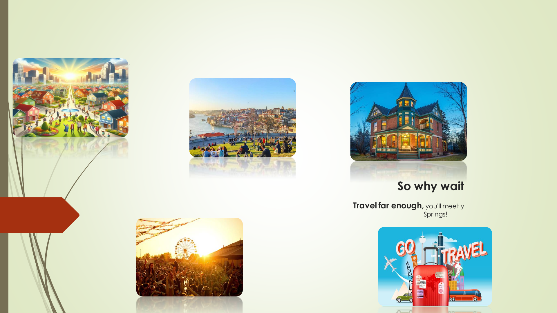 So why wait? Travel far enough, you'll meet yourself in Serenity Springs! Our wonderful homes are not just buildings, but a testament to the rich history that our city holds dear. Welcome to Serenity Springs! Serenity Springs is a beautiful city nest led in the heart of the country, known for its warm and welcoming residents. What's in Serenity Springs? -Historic Homes: Marvel at the architecture of our homes that preserve the city's history. - Festive Seasons: Join us during our traditional festivals filled with dances and local cuisine. - Friendly Locals: Experience the hospitality of our residents who make everyone feel at home. Slide 1: So why wait? Travel far enough, you'll meet yourself in Serenity Springs!