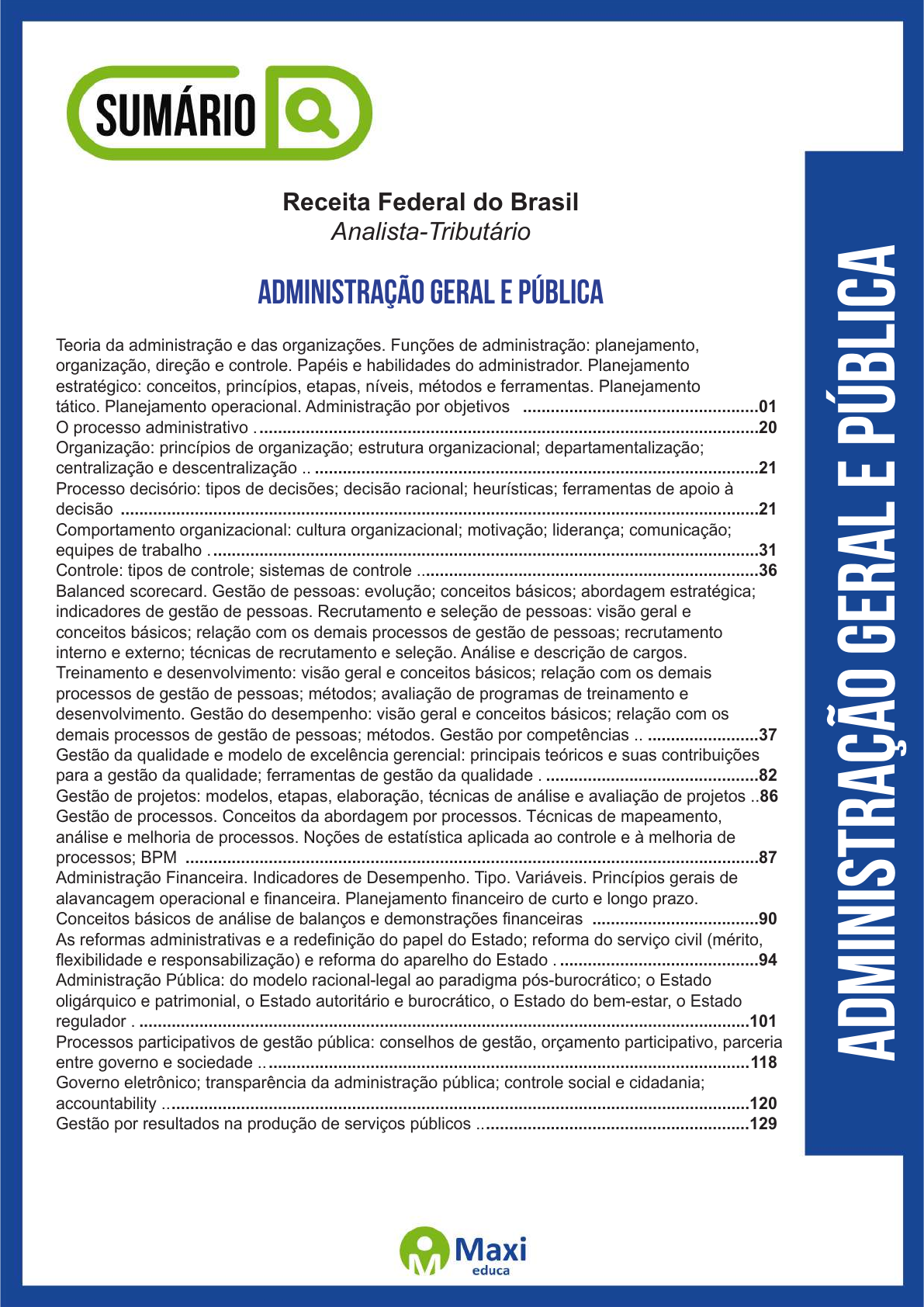 Ad m in is tr aç ão G er al e Pú bl ic a Teoria da administração e das organizações. Funções de administração: planejamento, organização, direção e controle. Papéis e habilidades do administrador. Planejamento estratégico: conceitos, princípios, etapas, níveis, métodos e ferramentas. Planejamento tático. Planejamento operacional. Administração por objetivos ...................................................01 O processo administrativo . ............................................................................................................20 Organização: princípios de organização; estrutura organizacional; departamentalização; centralização e descentralização .. ................................................................................................21 Processo decisório: tipos de decisões; decisão racional; heurísticas; ferramentas de apoio à decisão ..........................................................................................................................................21 Comportamento organizacional: cultura organizacional; motivação; liderança; comunicação; equipes de trabalho . ......................................................................................................................31 Controle: tipos de controle; sistemas de controle ..........................................................................36 Balanced scorecard. Gestão de pessoas: evolução; conceitos básicos; abordagem estratégica; indicadores de gestão de pessoas. Recrutamento e seleção de pessoas: visão geral e conceitos básicos; relação com os demais processos de gestão de pessoas; recrutamento interno e externo; técnicas de recrutamento e seleção. Análise e descrição de cargos. Treinamento e desenvolvimento: visão geral e conceitos básicos; relação com os demais processos de gestão de pessoas; métodos; avaliação de programas de treinamento e desenvolvimento. Gestão do desempenho: visão geral e conceitos básicos; relação com os demais processos de gestão de pessoas; métodos. Gestão por competências .. ........................37 Gestão da qualidade e modelo de excelência gerencial: principais teóricos e suas contribuições para a gestão da qualidade; ferramentas de gestão da qualidade . ..............................................82 Gestão de projetos: modelos, etapas, elaboração, técnicas de análise e avaliação de projetos .. 86 Gestão de processos. Conceitos da abordagem por processos. Técnicas de mapeamento, análise e melhoria de processos. Noções de estatística aplicada ao controle e à melhoria de processos; BPM ............................................................................................................................87 Administração Financeira. Indicadores de Desempenho. Tipo. Variáveis. Princípios gerais de alavancagem operacional e financeira. Planejamento financeiro de curto e longo prazo. Conceitos básicos de análise de balanços e demonstrações financeiras ....................................90 As reformas administrativas e a redefinição do papel do Estado; reforma do serviço civil (mérito, flexibilidade e responsabilização) e reforma do aparelho do Estado . ...........................................94 Administração Pública: do modelo racional-legal ao paradigma pós-burocrático; o Estado oligárquico e patrimonial, o Estado autoritário e burocrático, o Estado do bem-estar, o Estado regulador . ....................................................................................................................................101 Processos participativos de gestão pública: conselhos de gestão, orçamento participativo, parceria entre governo e sociedade .. ........................................................................................................118 Governo eletrônico; transparência da administração pública; controle social e cidadania; accountability .. .............................................................................................................................120 Gestão por resultados na produção de serviços públicos .. .........................................................129 Receita Federal do Brasil Analista-Tributário Administração Geral e Pública 1743257 E-book gerado especialmente para DIOVANI SIQUEIRA CALENZANI Ad m in is tr aç ão G er al e Pú bl ic a Comunicação na gestão pública e gestão de redes organizacionais .. .......................................151 Administração de pessoal .. .........................................................................................................174 Administração de compras e materiais: processos de compras governamentais e gerenciamento de materiais e estoques ..............................................................................................................206 Sustentabilidade das contratações ..............................................................................................244 Mudanças institucionais: conselhos, organizações sociais, organização da sociedade civil de interesse público (OSCIP), agência reguladora, agência executiva, consórcios públicos .. ........249 Conceitos básicos de planejamento. Aspectos administrativos, técnicos, econômicos e financeiros. Formulação de programas e projetos. Avaliação de programas e projetos. Tipos de avaliação. Análise custo benefício e análise custo-efetividade . ..................................................264 Governança Pública. Conceitos fundamentais. Princípios, diretrizes e níveis de análise. Sistema de governança. Práticas de governança .....................................................................................280 Gestão de Riscos: princípios, objetos, técnicas, modelos nacionais e internacionais, integração ao planejamento. Processo de Gestão de Riscos: comunicação, consulta, contextualiza