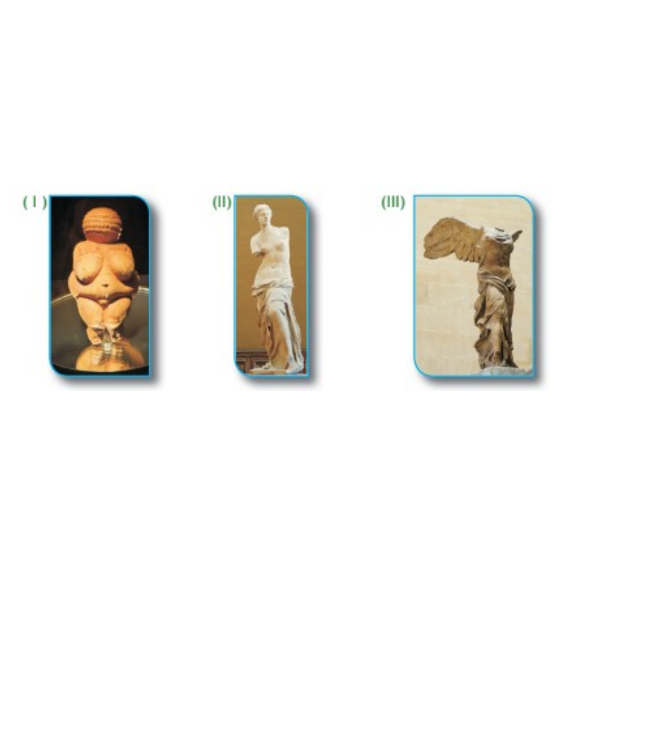 Escola Recanto da Emília. Professora: Bárbara, 7º ano. Educando(a): 14/04/2023 1- Qual era a expressão máxima da arte bizantina? a) Mosaicos b) Pinturas c) Templos d) Esculturas e) Igrejas 2 - Identifique as esculturas abaixo: I. calcário oolítico, datada de 22 000 a 24 000 anos. Dimensões: 11,4 cm × 5,0 cm × 5,8 cm. Museu de História Natural de Viena, Áustria. II. mármore de provável autoria de Alexandre de Antioquia, datada de cerca de 130 a.C. Altura: 203 cm. Museu do Louvre, Paris, França. III. mármore de Paros, c. 220 a.C.-190 a.C. Dimensão: altura 245 cm. Museu do Louvre, Paris, França. As esculturas estão corretamente identificadas na alternativa: A) I – Vênus Calipígia; II – Afrodite; III – Vênus de Médici. B) I – Vênus de Milo; II – Afrodite; III – Diana Caçadora. C) I - Vênus de Willendorf, II - Vênus de Milo, III - Vitória de Samotrácia. D) I – Vênus de Brassempoy; II – Vênus de Milo; III – Afrodite. E) I – Vênus de Willendorf; II – Vitória de Samotrácia; III – Afrodite. 3- A escultura _________________ era subordinada à arquitetura. As obras eram elaboradas sobre colunas, portas ou outros elementos arquitetônicos, e estavam presentes nos interiores e nos exteriores das edificações. Assinale a alternativa que preencha corretamente a lacuna: A) Românica. B) Gótica. C) Bizantina. D) Renascentista. E) Islâmica. 4- Observe a imagem a seguir e descreva se pertence a Arquitetura, Escultura ou Pintura. ______________________ ______________________ ________________ ____________________ _______________________ _________________ 5- Qual das seguintes afirmações sobre as esculturas pré-históricas denominadas Vênus é verdadeira? A) Representam a deusa romana Vênus. B) Foram encontradas apenas na Grécia Antiga. C) São figuras femininas que representam o ideal de beleza feminina. D) Foram todas esculpidas em mármore. E) Não possuem nenhuma relação com a fertilidade. image7.png image3.png image6.png image1.png image2.png image5.png image4.png