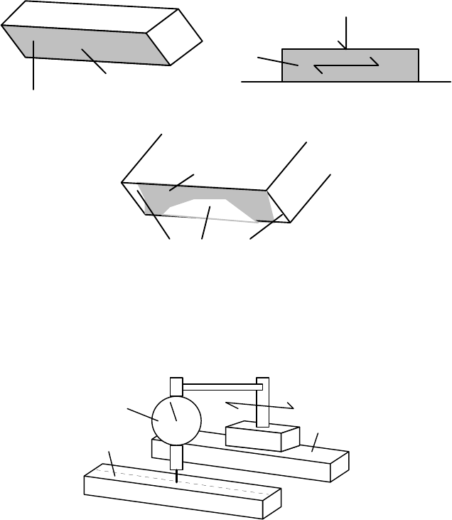 PMC-505 Metrologia na Fabricação Mecânica - CAP 6 MEDIÇÃO DE PERFÍS GEOMÉTRICOS 6-1 Capítulo 6 Medição de Precisão de Forma • retilinidade (retitude, straightness) • planicidade (planeza, flatness) • circularidade (redondeza, roundness, circularity) Fundamental importância para o bom funcionamento dos próprios instrumentos de medição e das máquinas ferramentas. 6.1 Retilinidade e Planicidade • Pode provocar erro na linearidade do movimento de guias. • A acuracidade de muitos dispositivos de medição depende do movimento de um apalpador ou uma agulha sobre uma linha reta. Se a superfície datum (referência) não for suficientemente precisa, em termos de retilinidade e planicidade, podem ocorrer sérios erros na medição. • Já com relação às máquinas ferramentas, o movimento da ferramenta cortante em relação à peça, é controlada ao longo de um guia de configuração adequada. Porisso, toda a imprecisão do guia será transferida à peça. A seguir serão explicados os diversos tipos de medição destes itens de precisão geométrica. (1) Medição Comparativa O método consiste em se utilizar réguas e desempenos como datum, com o qual se faz uma comparação, daí o termo medição comparativa, da peça em questão. A figura abaixo ilustra um exemplo de medição feita na fabricação de desempenos. Primeiramente se pinta a superfície a ser medida com azul de prússia. Em seguida esfrega-se a superfície pintada contra um desempeno aplicando uma leve pressão. Em seguida observa-se a superfície pintada e verifica-se onde a tinta foi removida e onde a tinta permaneceu. Os primeiros indicam locais mais salientes enquanto os segundos, os locais mais baixos. No caso da fabricação de desempeno, raspa-se os locais onde a tinta foi removida e em seguida repete-se a medição. O processo é repetido até que a tinta seja uniformemente removida. superfície a ser testada camada de azul de prússia (I) desempeno ou régua objeto pressionar e esfregar (II) ressaltos reentrâncias (a tinta foi removida) (a tinta permaneceu) (III) Outro exemplo é dado pela figura seguinte, onde a medição já não é feita com o uso tinta, mas um relógio comparador. O relógio é conectado a uma base que desliza sobre um desempeno ou uma régua. A superfície a ser medida é colocada de forma que o apalpador do relógio toque na mesma. Em seguida, movimenta-se a base do relógio e faz-se a leitura no relógio. Se a linha média ou o plano médio da superfície objeto estiver paralelo à referência, toda deflexão do relógio indicará o erro de retilinidade ou de planicidade. régua ou desempeno superfície a ser medida relógio comparador (2) Medição direta PMC-505 Metrologia na Fabricação Mecânica - CAP 6 MEDIÇÃO DE PERFÍS GEOMÉTRICOS 6-2 Utilização de: nível de precisão, nível eletrônico, autocolimador, interferômetro a laser. O método para a medição de retilinidade ou de planicidade é o mesmo para qualquer instrumento. Consiste em medir a inclinação de um carro dotado de dois apoios enquanto o mesmo é deslocado ao longo da reta ou da superfície que se deseja medir, de um espaço constante. d d d d θ0 θ2 θ3 θ4 θ1 =0 ...... Superfície ou reta a ser medida Carro com o medidor Dessa forma são obtidos dados relativos à posição do carro e da inclinação. Com base nestes dados reconstrói-se a reta ou o plano medido. A avaliação numérica da retilinidade ou da planicidade é feita então, calculando-se uma reta média ou um plano médio, conforme explicado abaixo e, identificando o maior desvio àcima e abaixo da reta ou plano médio. A retilinidade ou a planicidade será a soma do módulo dos dois desvios. O grande problema deste método é referente ao erro de medição, que se acumula e aumenta de tamanho do início ao final da medição. Além disso, mesmo supondo que haja erro somente somente na medição de θ0 , o seu efeito em termos de desvio relativo à reta média crescerá proporcionalmente à distância do ponto 0. Ou seja, o erro na posição 2 será o dobro daquela calculada para a posição 1 e assim por diante. A reta média ou a linha de mínimos quadrados (linha datum) é a linha que passa pela centróide ( , )x y , com inclinação: a x y xm m m= ∑ ∑/ 2 , onde x ym m, são os desvios respectivamente com relação a x y, . Já o plano de mínimos quadrados (plano datum) é o plano dado na forma z=z0+ax+by, que passa pela centróide ( , , )x y z , com inclinação a y x z x y y z x y y z m m m m m m m m m m m = − − ∑ ∑ ∑ ∑ ∑ ∑∑ 2 2 2 2( ) e b x y z x y x z x y x y m m m m m m m m m m m = − − ∑ ∑ ∑ ∑ ∑ ∑∑ 2 2 2 2( ) (3) Medição Indireta São métodos em que os resultados relativos à retilinidade ou à planicidade não são obtidos diretamente na medição, mas por meio de processamento matemático dos mesmos. (a) MÉTODO DAS TRÊS PLACAS Trata-se de um método para a fabricação de desempenos sem a necessidade de nenhum tipo de referência (datum). Nela é empregado um método de medição que é a forma originária do método da reversão, que é discutido mais adiante. A B C A B A B (I) A C A C (II) B B C (III) C Aqui, três placas A, B e C, são fabricadas com alguma máquina de usinagem e neste momento conterão erros de planicidade conforme a figura mostra. Estes erros podem ser quaisquer. Primeiramente as placas A e B são sobrepostas e com o uso de azul de prússia e as diferenças de forma entre A e B são constatadas. Feito isso, PMC-505 Metrologia na Fabricação Mecânica - CAP 6 MEDIÇÃO DE PERFÍS GEOMÉTRICOS 6-3 somente as partes salientes da placa B são removidas por meio de rasqueteamento. O processo de medição e rasqueteamento é repetido até que a forma de B coincida perfeitamente com a de A. Em seguida é feito o mesmo com A e C. Por final, as placas B e C são sobrepostas e as diferenças constatadas com o uso do azul de prússia, só que desta vez, o