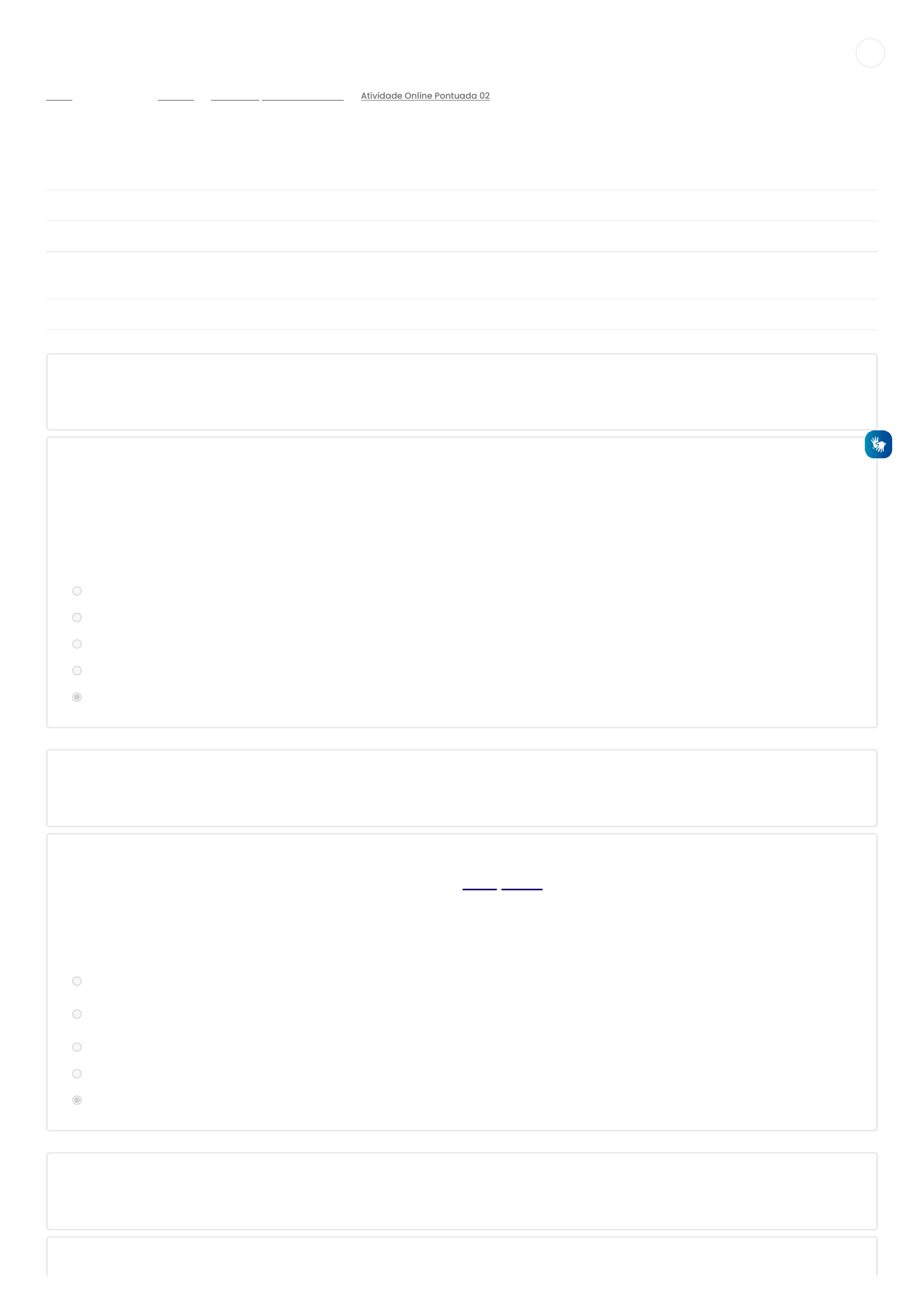 16/09/2022 20:42 Atividade Online Pontuada 02: Revisão da tentativa https://ceadgraduacao.uvv.br/mod/quiz/review.php?attempt=22821&cmid=51982 1/3 - Meus cursos - - - Painel Biofísica Atividades pontuadas & Notas Atividade Online Pontuada 02 Iniciado em sexta, 16 set 2022, 20:07 Estado Finalizada Concluída em sexta, 16 set 2022, 20:33 Tempo empregado 26 minutos 19 segundos Avaliar 0,40 de um máximo de 1,00(40%) Questão 1 Completo Atingiu 0,00 de 0,20 A visão nos seres vivos é a sensação criada no cérebro por meio dos olhos em consequência da transformação de fótons de luz em pulso elétrico. O olho humano apresenta superfícies refratoras que iniciam o trajeto da luz no meio externo com o ar finalizando na retina. Assinale a alternativa correta em que indica o caminho em que a luz segue até chegar a retina. Escolha uma opção: a. Coróide, córnea, humor aquoso e humor vítreo. b. Córnea, humor vítreo, cristalino e humor aquoso. c. Córnea, humor aquoso, cristalino e humor vítreo. d. Esclerótica, coróide, córnea, humor aquoso. e. Córnea, cristalino, humor vítreo e retina. Questão 2 Completo Atingiu 0,00 de 0,20 O tímpano ou membrana timpânica, é uma membrana em forma de cone, fina que separa a orelha externa da orelha média e está presente em humanos e outros . Além de funcionar como uma barreira física que separa o meio externo do meio interno, qual das alternativas abaixo apresenta outra função importante desempenhada pelo tímpano? Escolha uma opção: a. Processar as informações elétricas produzidas pela cóclea. b. Captar a energia das ondas sonoras transformando a energia em vibrações que serão transmitidas aos ossículos da orelha média. c. O tímpano é responsável por capturar as ondas sonoras e propagar as ondas sonoras para que sejam processadas pelo cérebro. d. Produzir pulsos elétricos através da transformação da energia das ondas sonoras. e. Direcionar as ondas sonoras da orelha externa para a orelha média. Questão 3 Completo Atingiu 0,20 de 0,20 A orelha humana é um órgão extremamente sensível e especializado para receber sons, cuja função é tetrápodes   https://ceadgraduacao.uvv.br/my/ https://ceadgraduacao.uvv.br/course/view.php?id=10 https://ceadgraduacao.uvv.br/course/view.php?id=10§ion=2 https://ceadgraduacao.uvv.br/mod/quiz/view.php?id=51982 https://pt.wikipedia.org/wiki/Tetr%C3%A1podes 16/09/2022 20:42 Atividade Online Pontuada 02: Revisão da tentativa https://ceadgraduacao.uvv.br/mod/quiz/review.php?attempt=22821&cmid=51982 2/3 converter a onda sonora produzida em um meio externo em estímulos nervosos. O caminho que o estímulo externo percorre no sistema auditivo humano até ser processado é apresentado corretamente em qual alternativa abaixo? Escolha uma opção: a. Tímpano, martelo, bigorna e estribo, tubo auditivo e nervo coclear. b. Tímpano, cavidade timpânica e tubo auditivo. c. Meato acústico externo, tímpano, ossículos da orelha média, cóclea e canais semicirculares e cérebro. d. Orelha externa, tímpano, ossículos temporais, cóclea e canais semicirculares e cérebro. e. Tímpano, martelo, bigorna e estribo, tubo auditivo e nervo vestibular. Questão 4 Completo Atingiu 0,20 de 0,20 Uma sensação que percebemos quando voamos de avião é a pressão percebida nos ouvidos devido a mudança na altitude da aeronave ao longo do percurso. Essa sensação ocorre devido as diferenças de pressão que existe no meio externo e o meio interno da orelha, influenciando o tímpano e trazendo a sensação de incômodo. Uma das formas de mitigar essa sensação é pressionar o nariz com os dedos da mão e pressionar o ar em direção no nariz, resultando no aumento da pressão interna da orelha equilibrando as pressões do meio interno com a do meio externo. Esse equilíbrio entre as pressões do meio interno com o meio externo só é possível devido a presença de qual estrutura no aparelho auditivo? Escolha uma opção: a. Canais semicirculares que coordenam o fluxo da perilinfa estimulando o pulso elétrico e o equilíbrio entre as pressões interna e externa. b. Tímpano, que vibra de acordo com a diferença de pressão e resulta no aumento ou redução da pressão interna. c. Tuba auditiva, que conecta a orelha média a região da faringe. d. Cóclea, que percebe as diferenças de pressão e as equilibra. e. Meato acústico externo, que reduz ou amplia seu diâmetro permitindo maior ou menor passagem do som. Questão 5 Completo Atingiu 0,00 de 0,20 Canto é o ato de produzir sons utilizando a , variando a , intensidade e timbre de acordo com a e o da música. A ação de cantar implica que o som deve seguir um caminho correto até ser percebido pelo aparelho auditivo de outro indivíduo. Assinale a resposta que apresenta o caminho correto da voz e da fala: Escolha uma opção: a. Diafragma, traqueia, laringe, faringe, cavidades nasal e oral e meio externo b. Pulmão, traqueia, faringe, laringe, cavidades nasal e oral e meio externo. c. Pulmão, traqueia, laringe, faringe, cavidades nasal e oral e meio externo. d. Pregas vocais, laringe, cavidades nasal e oral, meio externo. e. Diafragma, pregas vocais, faringe, cavidades nasal e oral, meio externo Terminar revisão musicais voz altura melodia ritmo   https://ceadgraduacao.uvv.br/mod/quiz/view.php?id=51982 https://pt.wikipedia.org/wiki/M%C3%BAsica https://pt.wikipedia.org/wiki/Voz https://pt.wikipedia.org/wiki/Altura_(m%C3%BAsica) https://pt.wikipedia.org/wiki/Melodia https://pt.wikipedia.org/wiki/Ritmo 16/09/2022 20:42 Atividade Online Pontuada 02: Revisão da tentativa https://ceadgraduacao.uvv.br/mod/quiz/review.php?attempt=22821&cmid=51982 3/3 Atividade Online Pontuada 01 Seguir para... Atividade On-line Pontuada 0…    https://ceadgraduacao.uvv.br/mod/quiz/view.php?id=415&forceview=1 https://ceadgraduacao.uvv.br/mod/data/view.php?id=51542&forceview=1