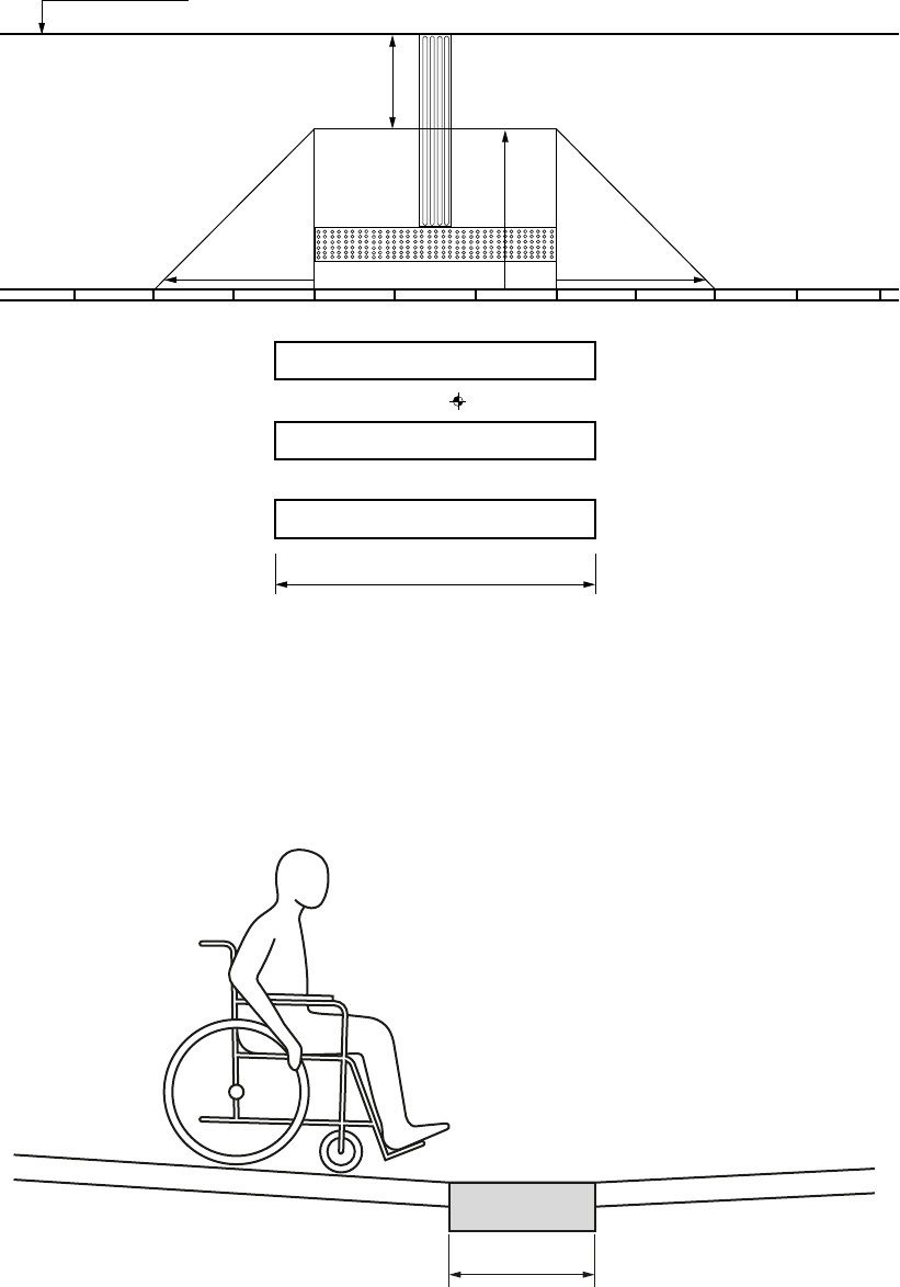 Dimensões em metros 0,0 Via Calçada Alinhamento do imóvel Calçada Comprimento da faixa i ≤ 8,33% i ≤ 8 ,3 3% S ob e i ≤ 8,33% 1 ,2 0 Figura 93 – Rebaixamentos de calçada – Vista superior 6.12.7.3.1 Não pode haver desnível entre o término do rebaixamento da calçada e o leito carroçável. Em vias com inclinação transversal do leito carroçável superior a 5 %, deve ser implantada uma faixa de acomodação de 0,45 m a 0,60 m de largura ao longo da aresta de encontro dos dois planos inclinados em toda a largura do rebaixamento, conforme Figura 94. Dimensões em metros Calçada 8,33 % máx. 5 % máx. Via 0,45 a 0,60 Figura 94 – Faixa de acomodação para travessia – Corte 6.12.7.3.2 A largura da rampa central dos rebaixamentos deve ser de no mínimo 1,50 m. Recomenda-se, sempre que possível, que a largura seja igual ao comprimento das faixas de travessia de pedestres. Os rebaixamentos em ambos os lados devem ser alinhados entre si. 80 ABNT NBR 9050:2015 © ABNT 2015 - Todos os direitos reservados